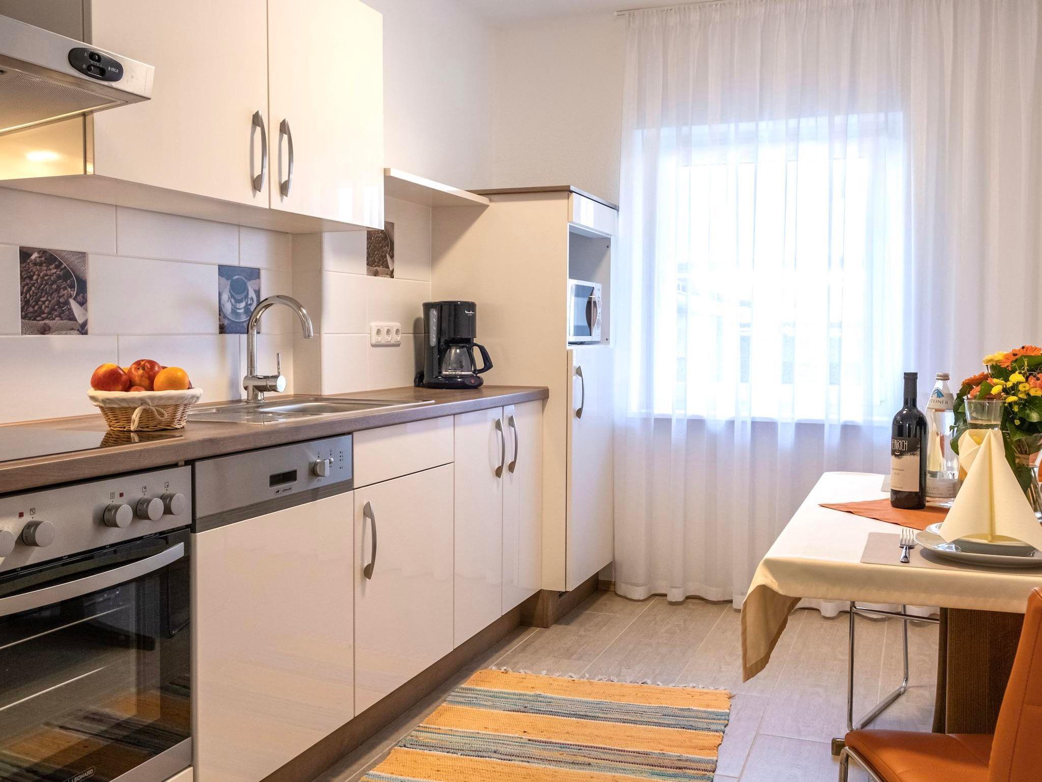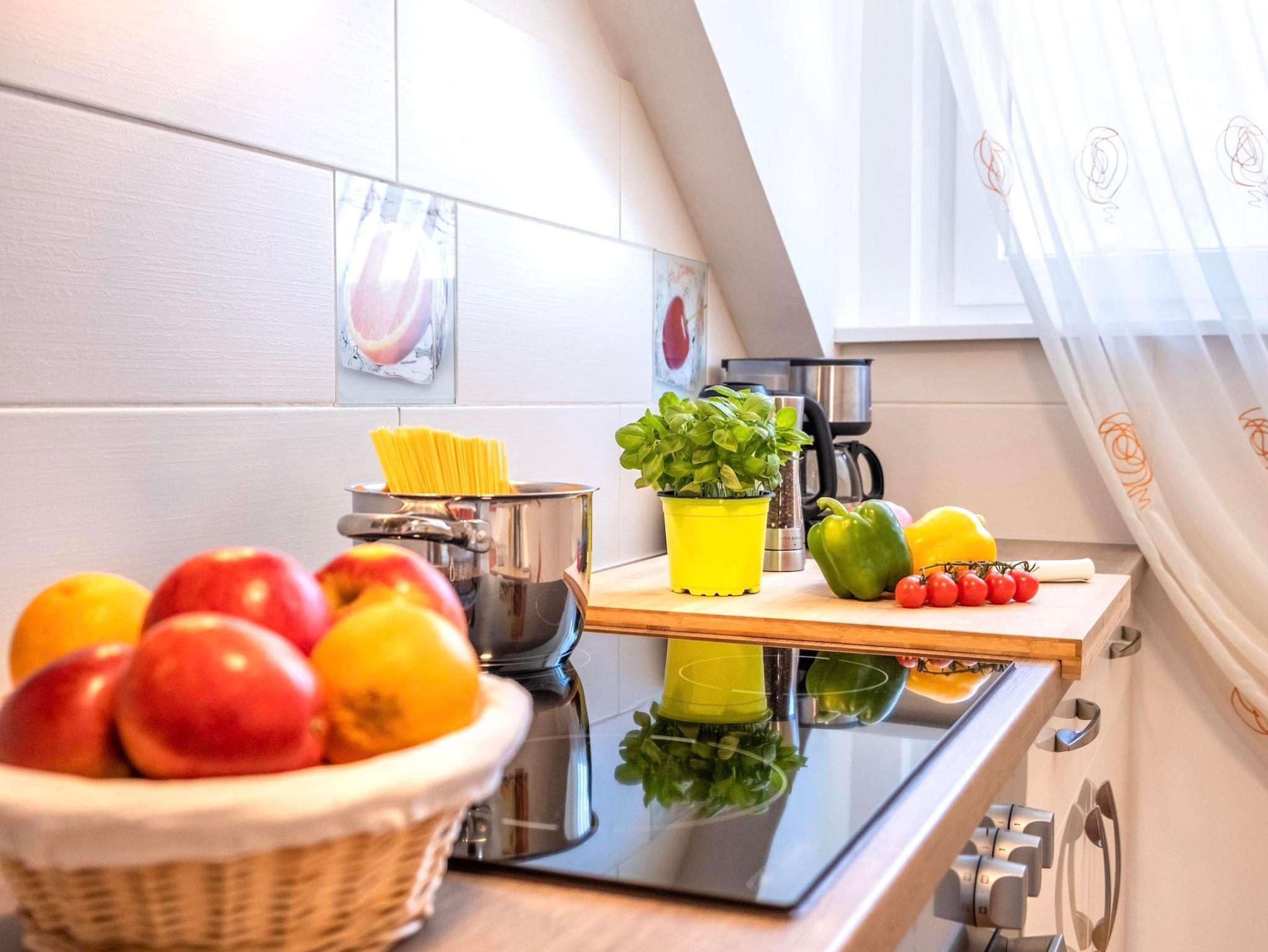 Die Ferienwohnung bietet ein Schlafzimmer mit einem Kingsize-Doppelbett, eine komplett ausgestattete Küche mit allen nötigen Kochutensilien (inkl. Mikrowelle, Backofen, Wasserkocher, Geschirrspüler, Kaffeemaschine), sowie ein eigenes Badezimmer mit einer Duschkabine, Handtuchtrockner und Föhn.