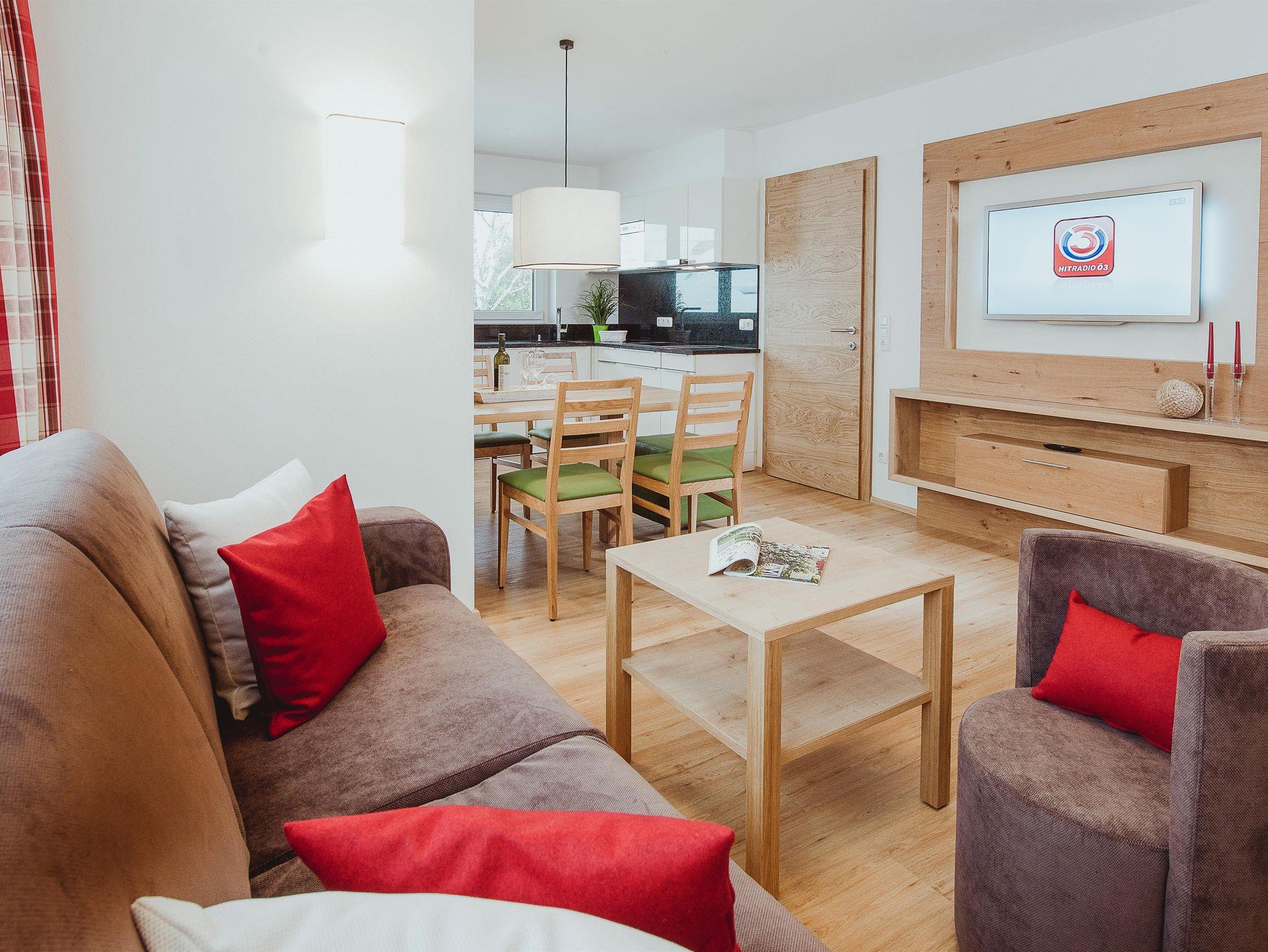 Appartement Alpenrose | 4 Personen, 60 m² . Offener Wohn-, Küche- & Essbereich, Wohnbereich mit Flatscreen Kabel TV, Sitzgruppe, Voll ausgestattete Küche, 2 getrennte Schlafzimmer jeweils mit Flatscreen Kabel TV,Kostenloser WLAN-Internetzugang, Bad (Haarfön, Handtuchheizung), Ski- und Schuhraum, 1 Parkplatz, Kleiderschrank mit Safe