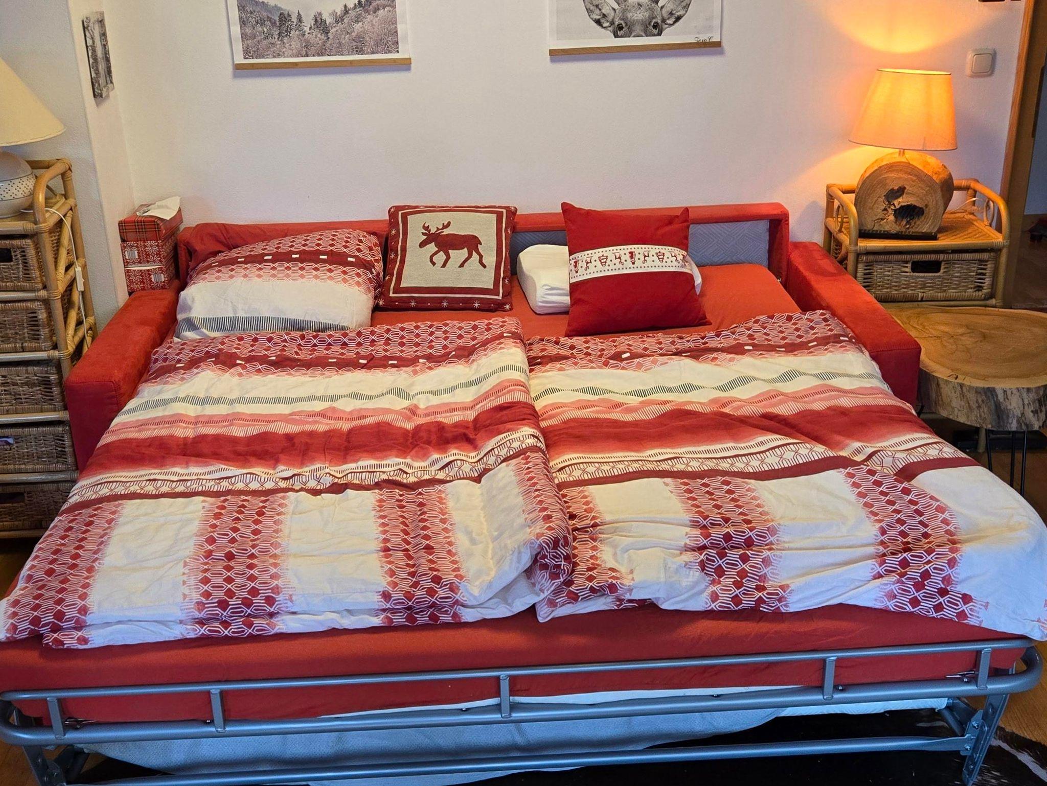 Die 50 Quadratmeter große Unterkunft bietet Platz für bis zu 4 Gäste. Du findest ein gemütliches Schlafzimmer mit einem Doppelbett sowie eine Schlafcouch für 2 Personen im Wohnzimmer. Die Unterkunft verfügt über ein separates Bad, eine gemeinsame Küche und ein gemeinsames Wohnzimmer, in dem Du dich entspannen kannst. Besonders schön ist der große Garten mit einer überdachten Loggia, die dir viel Raum für Erholung im Freien bietet. Perfekt für einen entspannten Aufenthalt mit Familie oder Freunden.