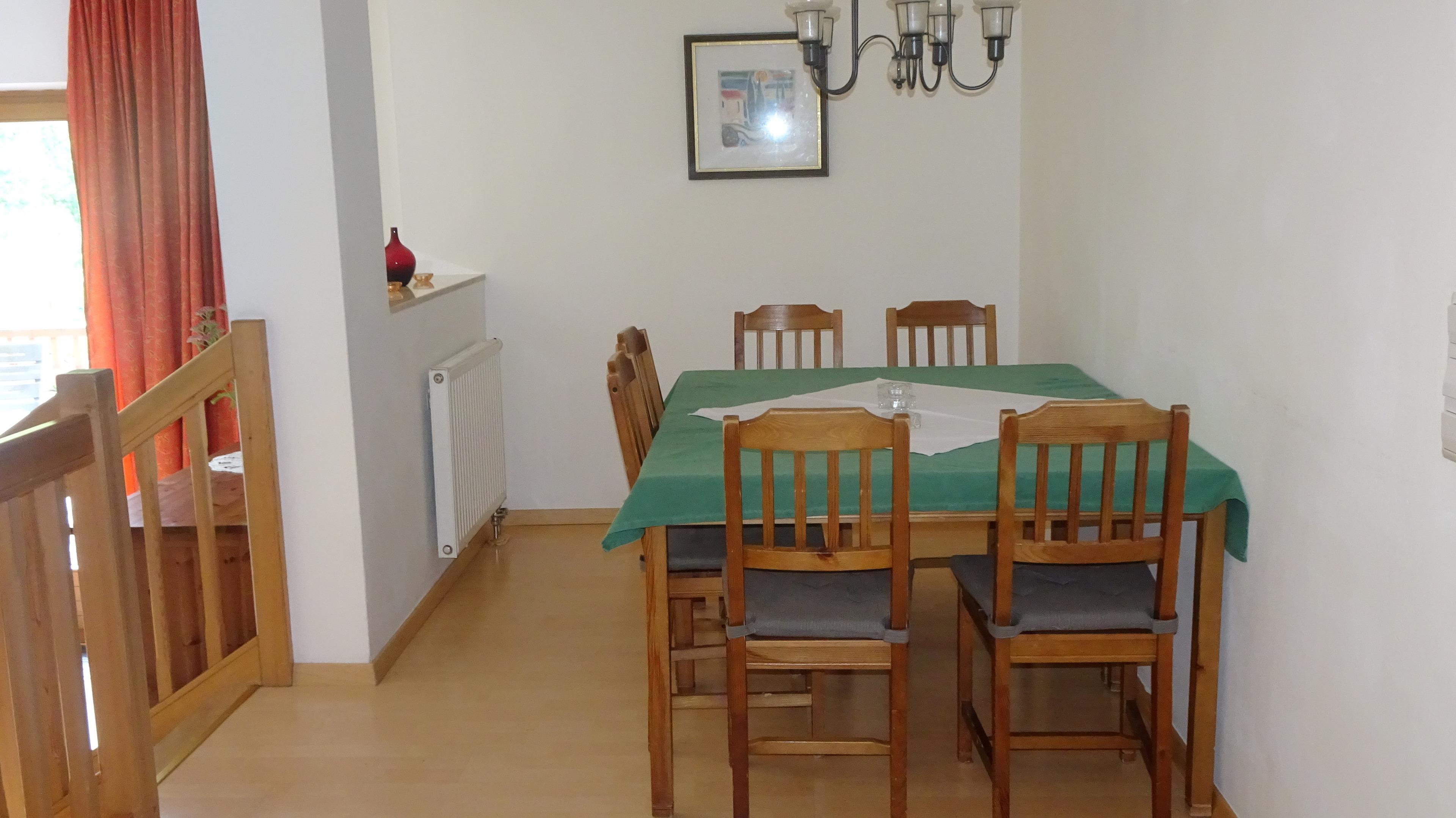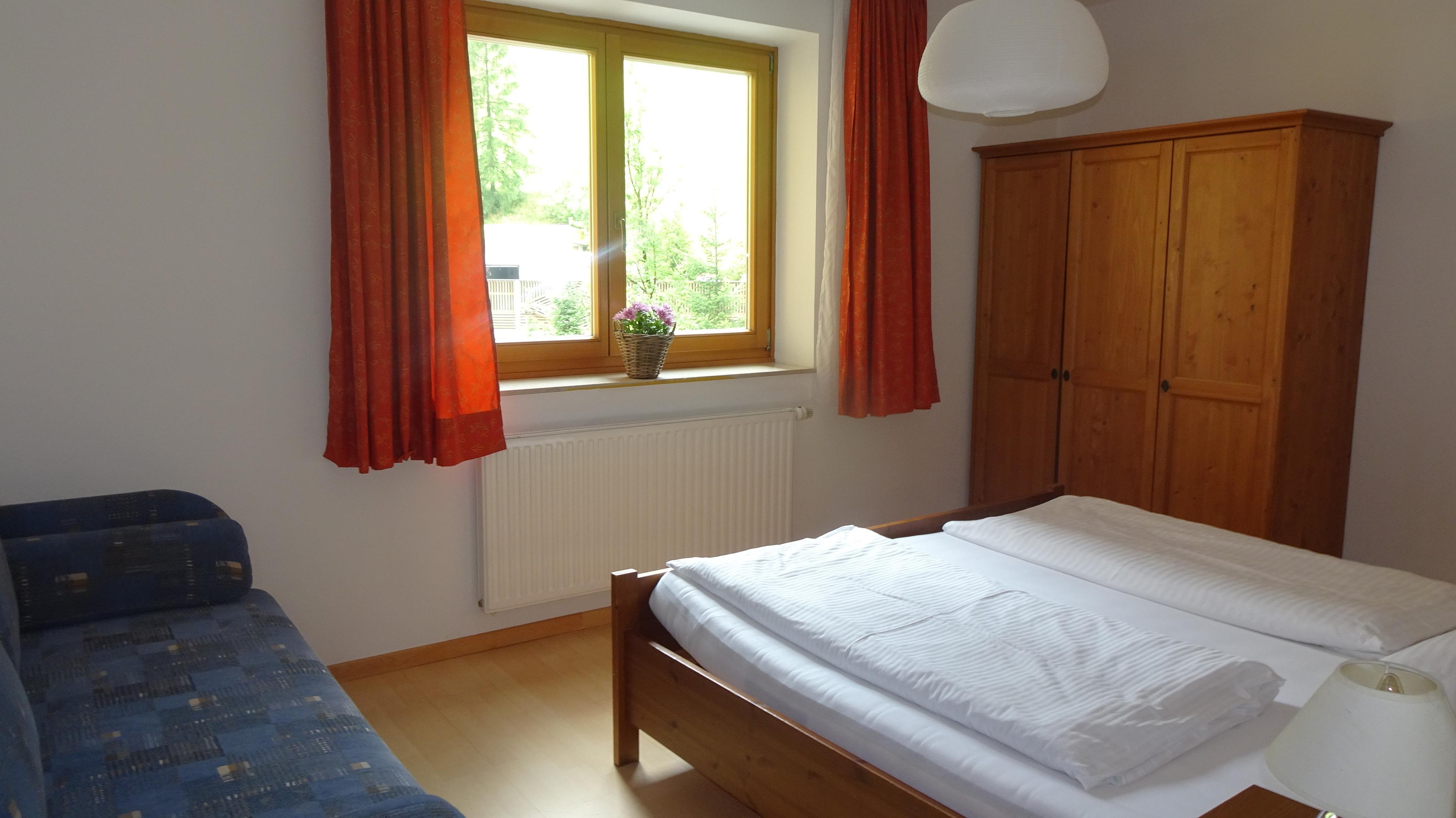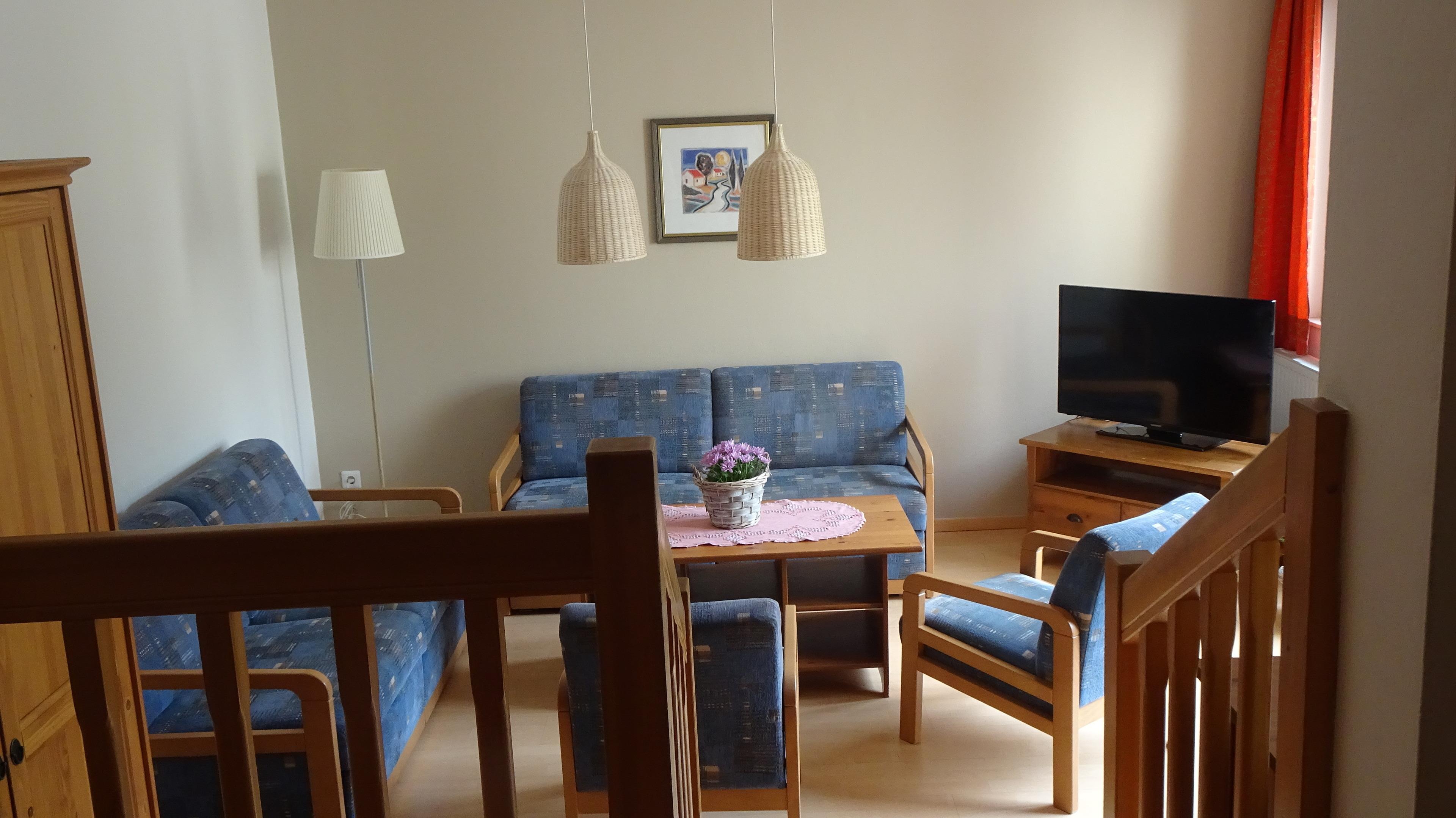 Das Apartment hat einen eigenen Wohnraum mit gut ausgestatteter Kochnische, ein Schlafraum mit einem Doppelbett, ein zweiter Schlafraum einem Doppelbett und einer Schlafsofa, ein Bad mit Badewanne/WC, ein WC extra. Vorraum und Terrasse mit Bergblick.