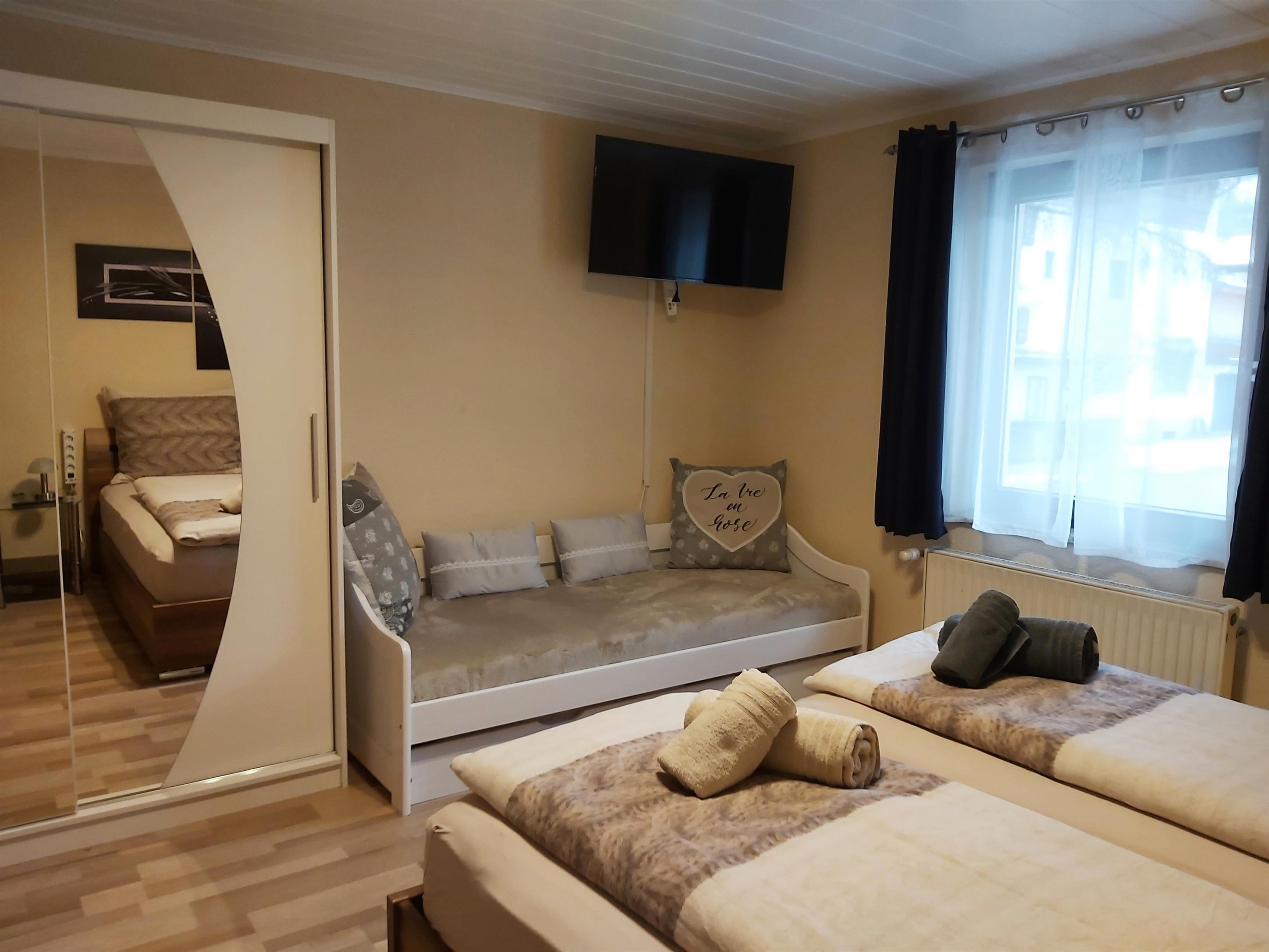 In der Wohnküche finden Sie eine große moderne Küchenzeile mit einer kompletten Ausstattung,Ceranfeld,Backofen,Kühl- Gefrierkombi,Kaffeemaschine,Toaster,Wasserkocher und Mikrowelle. Eine schöne Wohnlandschaft mit Schlafcouch ( 1,40 m breit ), einem großen Essbereich und natürlich einem Fernseher lädt zum verweilen ein.