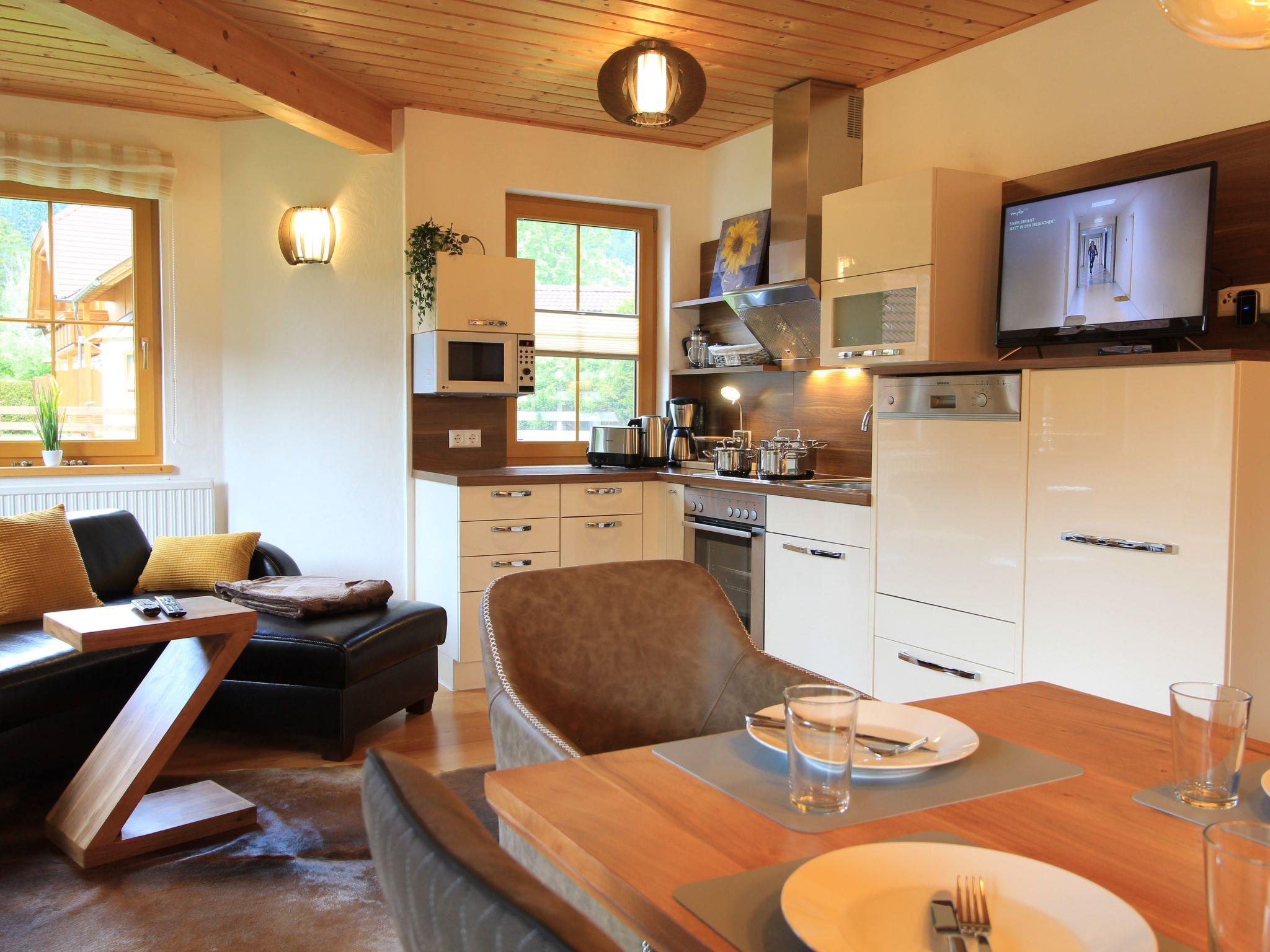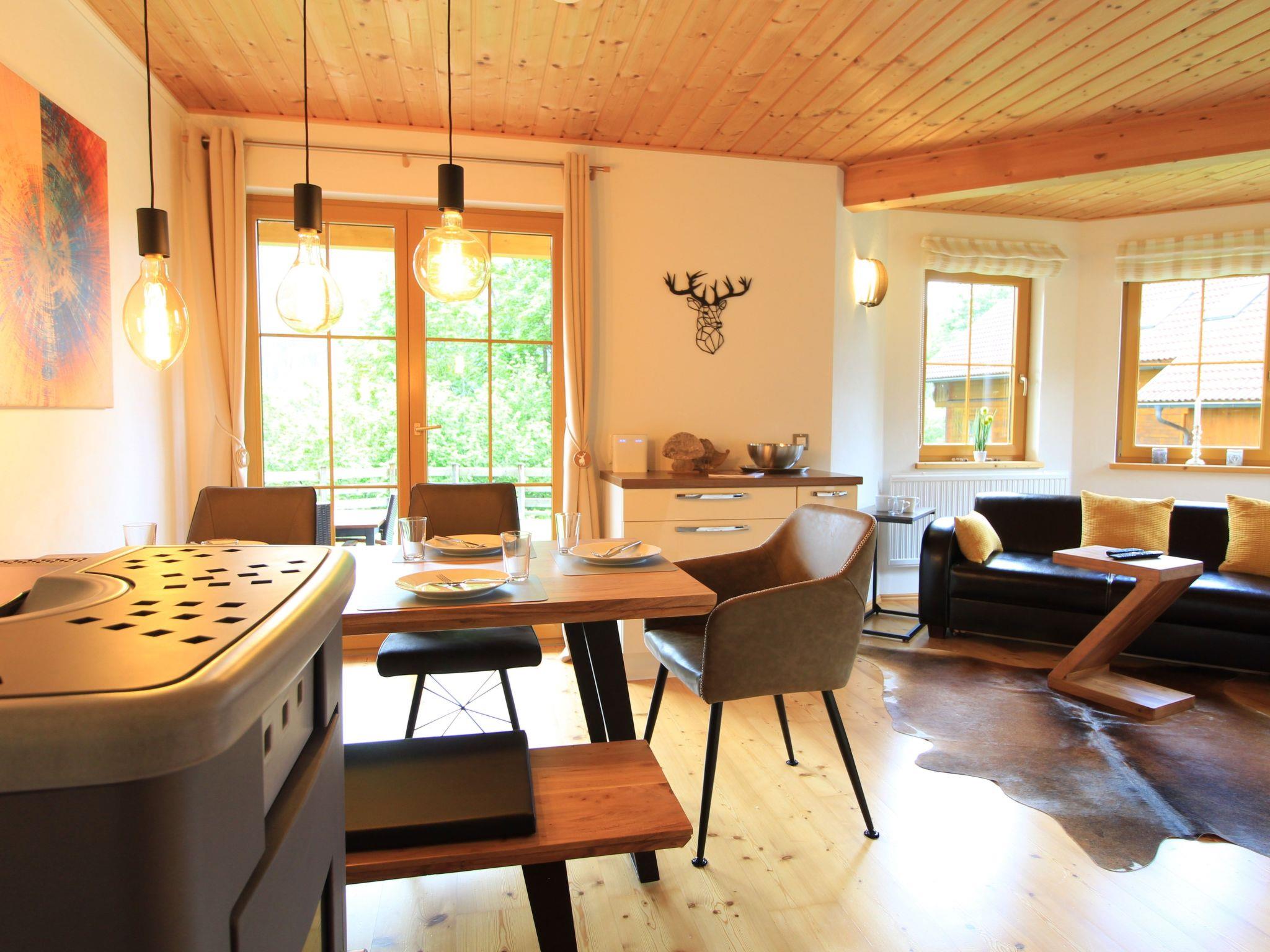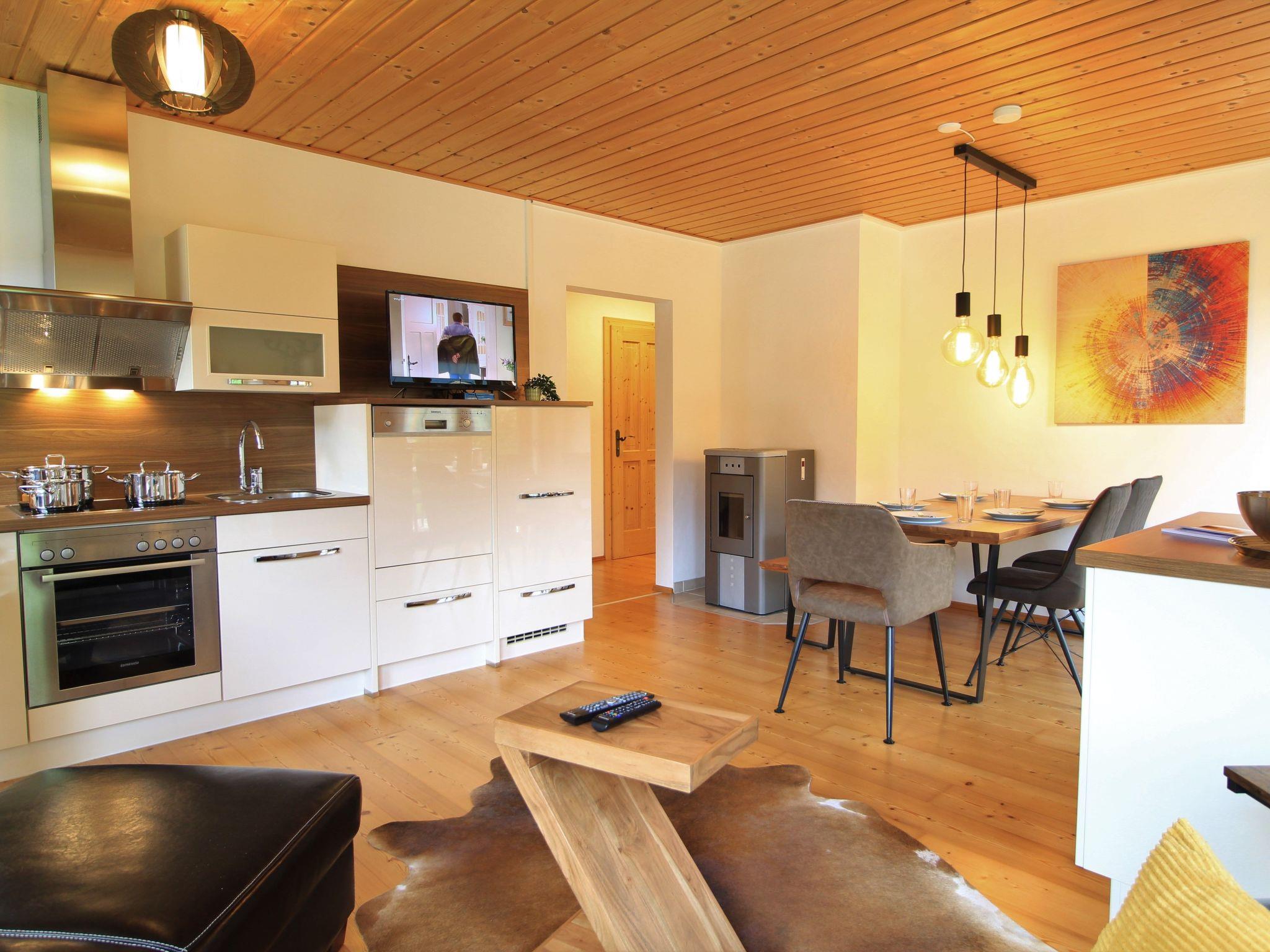 The interior of the flat impresses with two cosy double bedrooms, a complete bathroom with shower and an additional toilet. The large living room, equipped with a sofa bed, offers enough space to relax after an action-packed day. The fully equipped kitchen with oven, dishwasher and pellet stove invites you to cook together.