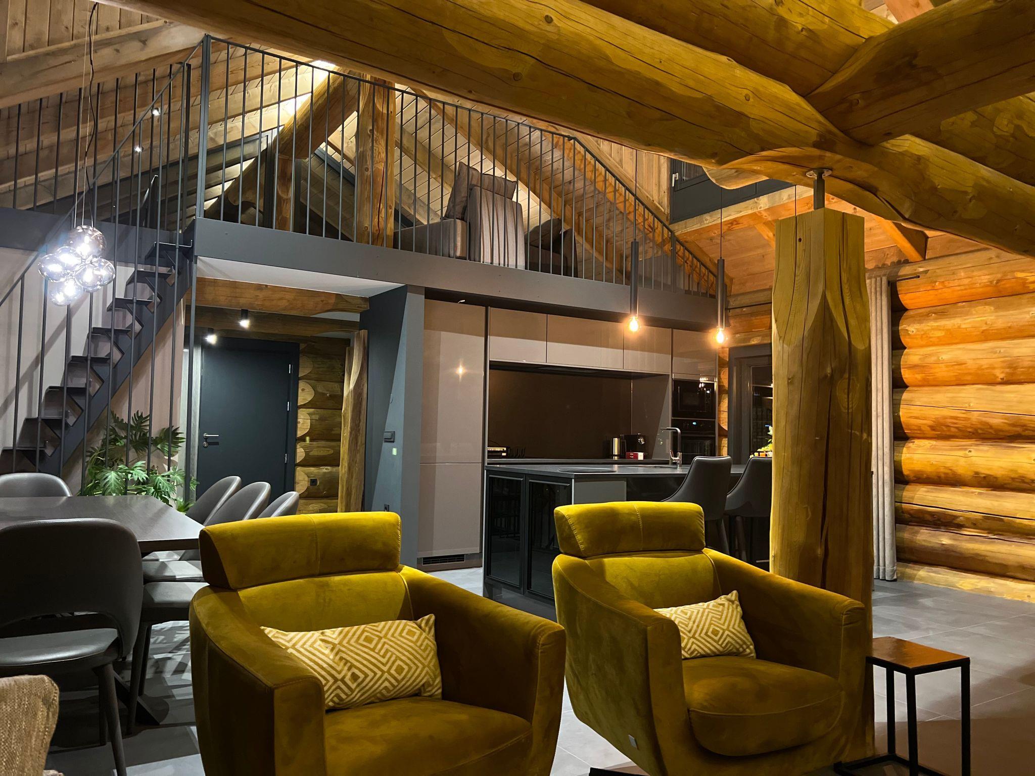 Upstairs is a very large, double high ceiling, living area with wonderfully exposed logs and an open fireplace. The whole floor is surrounded by a large terrace with a town view. There is a fully equipped kitchen with a cosy dining area. The heated ski room is accessible directly from outside and a guests toilet is also located on the same floor.