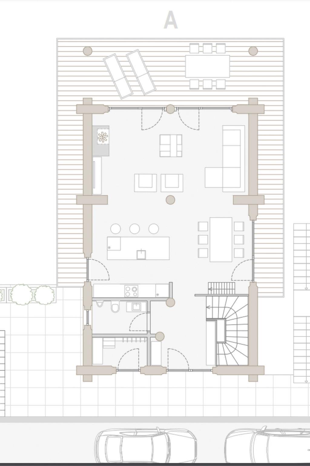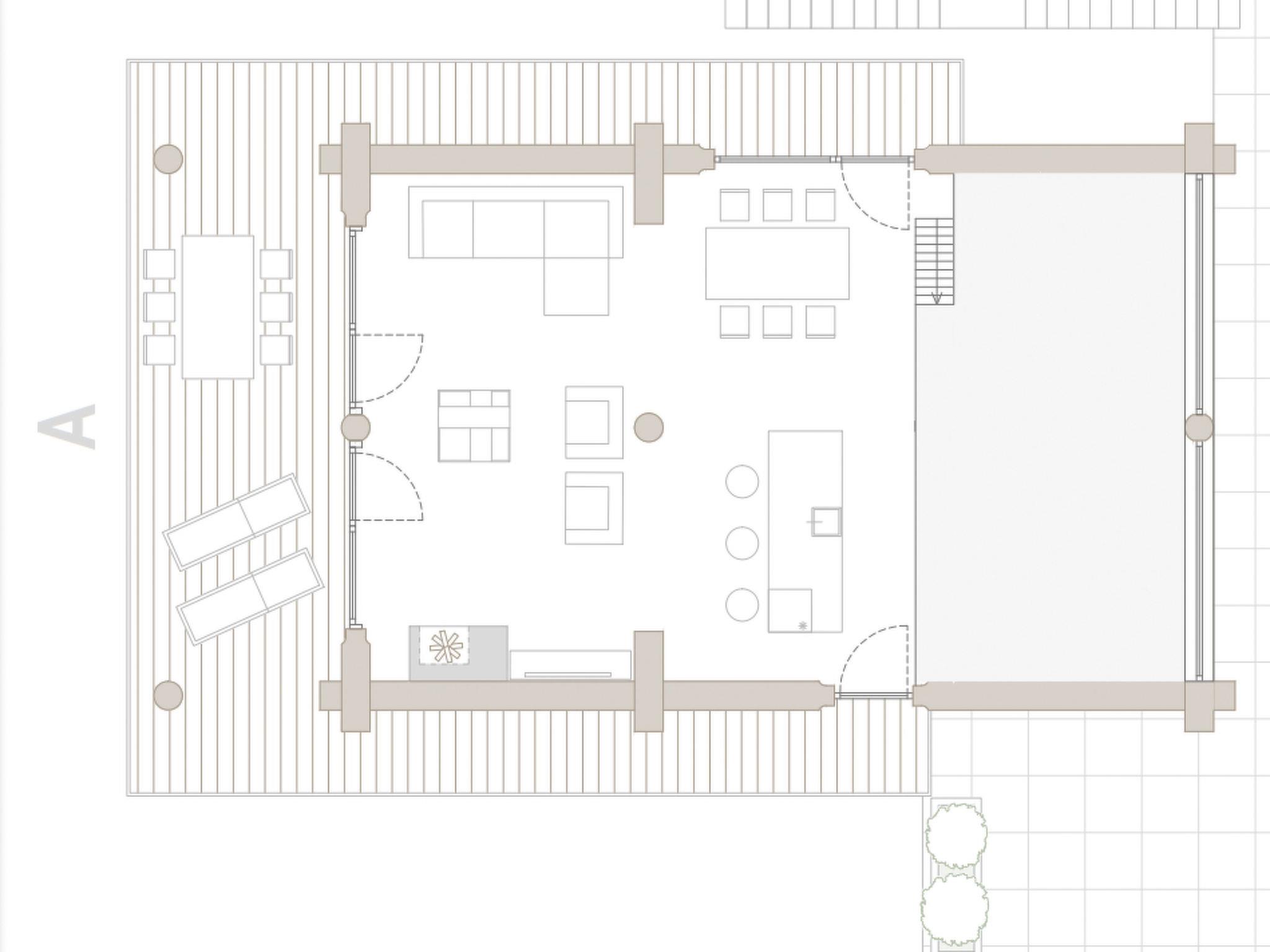 First floor; living / cooking area with a large terrace