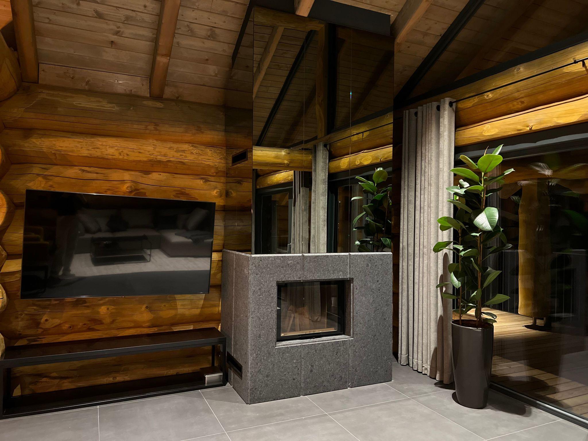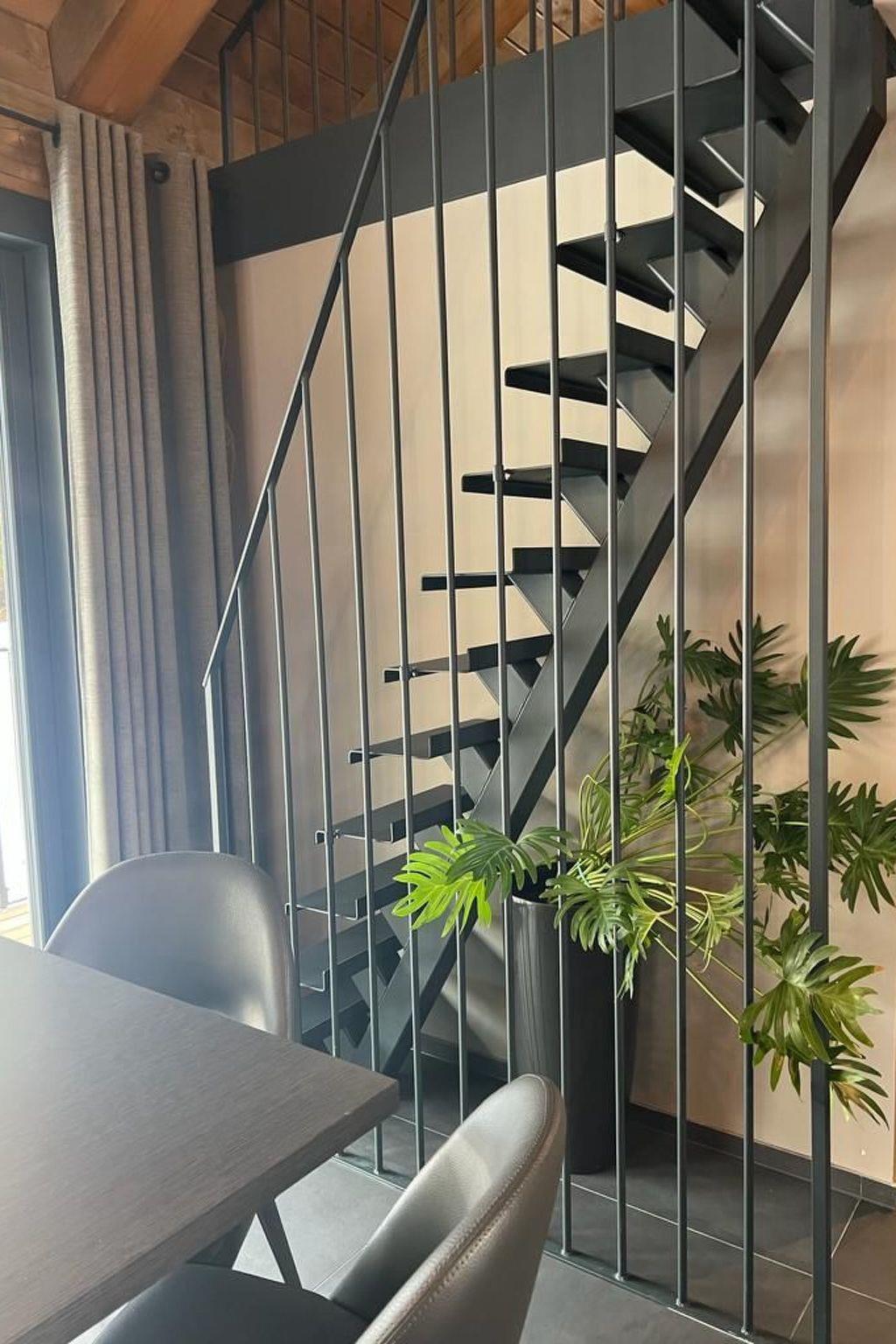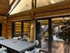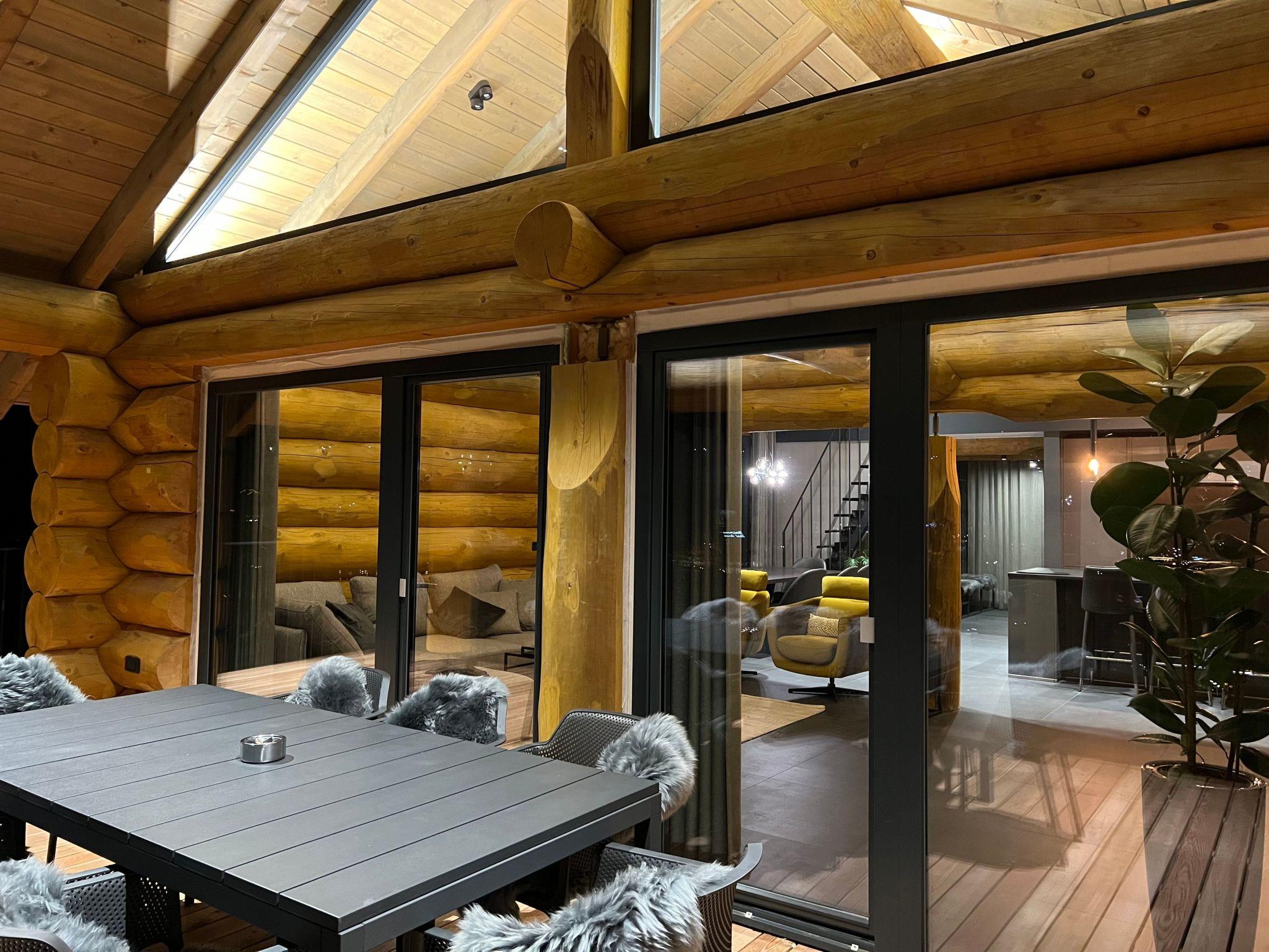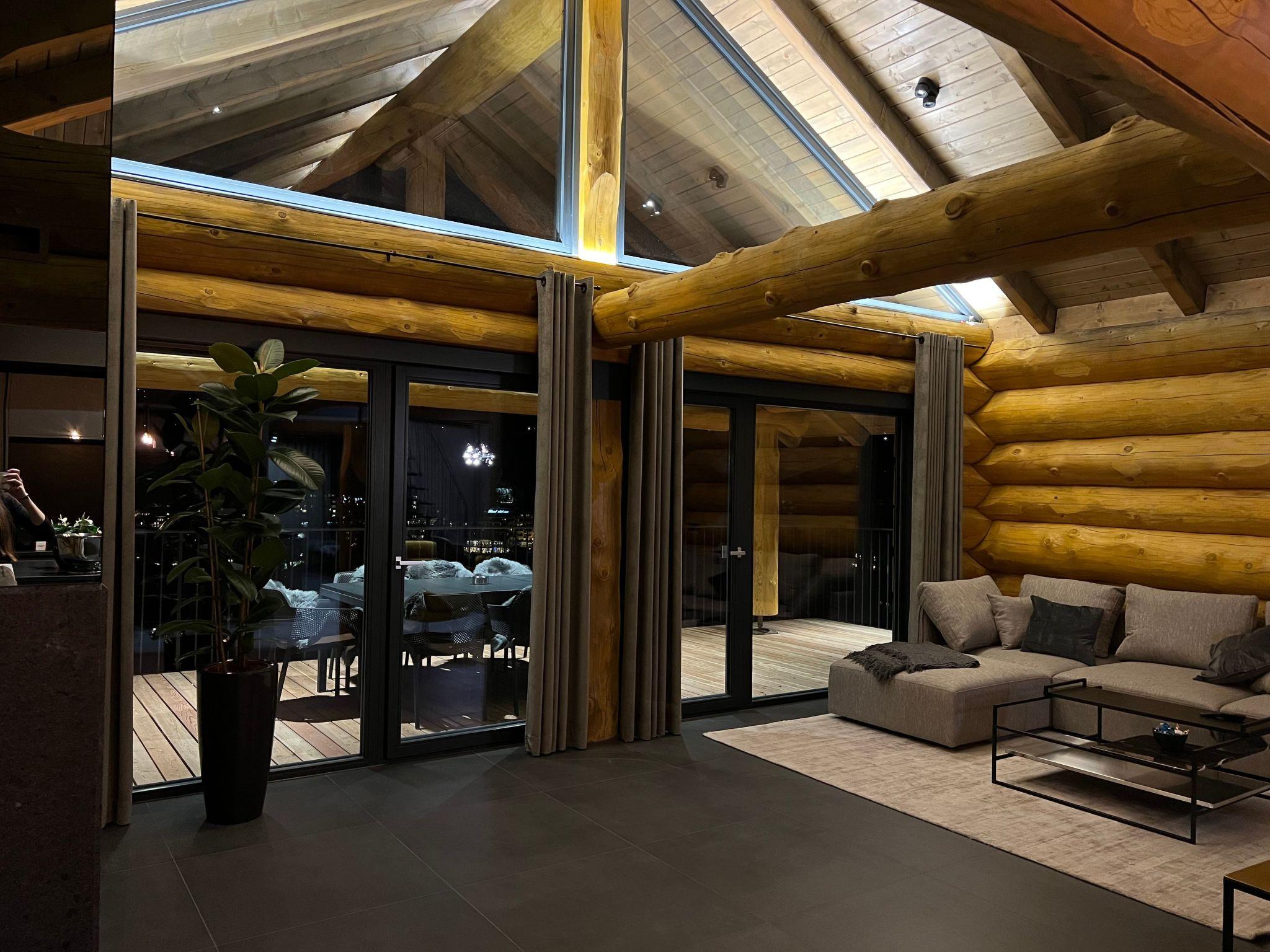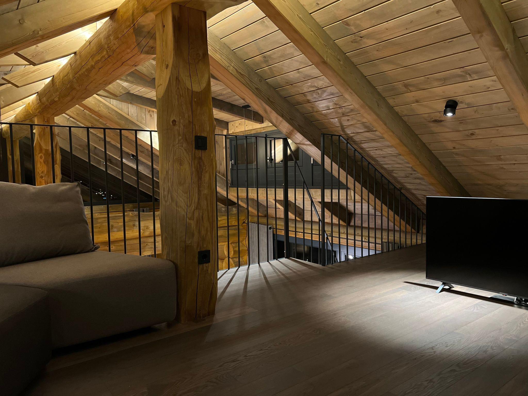 Upstairs is a very large, double high ceiling, living area with wonderfully exposed logs and an open fireplace. The whole floor is surrounded by a large terrace with a town view. There is a fully equipped kitchen with a cosy dining area. The heated ski room is accessible directly from outside and a guests toilet is also located on the same floor.