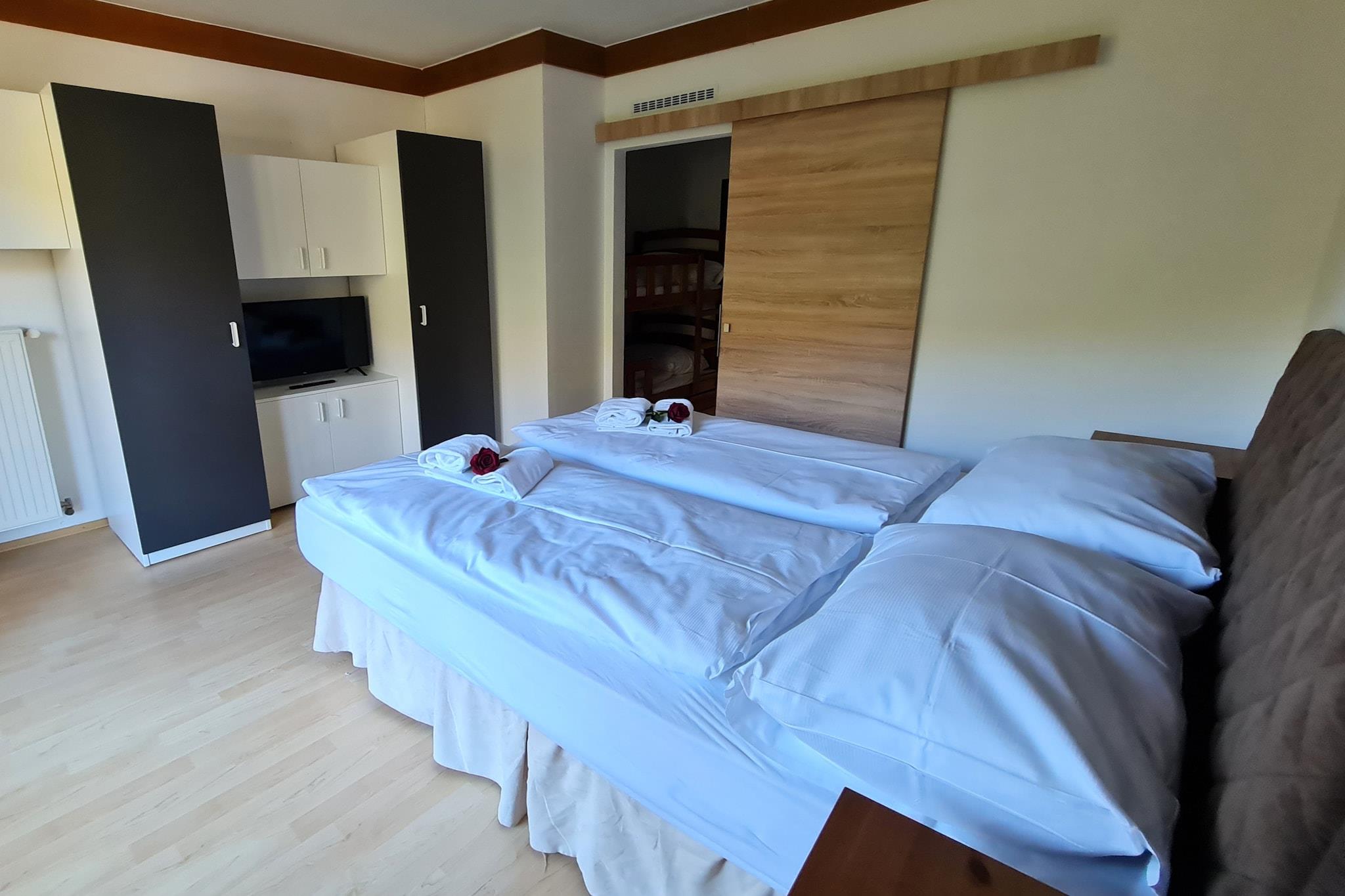 Stue(enkeltsovesofa), Køkken, soveværelse(køjeseng), soveværelse(dobbeltseng), badeværelse(bruser), badeværelse(bruser), Internetadgang, elkedel, kaffemaskine, ovn, mikrobølgeovn, opvaskemaskine , køleskab, fryser, balkon, parkering, føntørrer, Saftpresser,