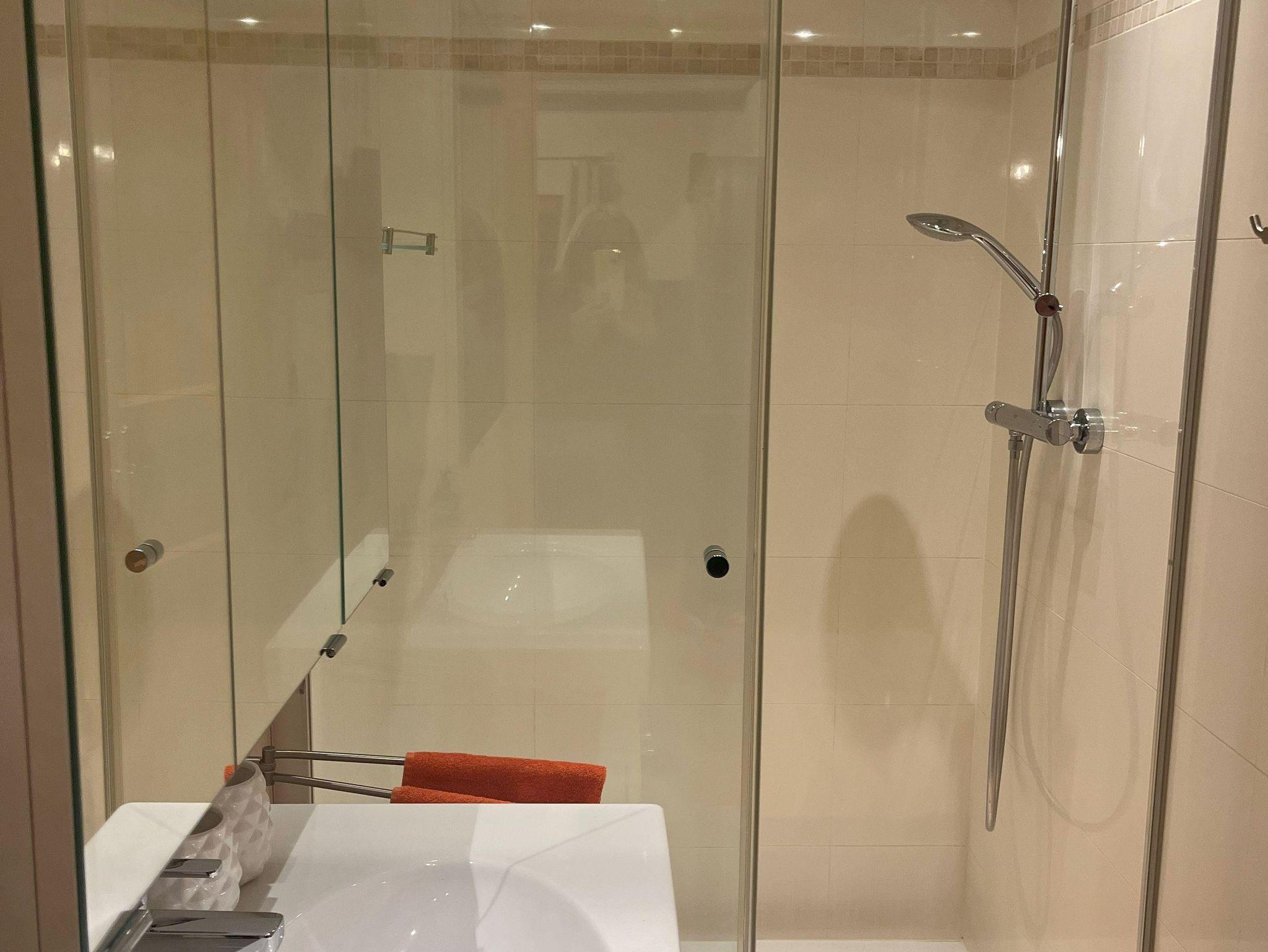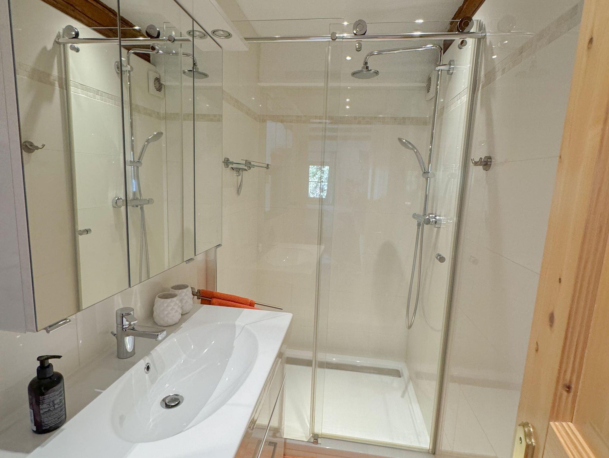 Ein modernes Badezimmer mit Dusche sowie ein separates WC sorgen für zusätzlichen Komfort.