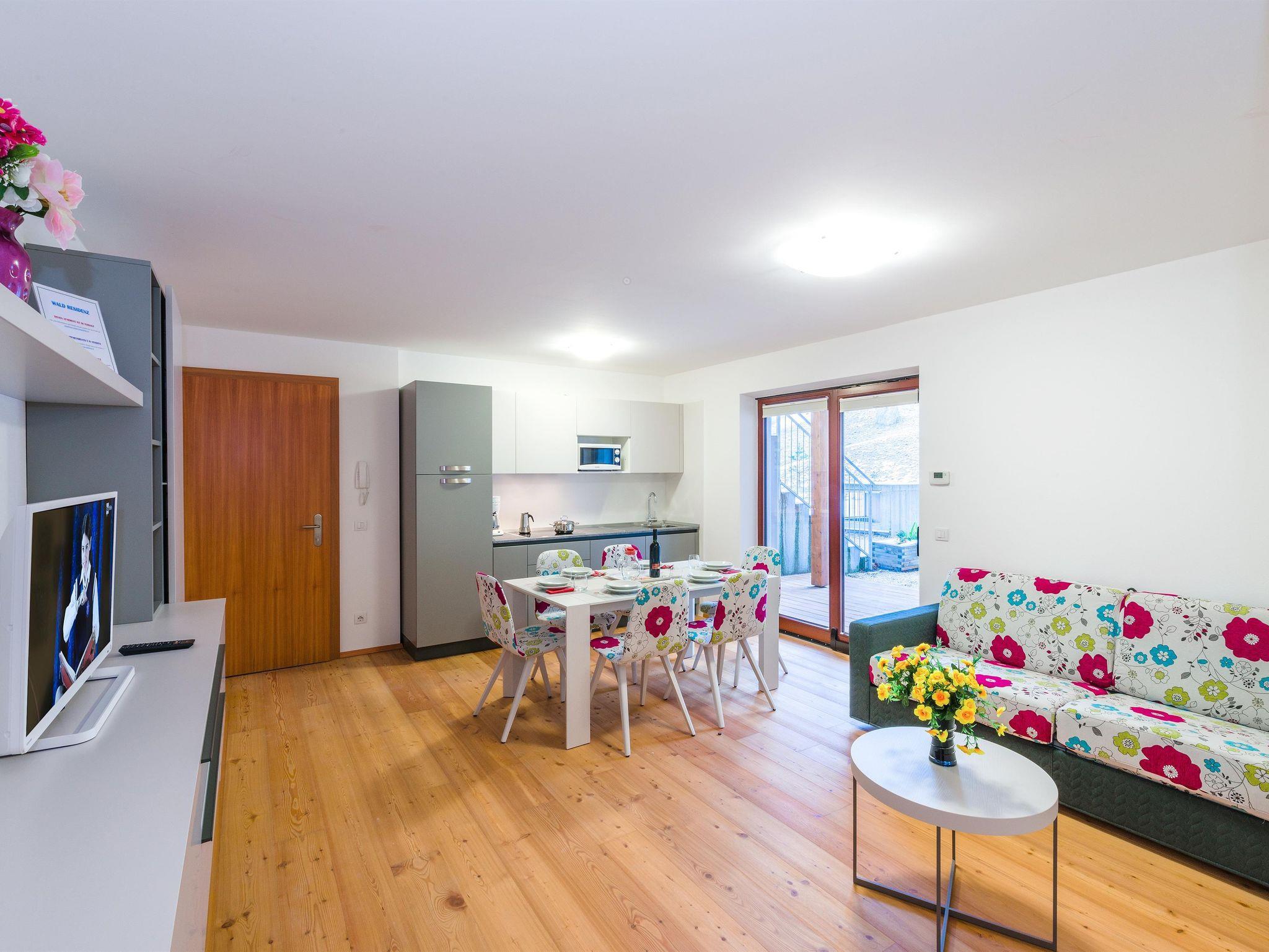Wohnraum/Essraum mit offener Kochnische sowie Doppelschlafcouch und Terrasse im Erdgeschoß, ein Schlafzimmer mit Doppelbett,