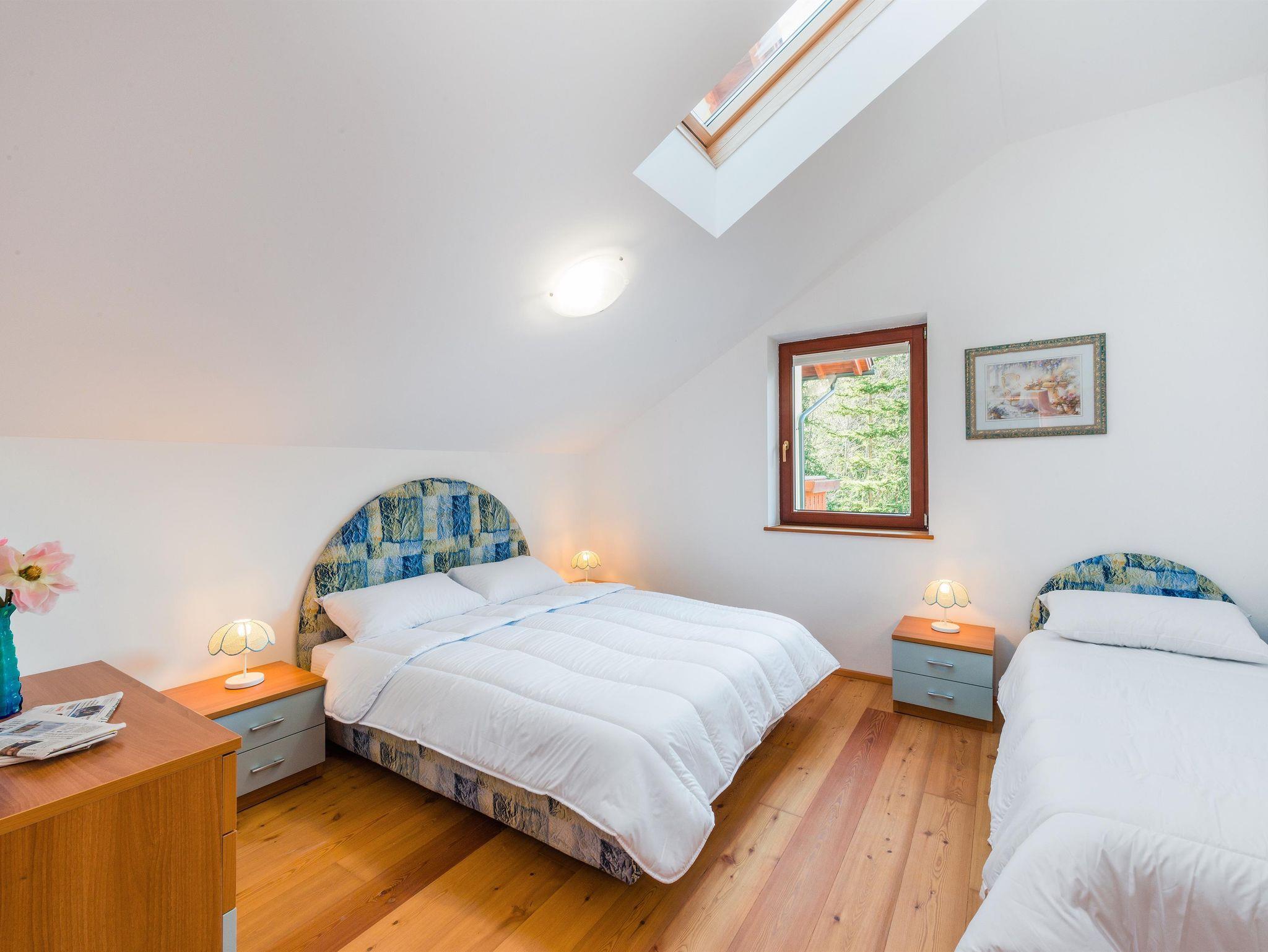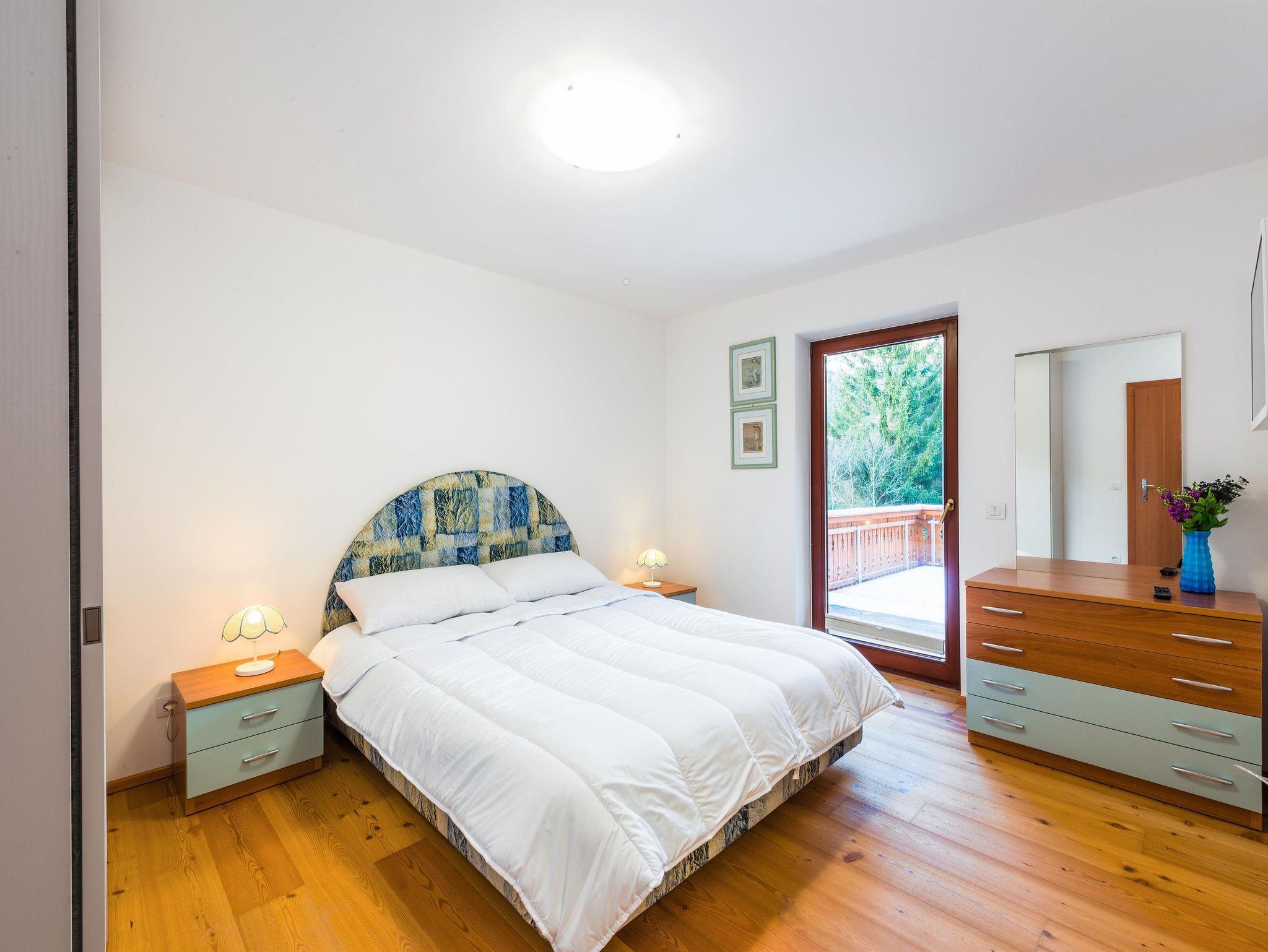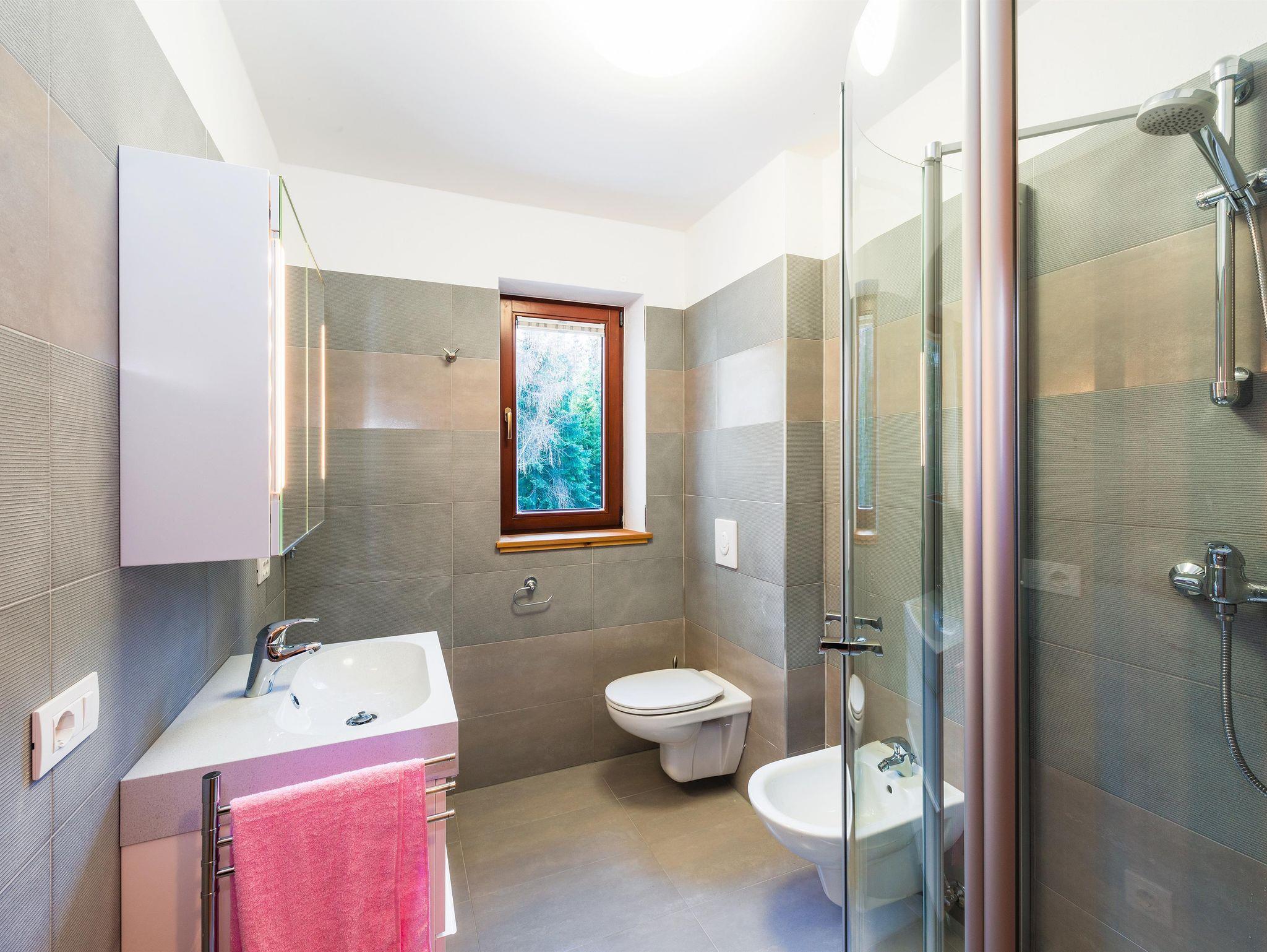 Badezimmer (Dusche/WC/Bidet), ein Schlafzimmer mit Doppelbett und Badezimmer (Dusche/WC/Bidet) im Zimmer und Balkon. Zwei überdachte Autoabstellplätze und einen Schistall.