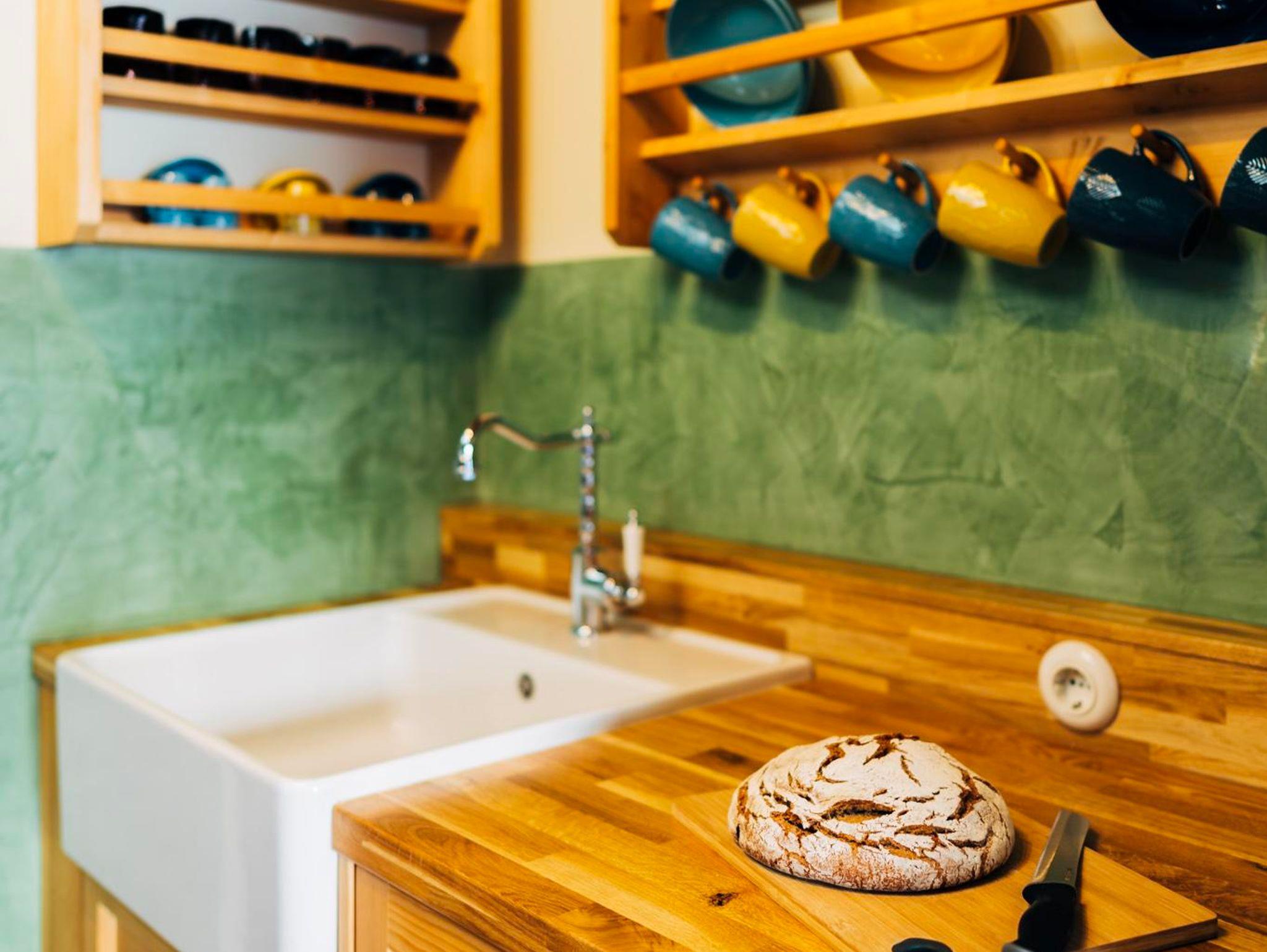 Vorraum mit komplett eingerichteter Küche (inkl. Geschirrspüler, Backofen, Ceranfeld, Kaffeekapselmaschine), gemütlicher Wohn-Essbereich mit Kachelofen, Couch und 1 Doppelbett, 1 kleines Schlafzimmer mit 2 Einzelbetten, Badezimmer mit Dusche und WC.