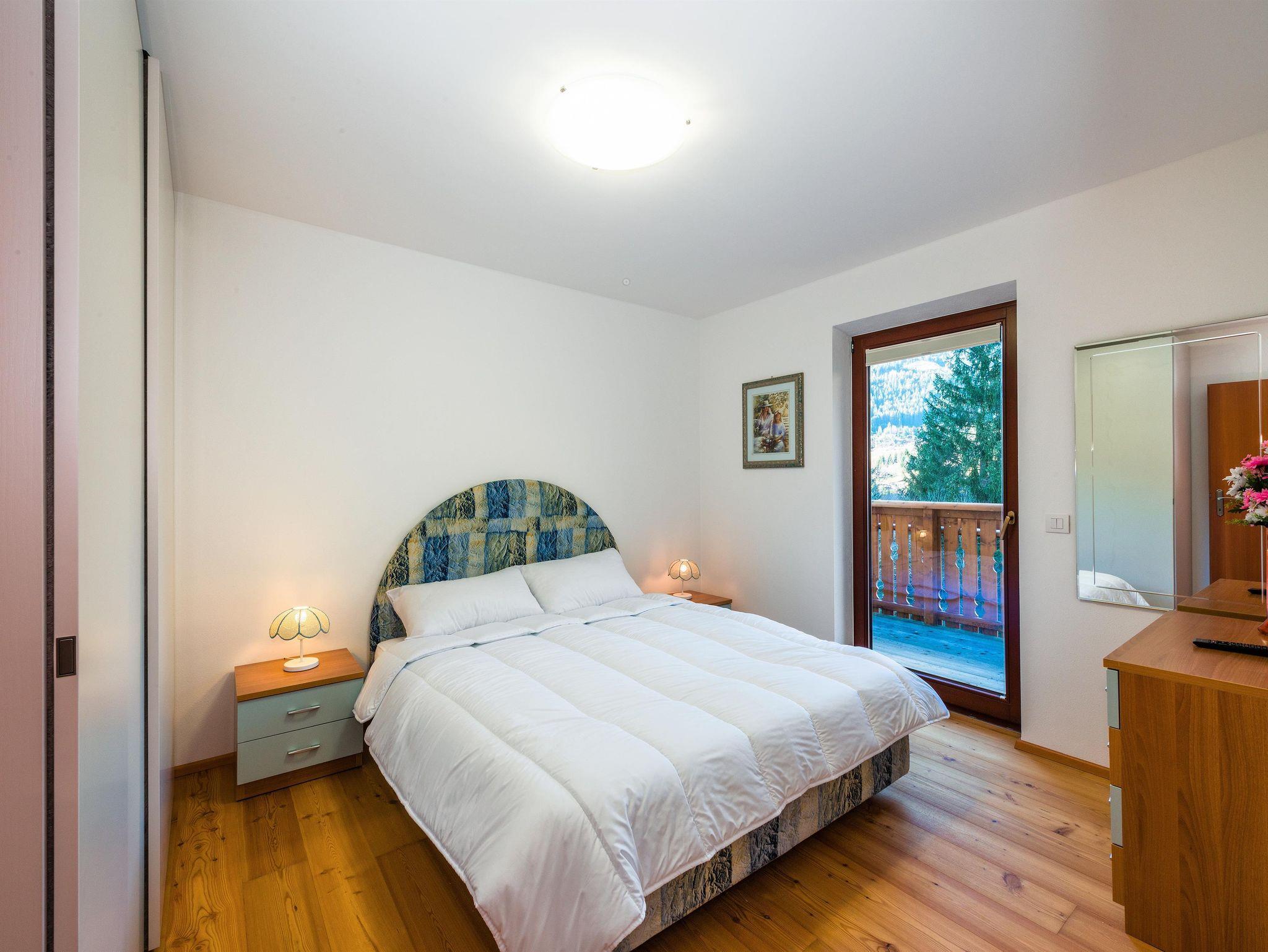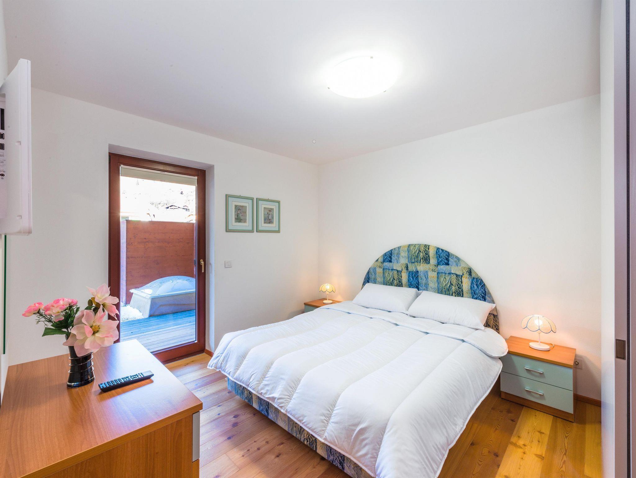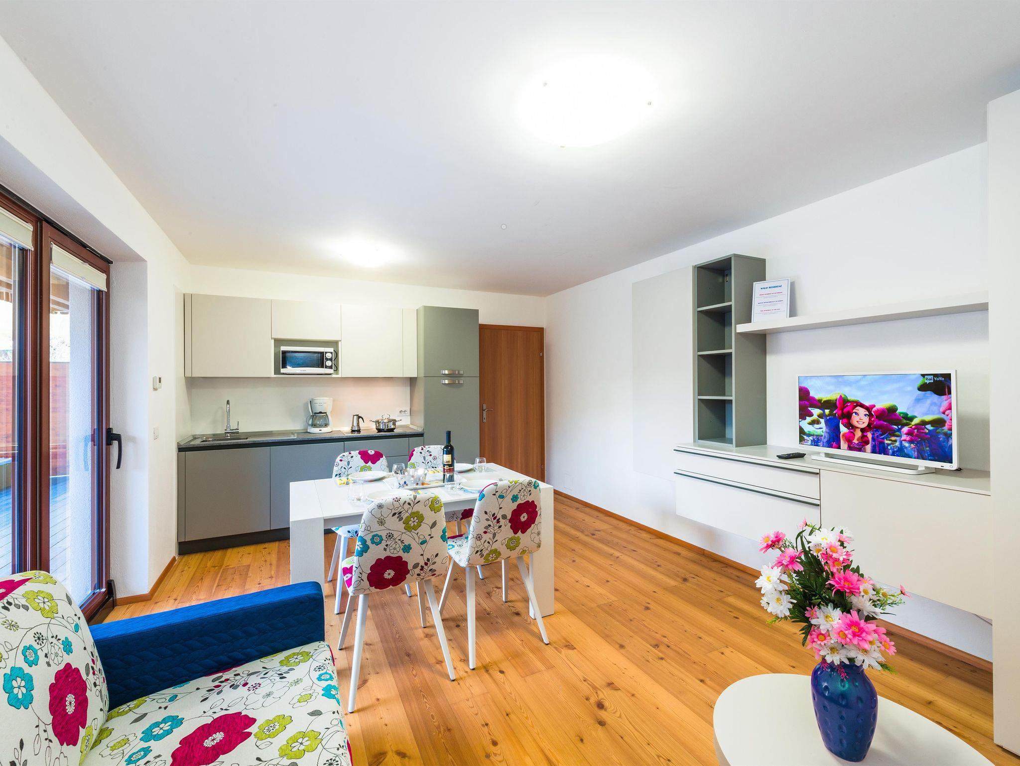 Wohnraum/Essraum mit offener Kochnische sowie Doppelschlafcouch und Balkon, ein Schlafzimmer mit Doppelbett, Badezimmer (Dusche/WC/Bidet) und einen Schistall.