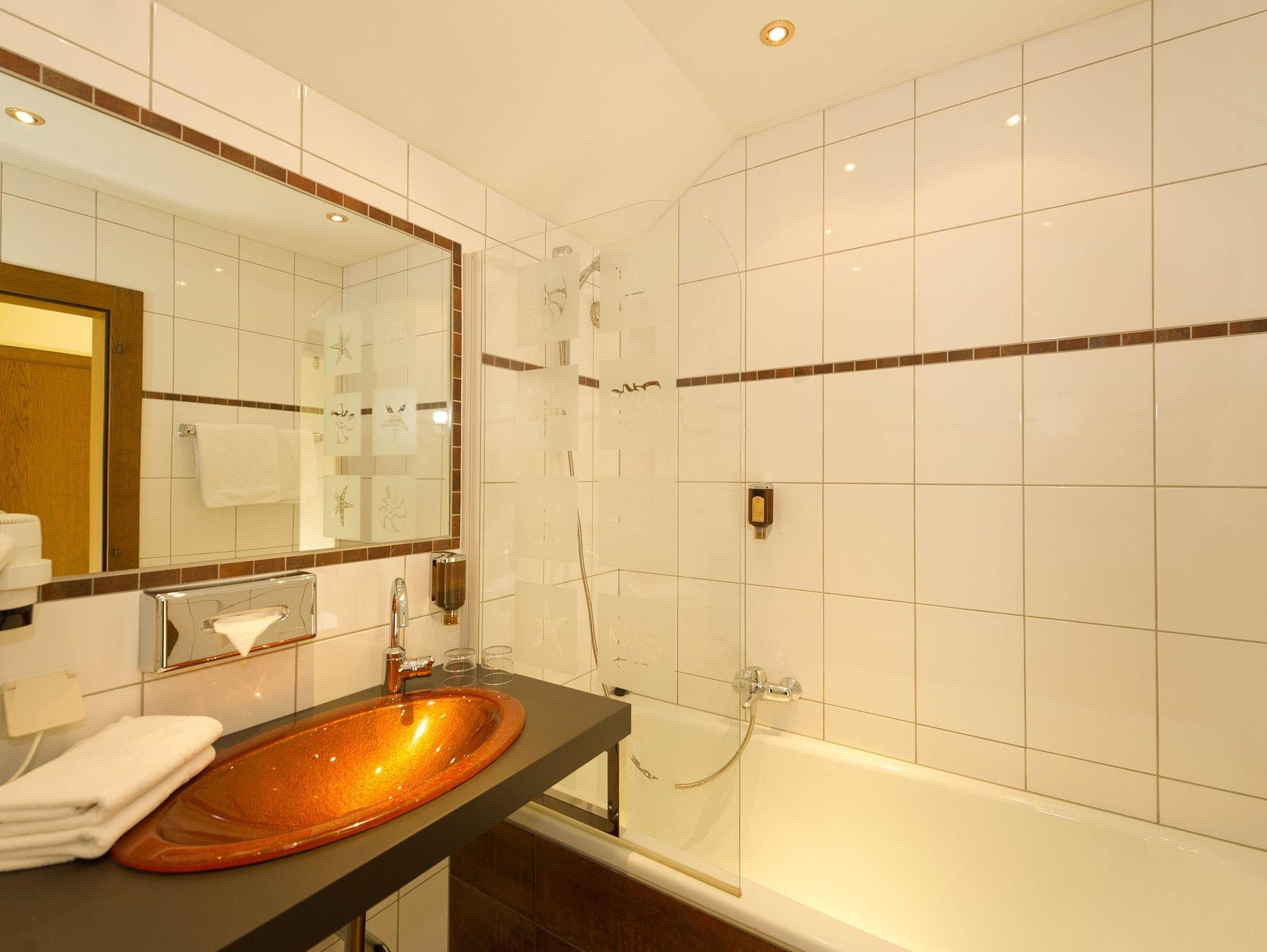 Bad: WC und Dusche, Fön, Kosmetik- Spiegel und Artikel, Wellness-Tasche mit Bademantel und Saunatücher