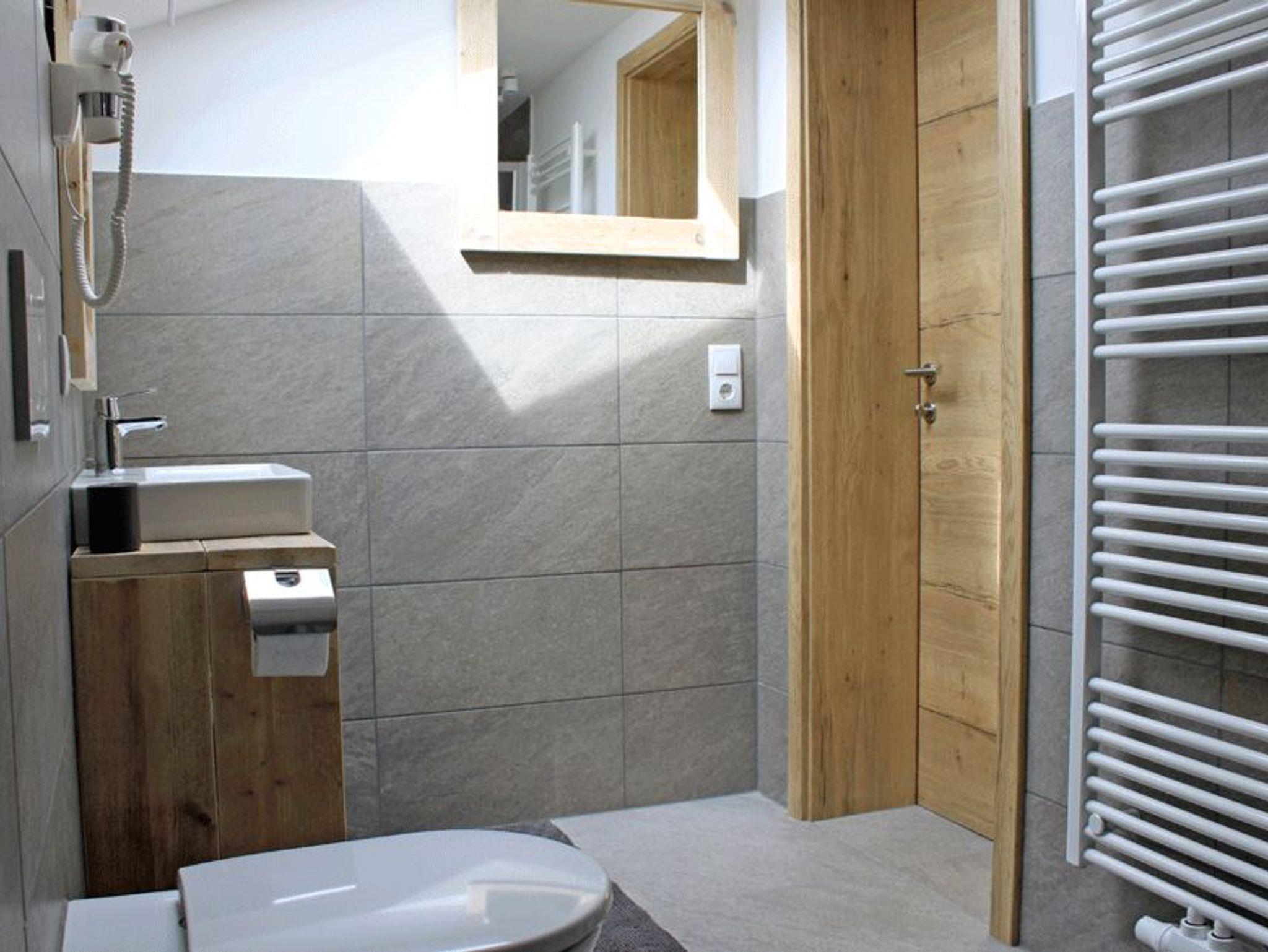 • Badezimmer mit Dusche, Toilette, Waschtisch und Föhn
