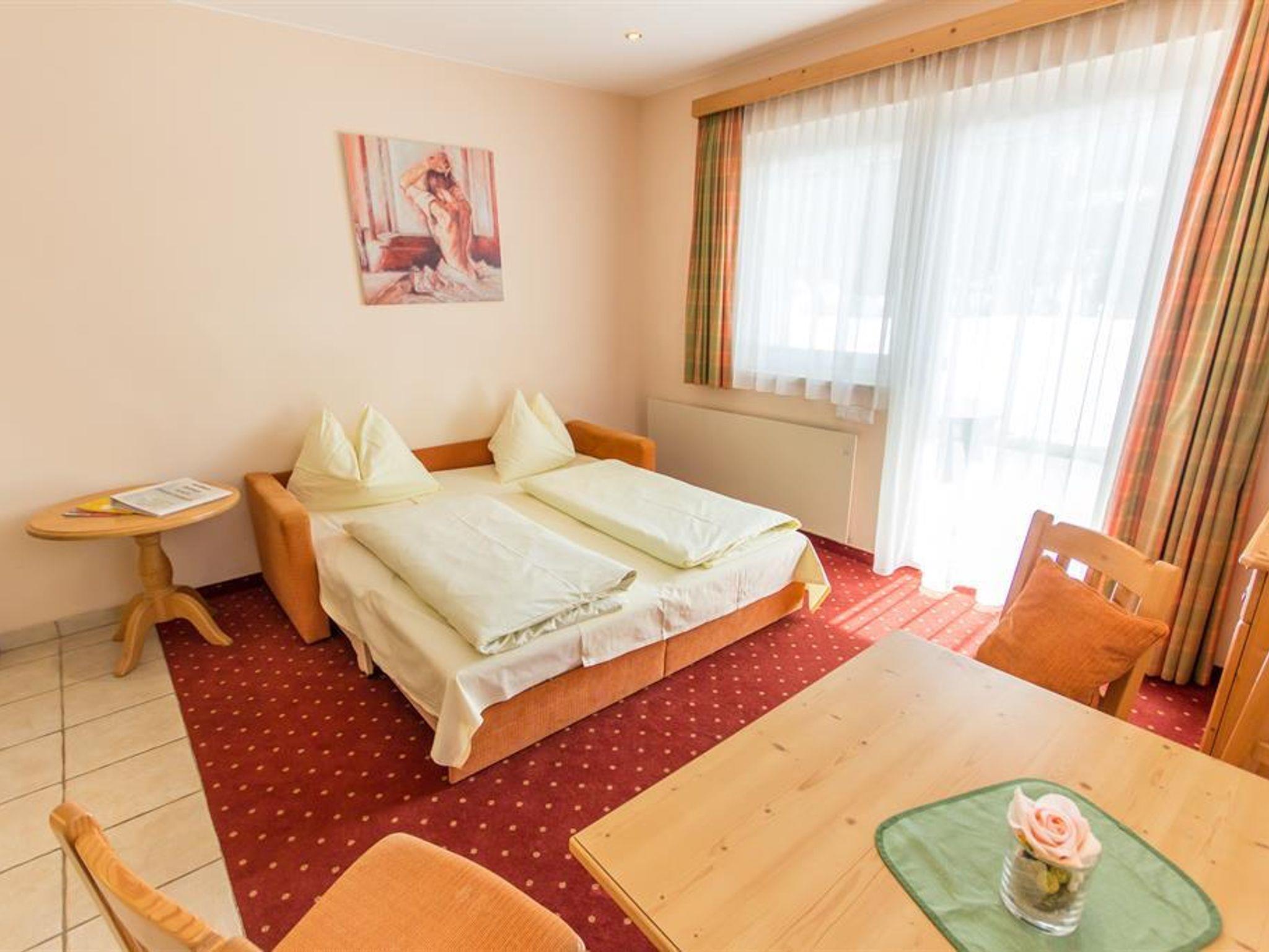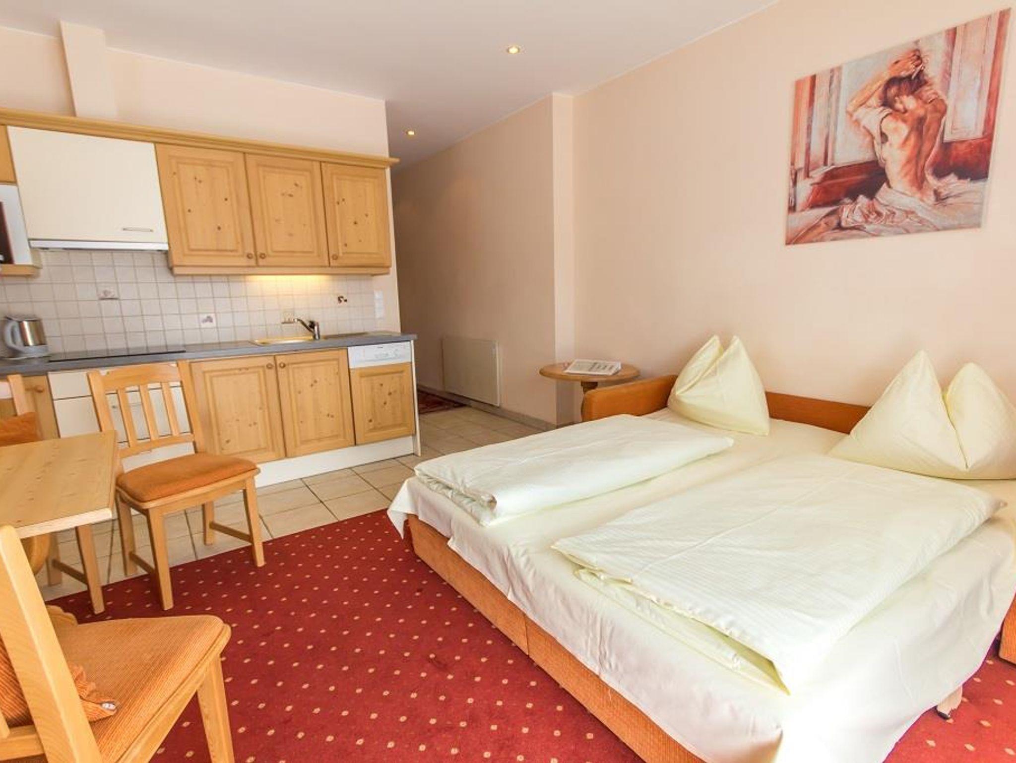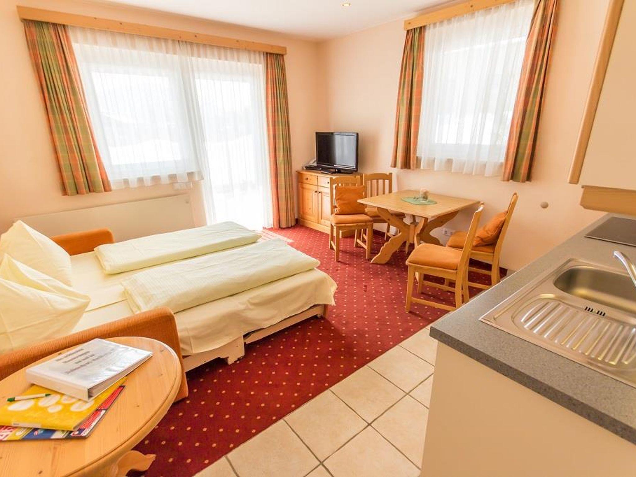 bestehend aus einem Schlafraum, einem Wohnraum mit Ausziehcouch, Kochnische mit Geschirrspüler, Espresso Kaffemaschine und Mikrowelle, Bad mit Badewanne und Dusche, extra WC, LCD-TV mit Radio, Südterrasse - Nichtraucherappartement