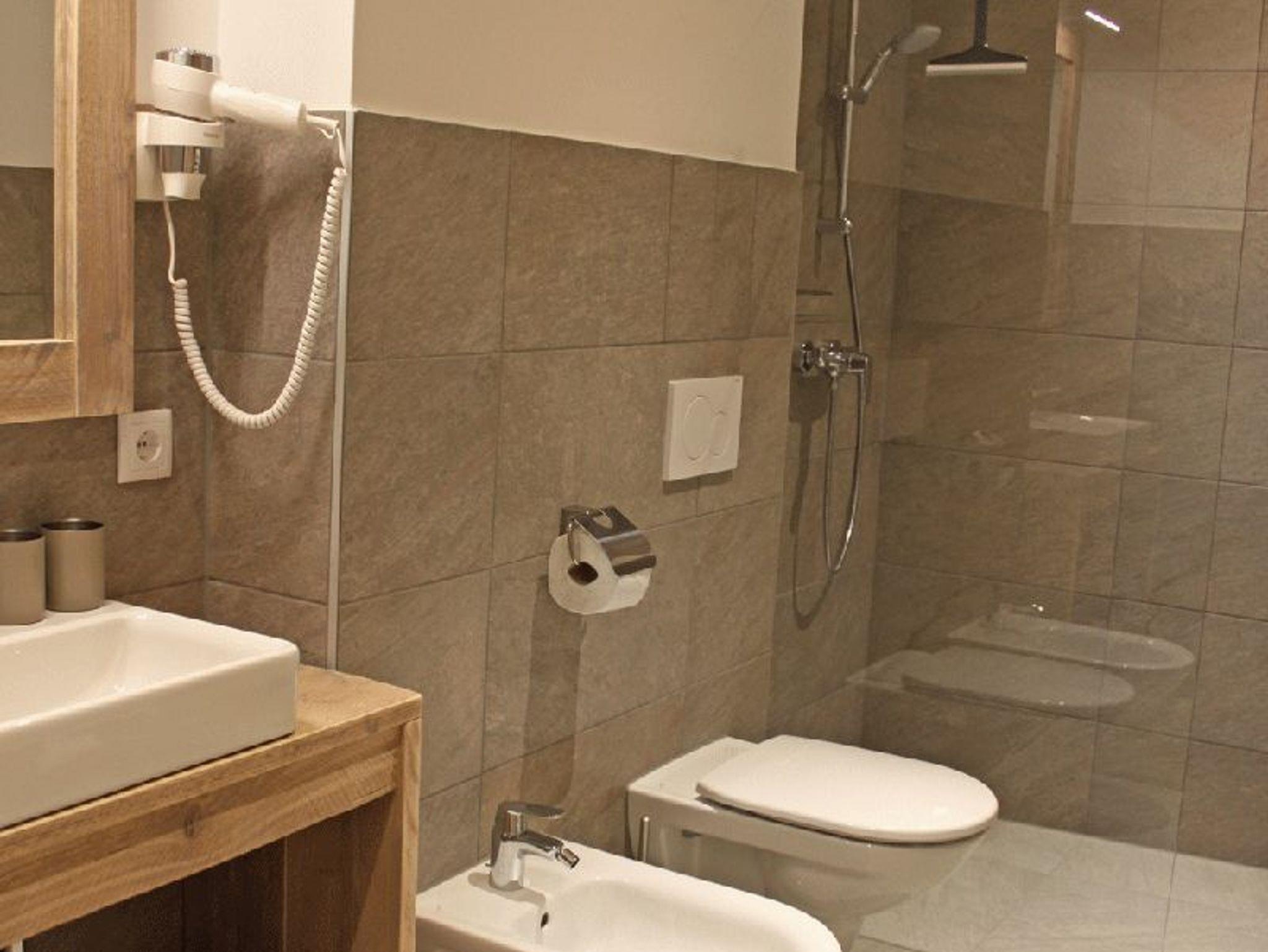 • Badezimmer mit bodenflacher Dusche, Toilette, Waschtisch und Föhn