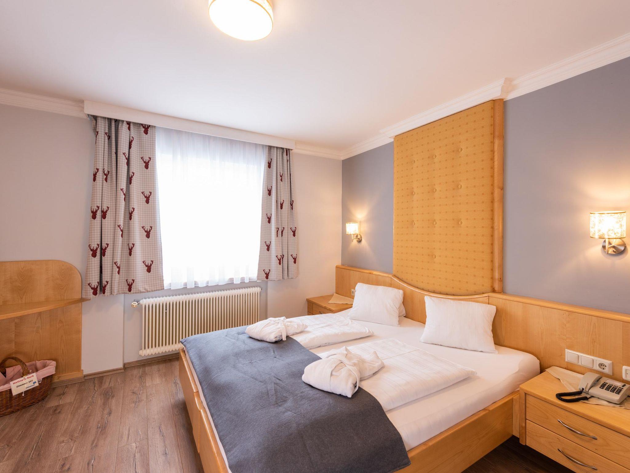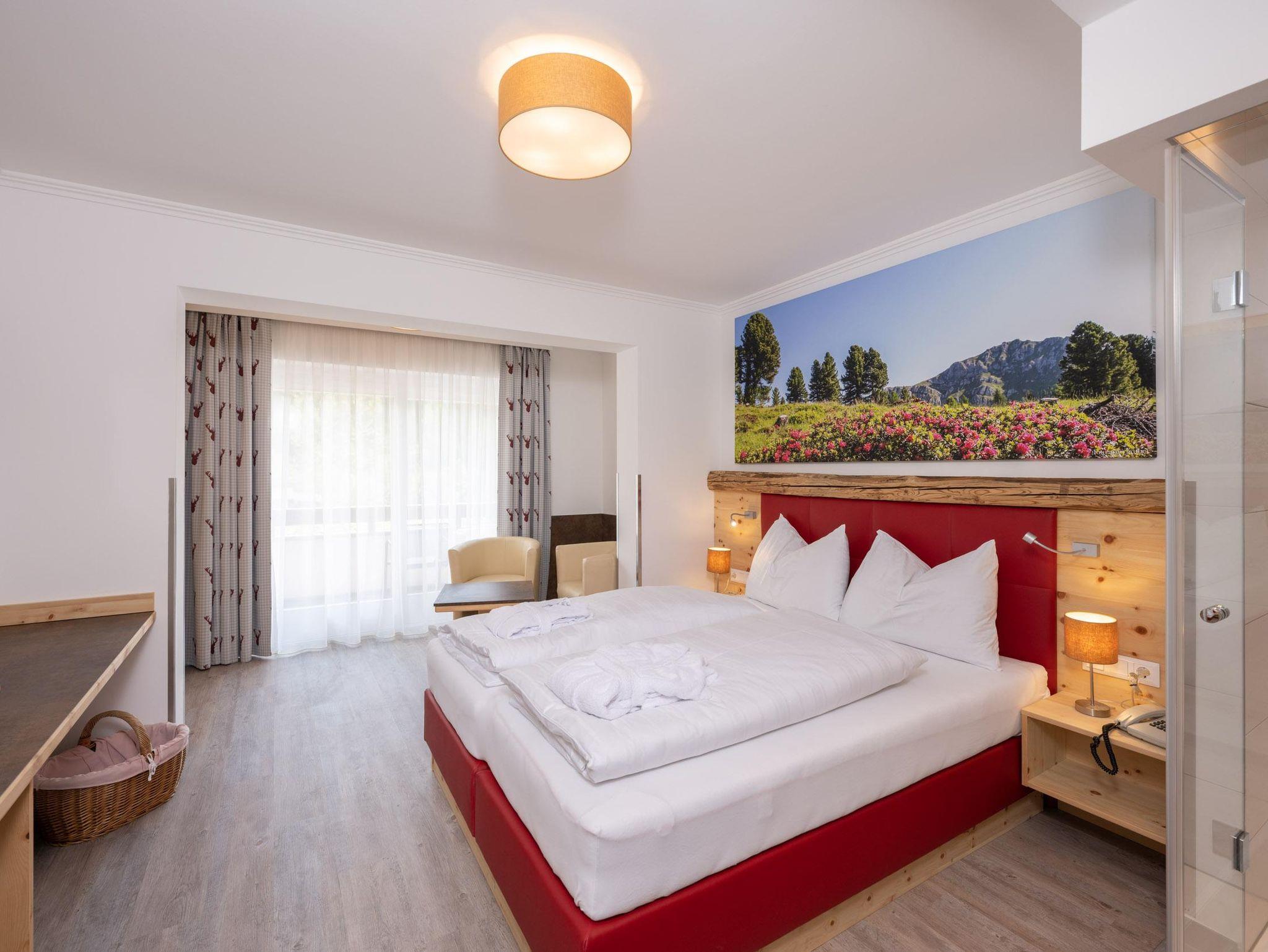 Doppelzimmer Zirbe-Birke Ca. 22 m² (für 1 bis 2 Personen), Ostbalkon oder Loggia, Gemütlicher Schlafraum und Wohnecke, Safe, Badezimmer mit Dusche und WC, Kosmetikspiegel, Föhn, Bademantel, Wellness-Korb, GRATIS WLAN