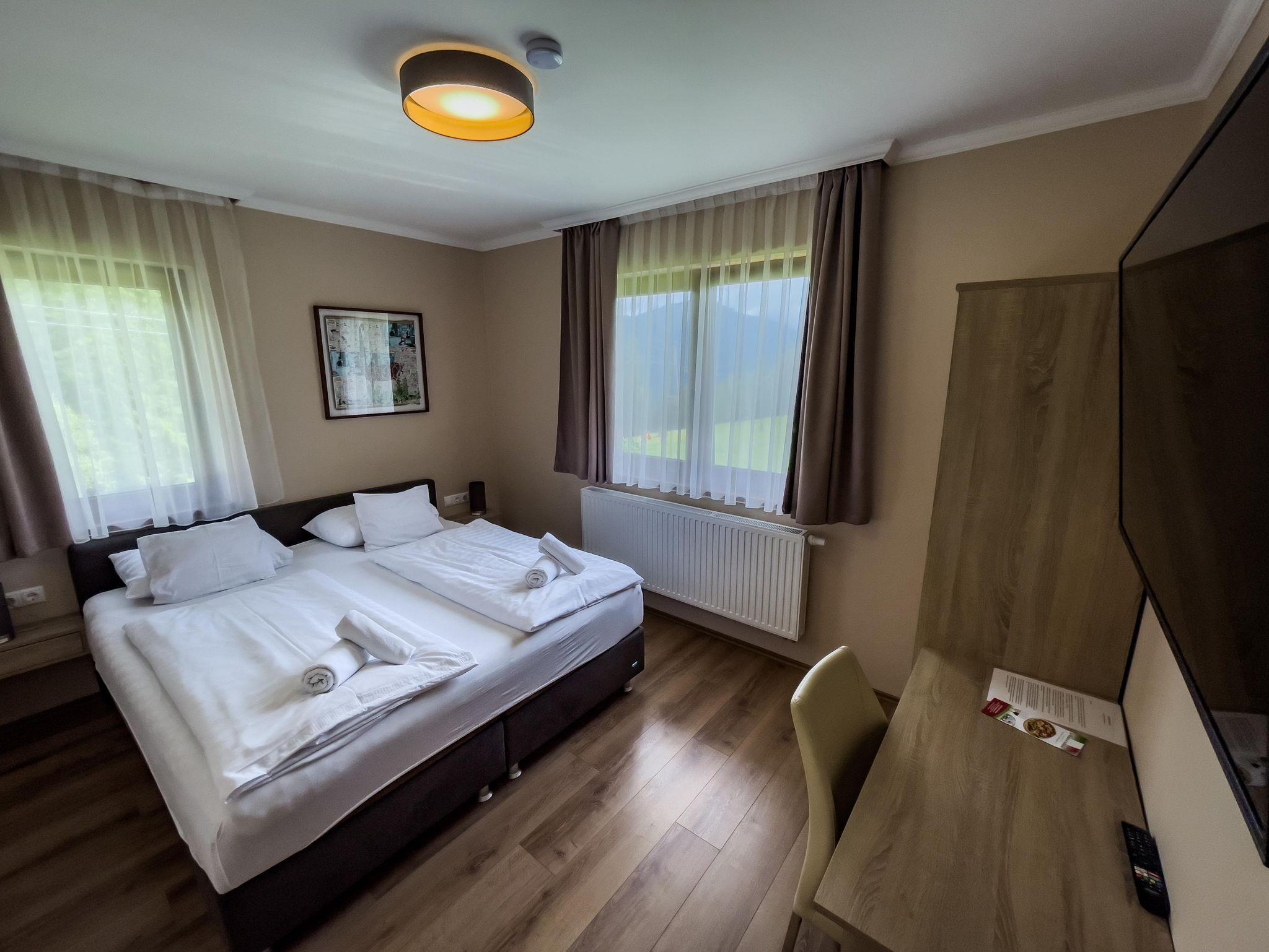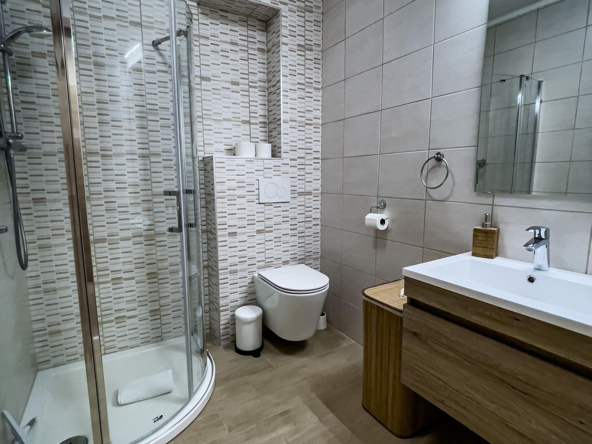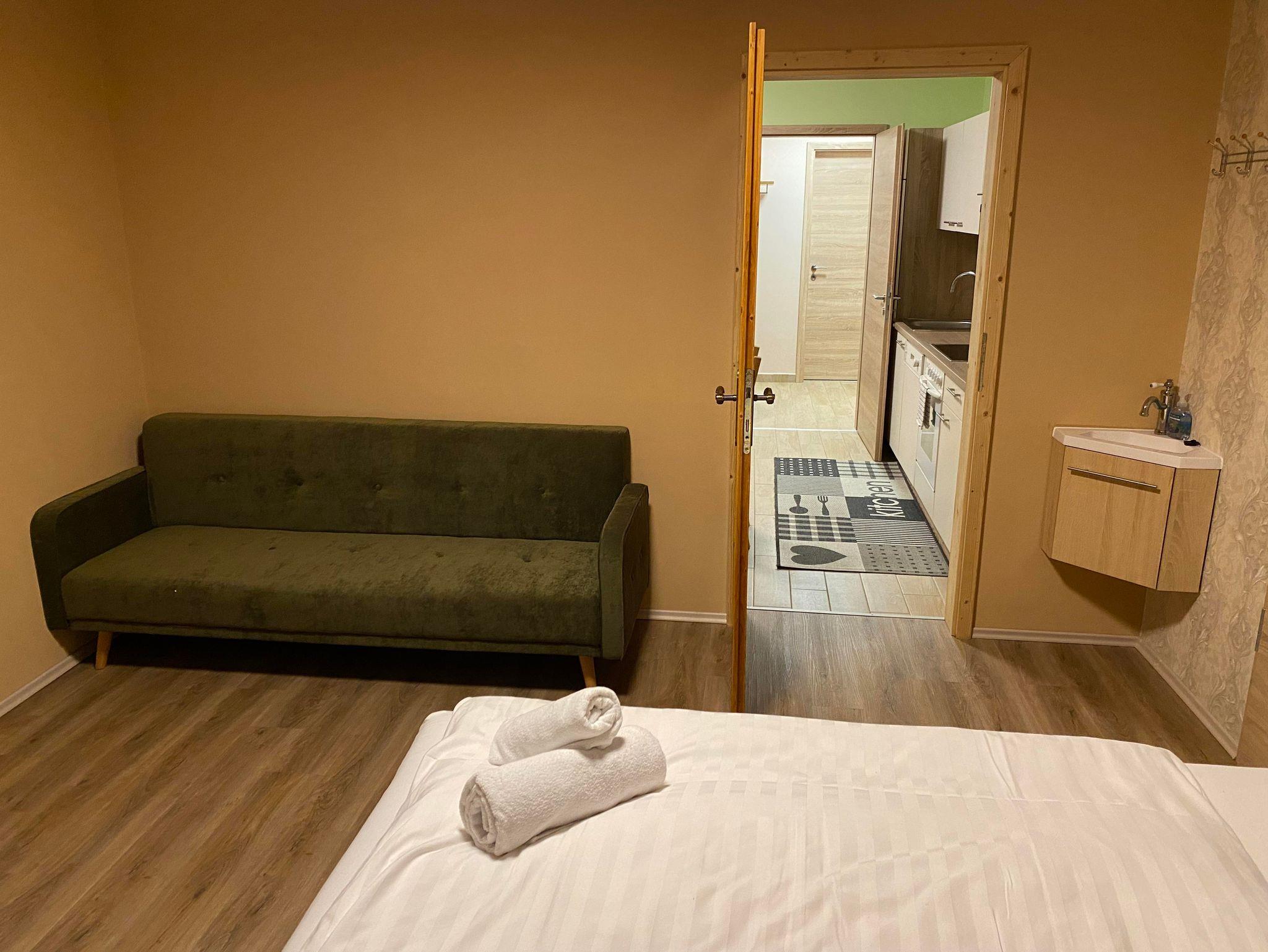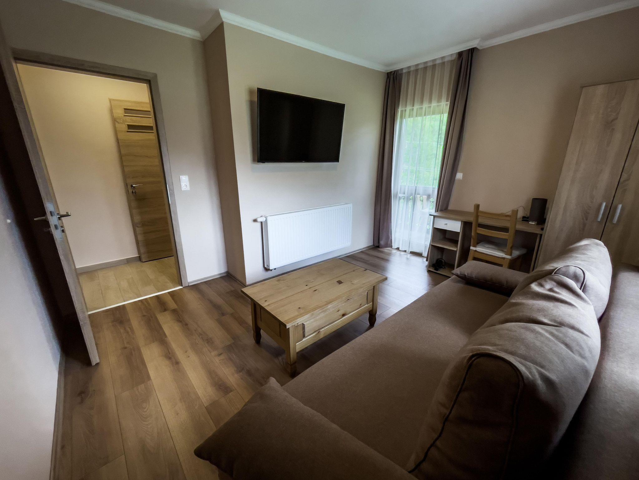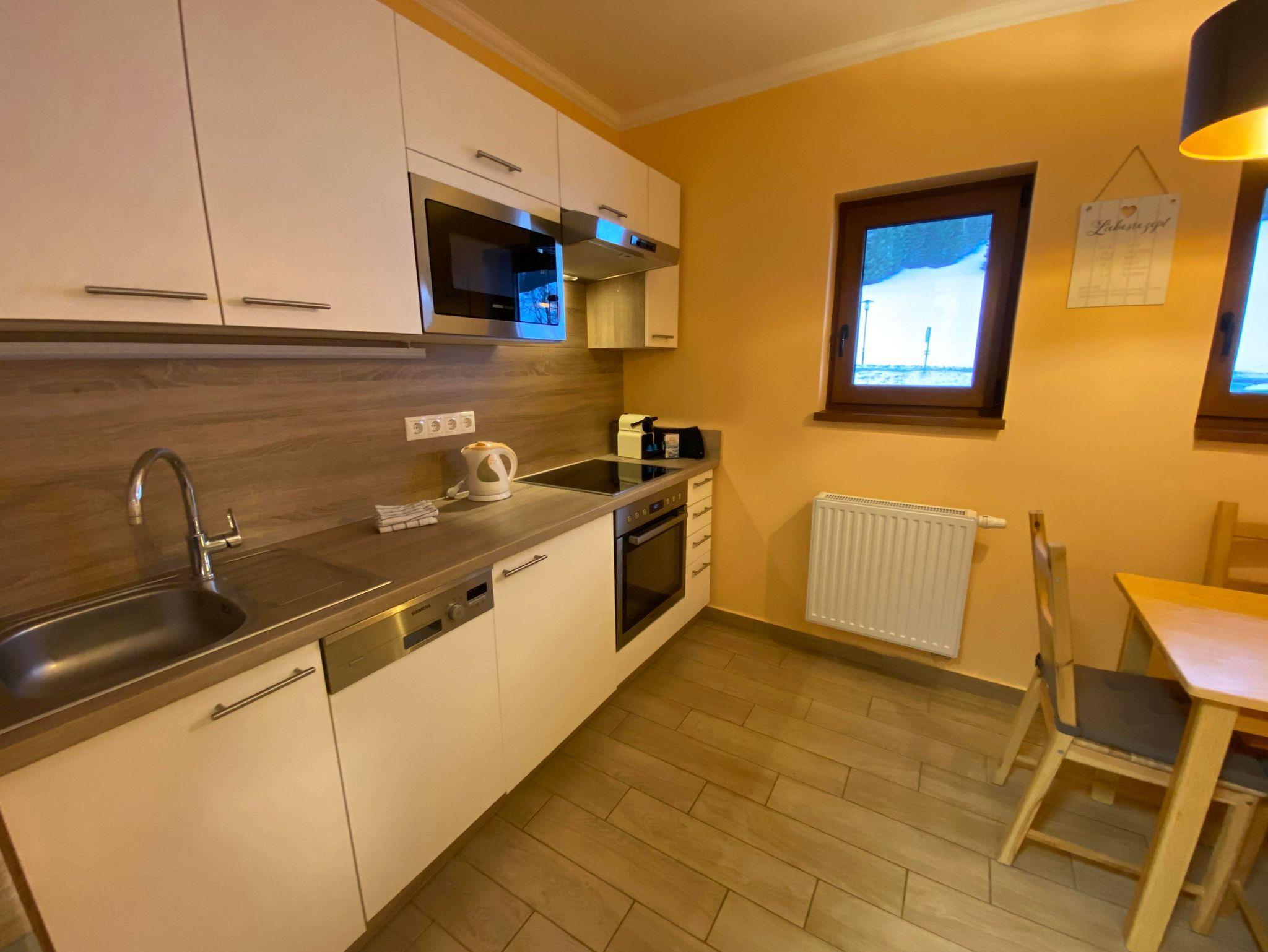 Das Apartment Nr. 3 ist eine wunderschöne, geräumige Unterkunft mit separatem Schlafzimmer, Wohnzimmer und Küche. Im Wohnzimmer befindet sich ein Boxspring-Bettsofa auf dem auch 2 Personen schlafen können. Der riesen Balkon mit Infrarot-Kabine bietet einen atemberaubenden Ausblick auf das alte Dorf und die Berge.