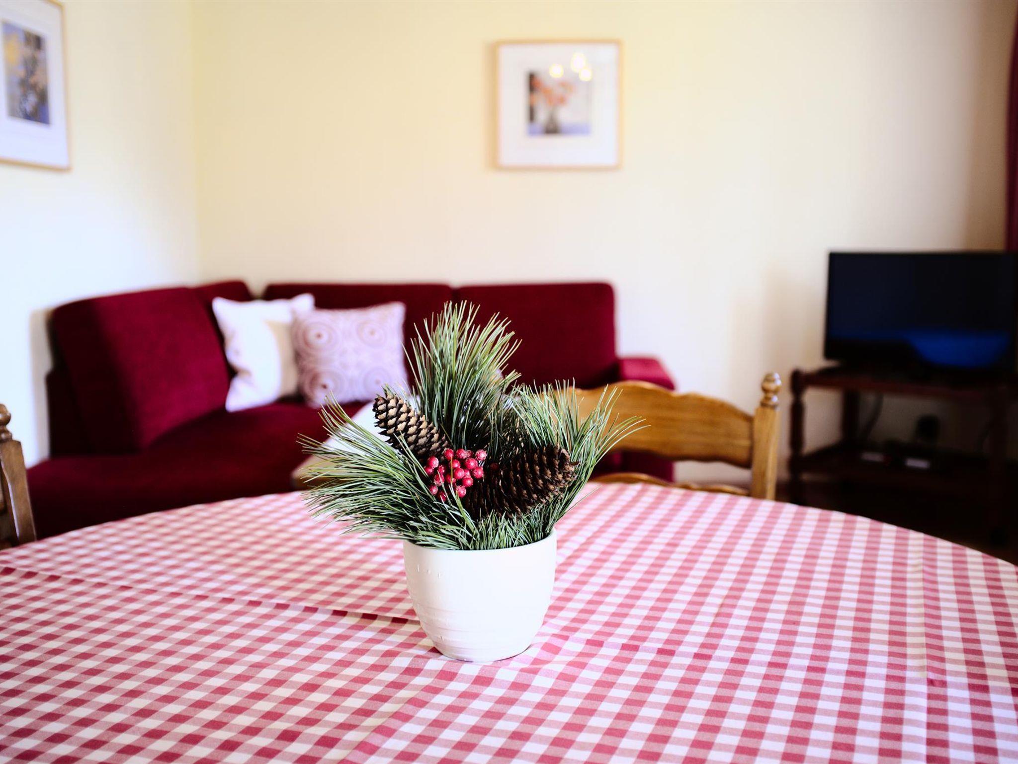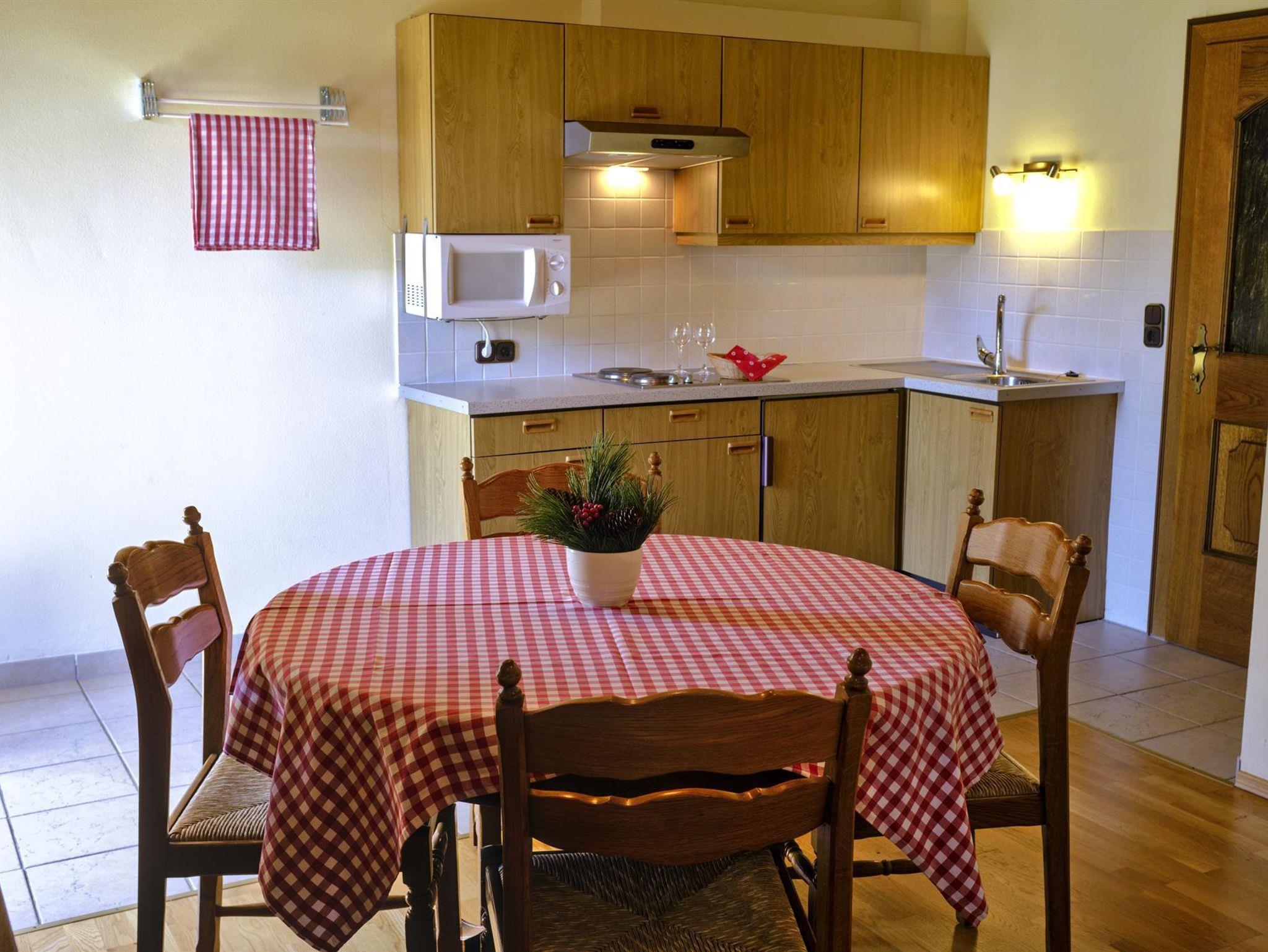 Das Wohnzimmer ist mit SAT TV und einem großen Esstisch ausgestattet - ideal für ein gemeinsames Familienfrühstück oder ein Abendessen mit Freunden. Die Kochnische ist mit Kochplatten, Mikrowellen/Grill Gerät, Kaffeemaschine und allen notwendigen Küchenutensilien (Kochtöpfe, Geschirr, Besteck, etc.) ausgerüstet.