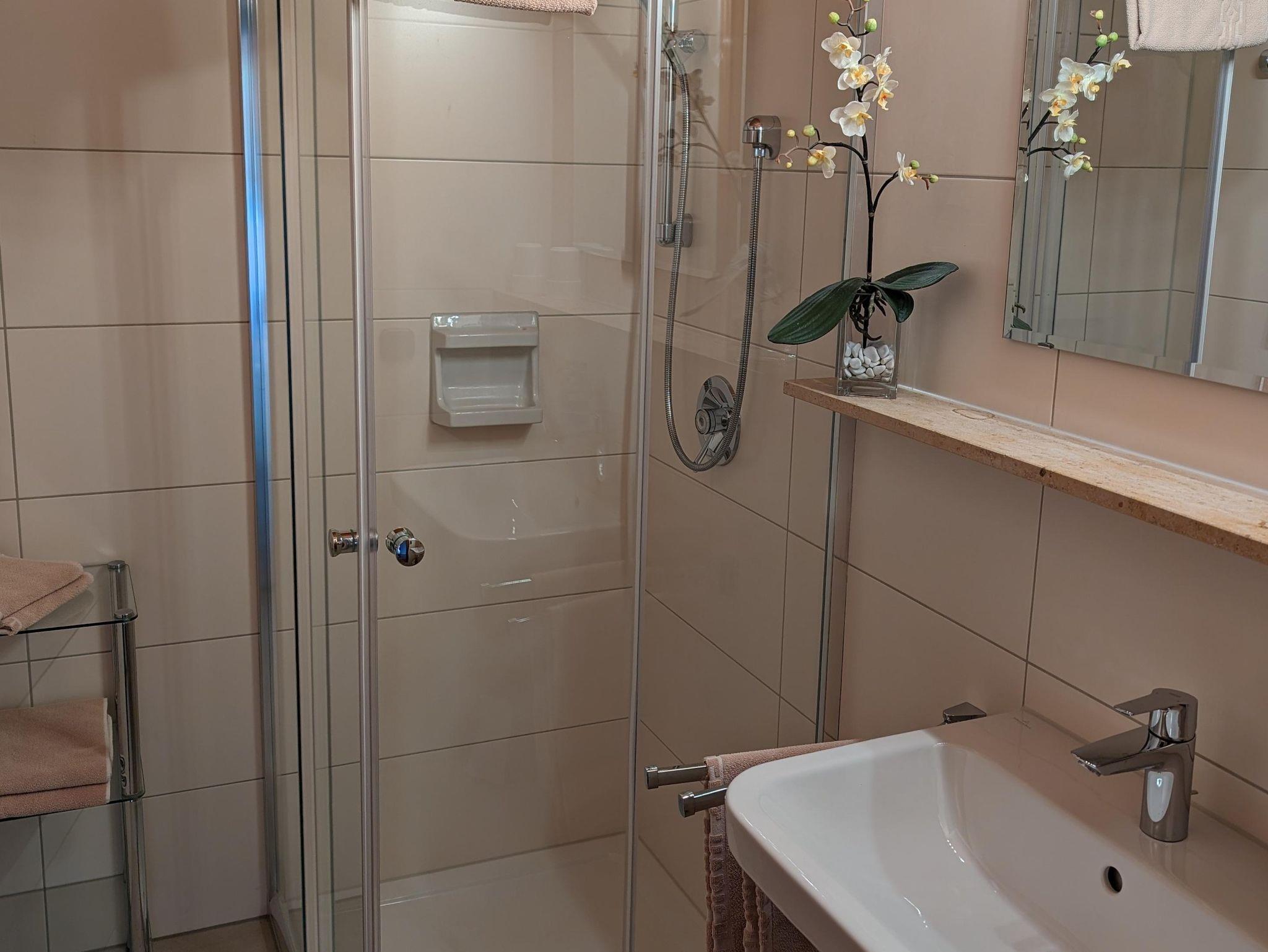 Das Badezimmer ist mit Dusche und Waschtisch ausgestattet. Handtücher sind inkludiert. Das WC ist seperat.