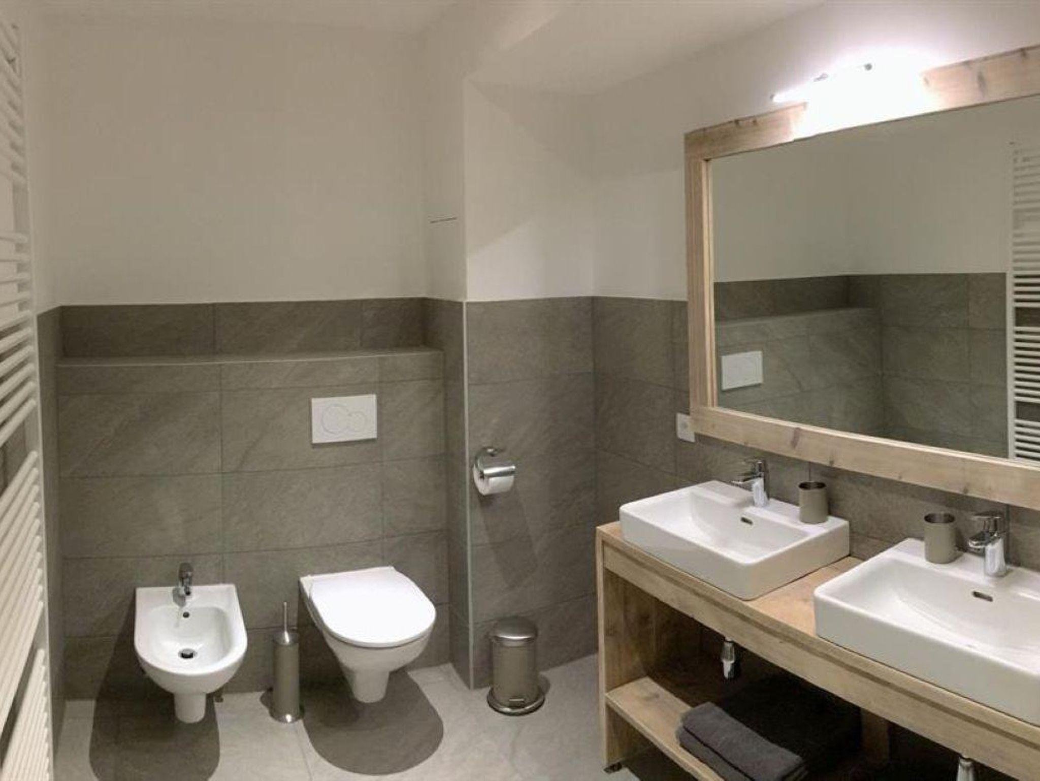 • Badezimmer mit bodenflacher Dusche, Toilette, Waschtisch und Föhn