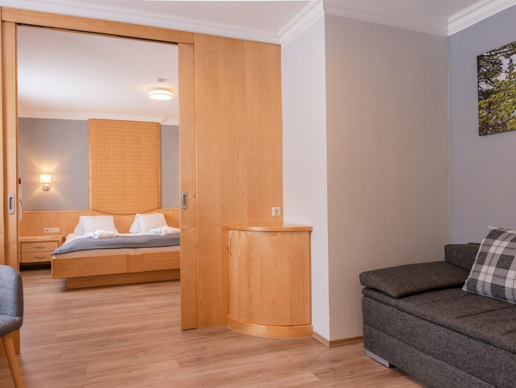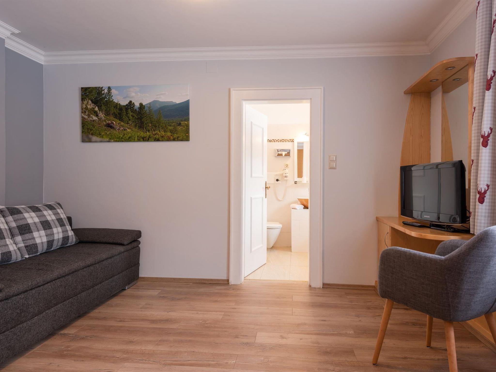 Junior Suite Sonnwiesen, Ca. 37 m² (für 2 bis 4 Personen) Gemütlicher Schlafraum und Wohnecke - abtrennbarer zweiter Schlafraum, 2 Kabel-TV´s, Safe, Badezimmer mit Badewanne und WC, Kosmetikspiegel, Föhn, Bademantel, Wellness-Korb, GRATIS WLAN