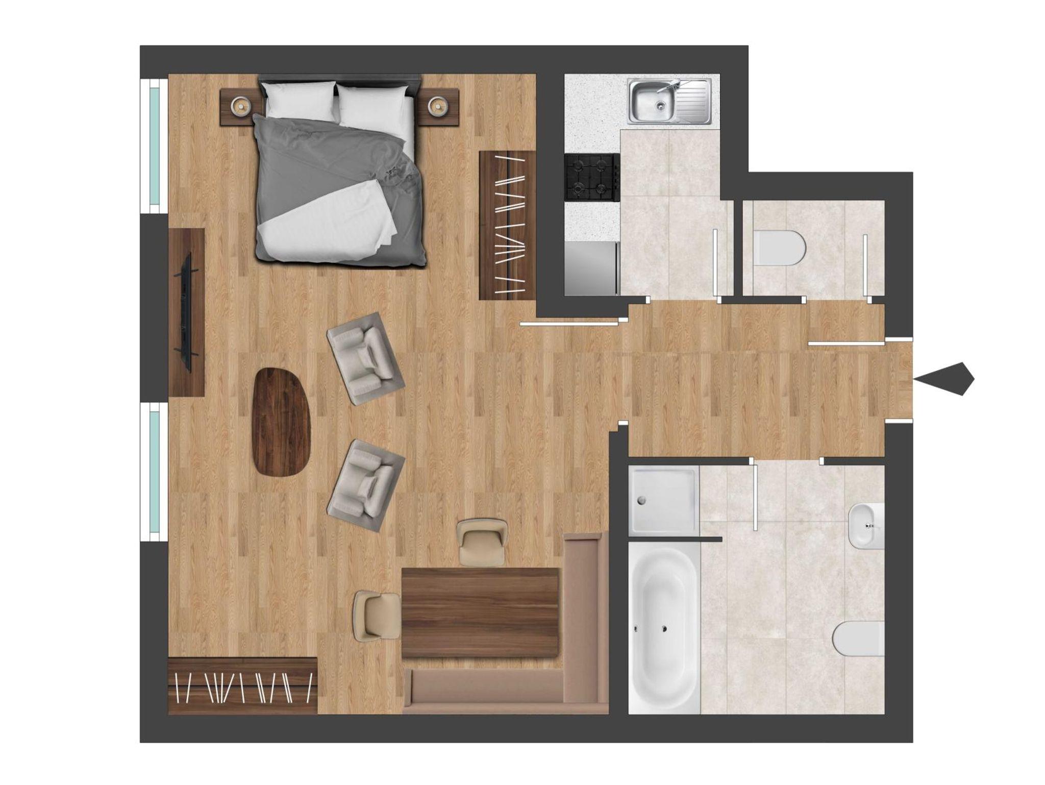 Studio mit 45 m², 1 Doppelbett, im Erdgeschoss