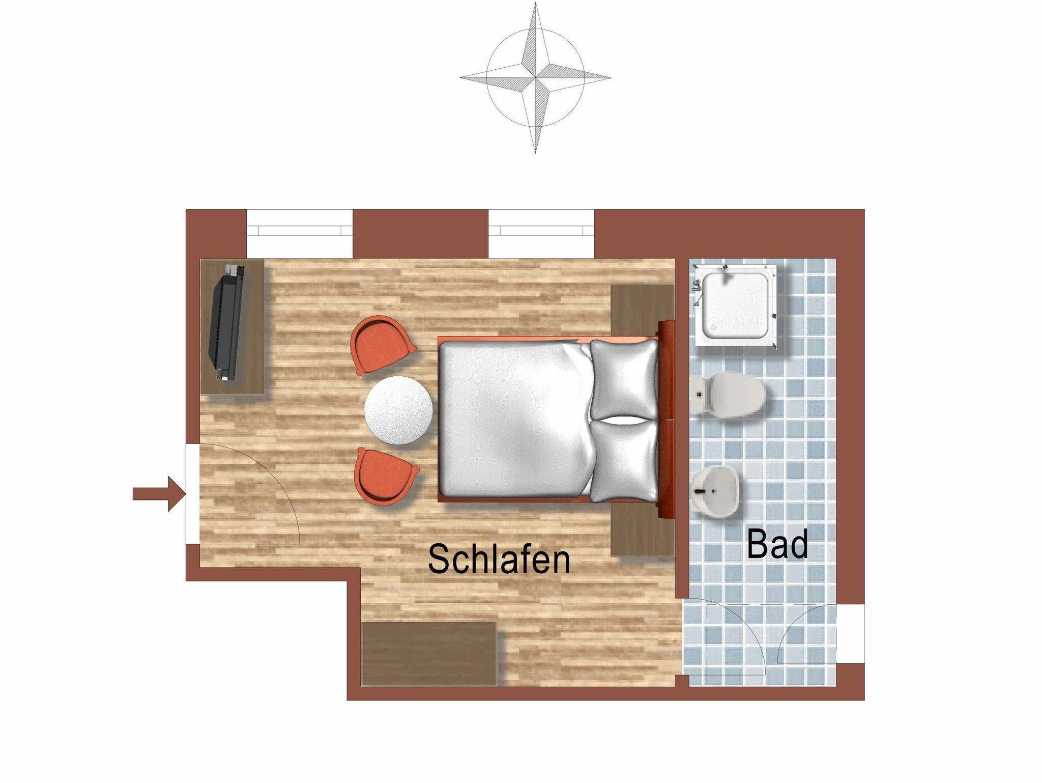Kleines Zimmer mit Doppelbett, kleiner Tisch, Kasten, Dusche mit WC, Flat TV, WLAN im Zimmer und gratis,