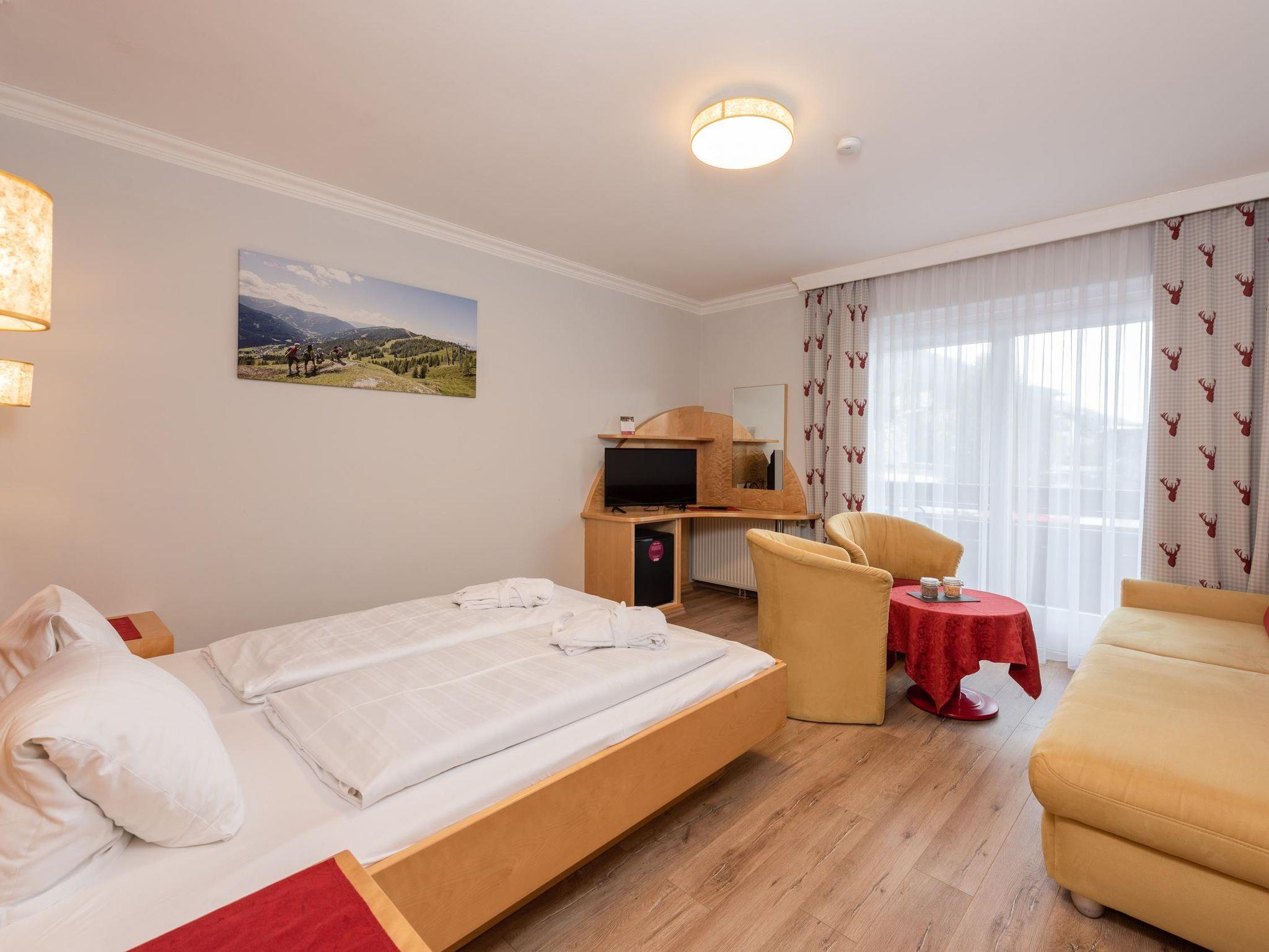 Doppelzimmer Zirbe-Birke Ca. 22 m² (für 1 bis 2 Personen), Ostbalkon oder Loggia, Gemütlicher Schlafraum und Wohnecke, Safe, Badezimmer mit Dusche und WC, Kosmetikspiegel, Föhn, Bademantel, Wellness-Korb, GRATIS WLAN