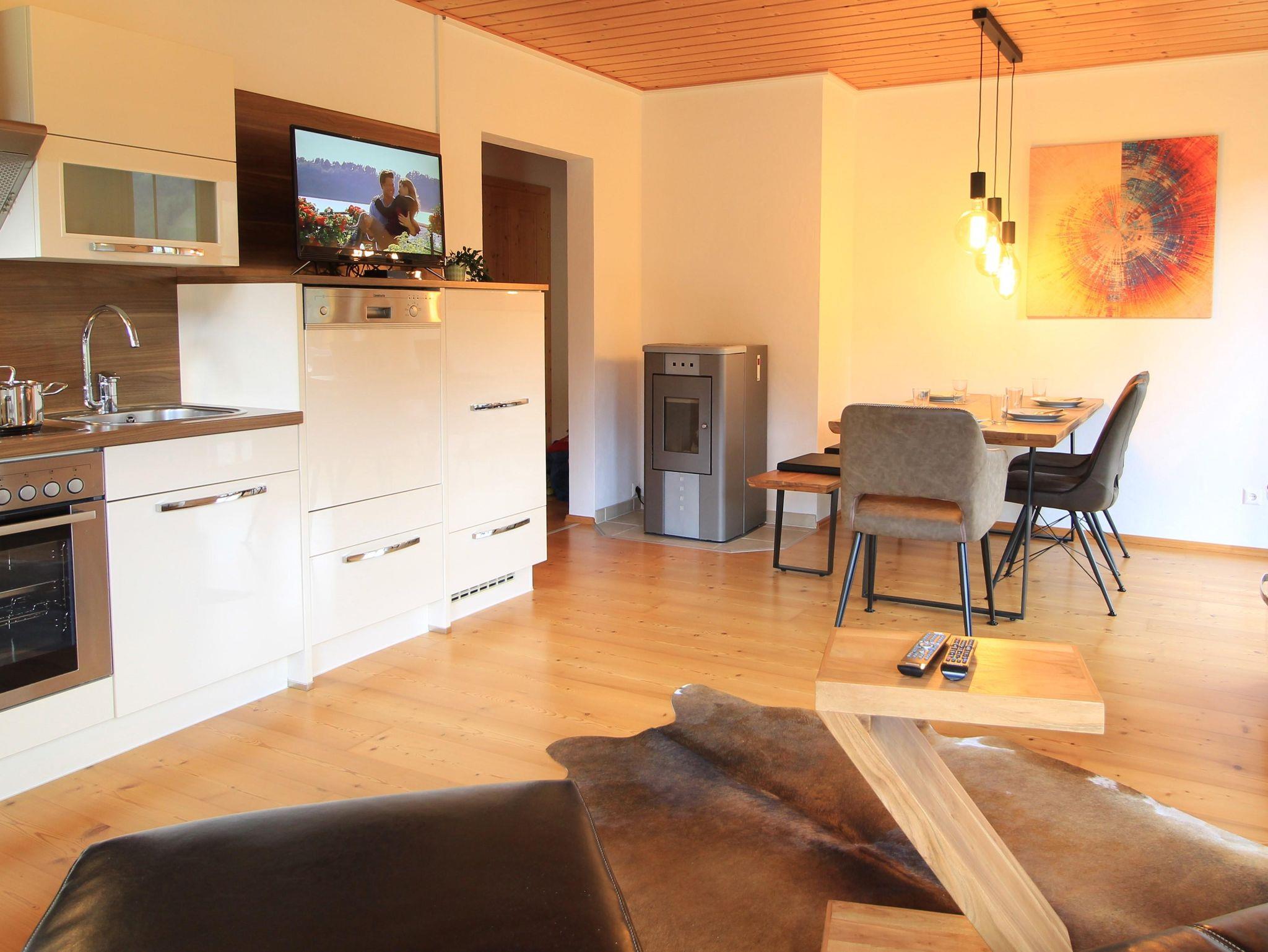 Neue Wohnung im Erdgeschoss mit Garten, komfortabel und hell, mit zwei Doppelzimmern, einem kompletten Badezimmer mit Dusche, einer Toilette, einem großen Wohnzimmer mit Schlafcouch und einer Küche mit Backofen und Geschirrspüler, Pelletofen, Außenterrasse. Außenparkplatz für zwei Autos und Keller für Sportsausrüstung.