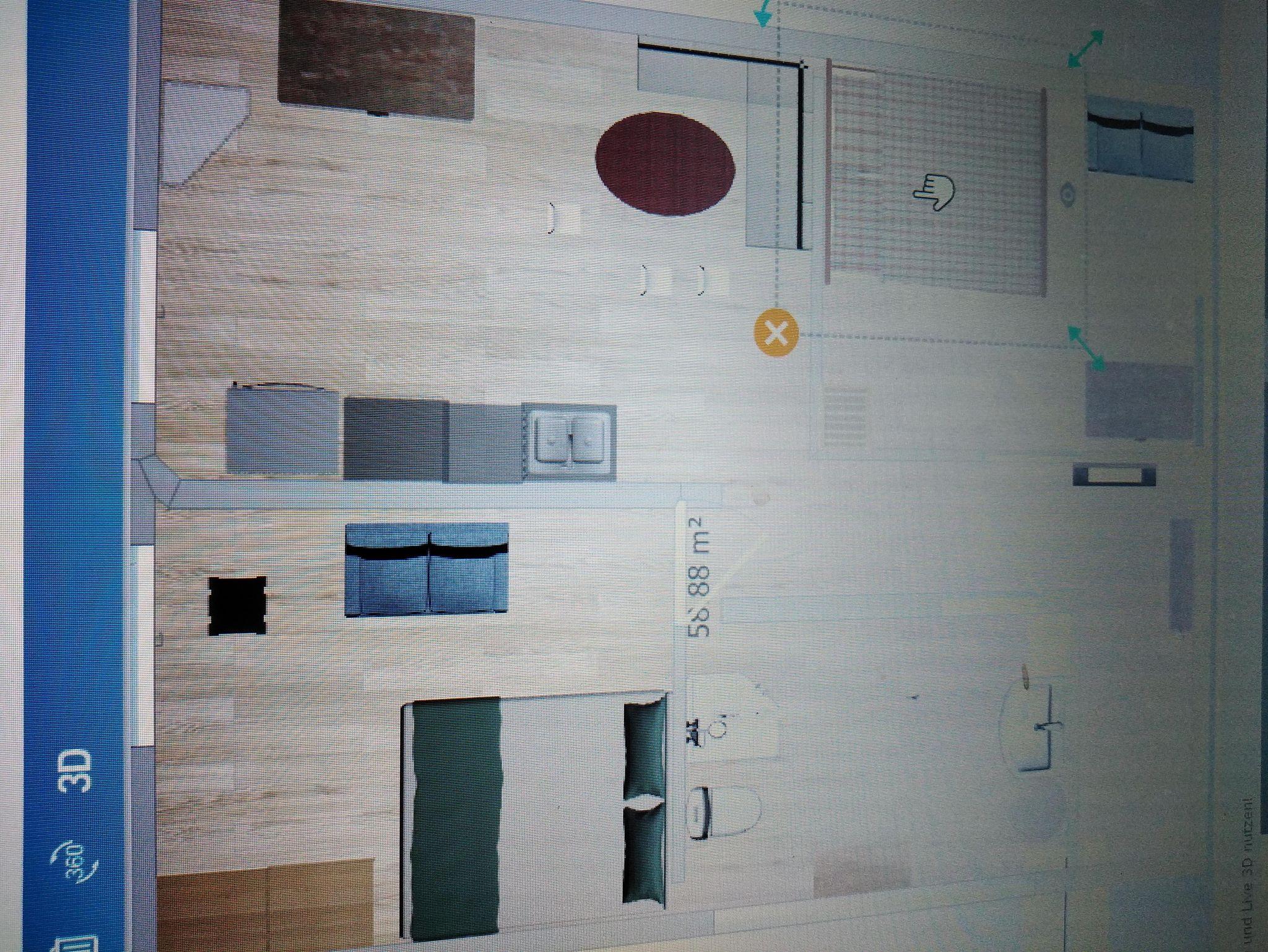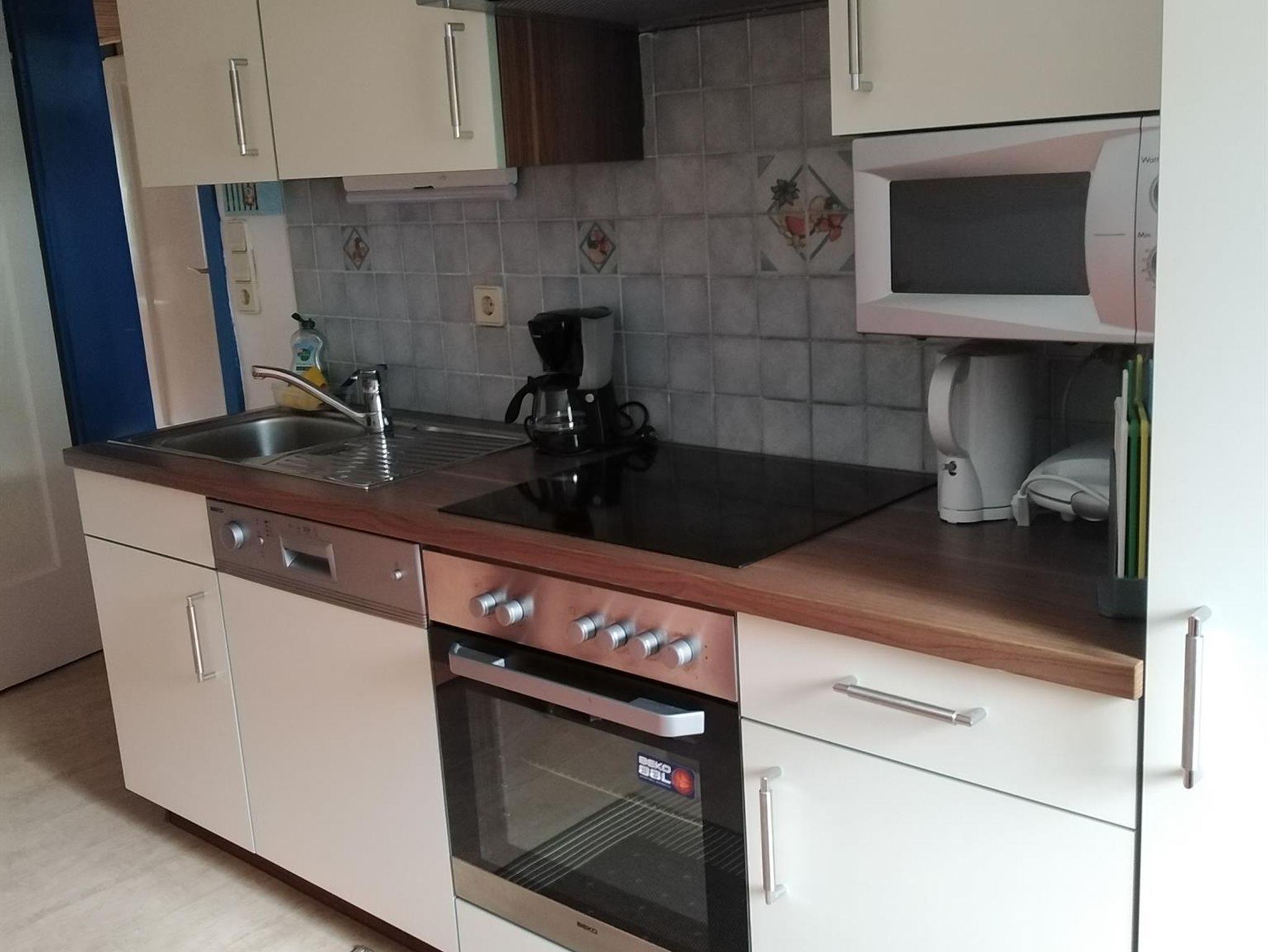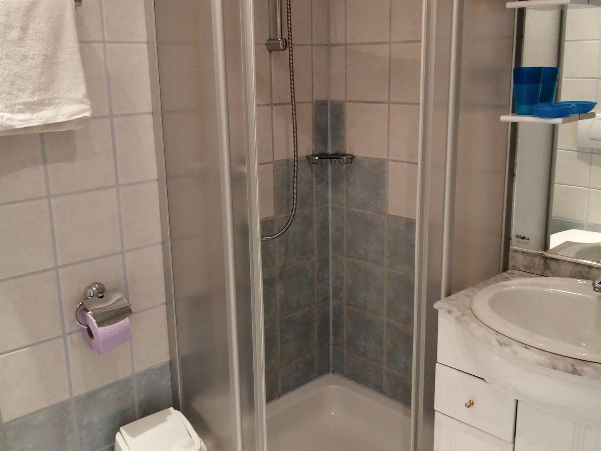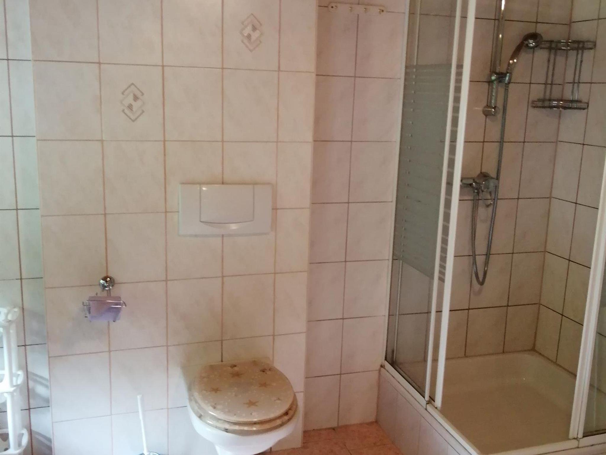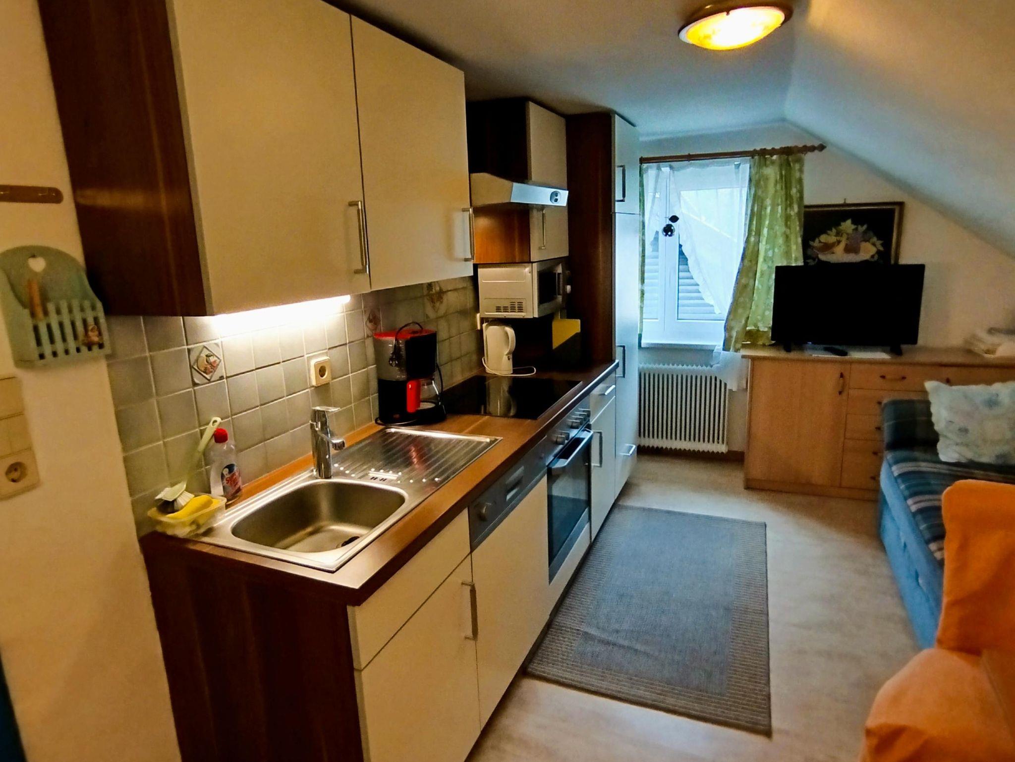 kleine Wohnküche mit Sitzecke und neuer Kochzeile, großes Bad mit WC Dusche