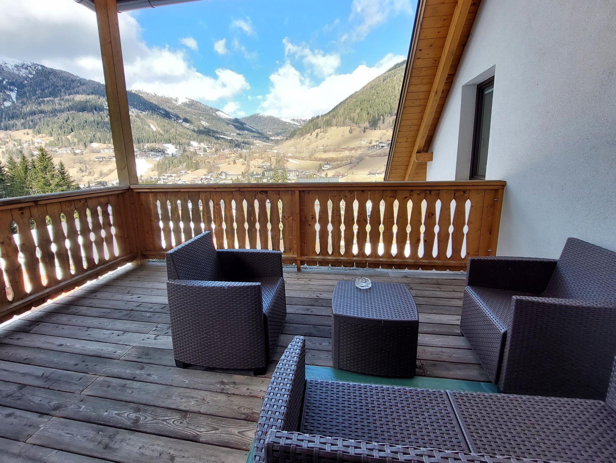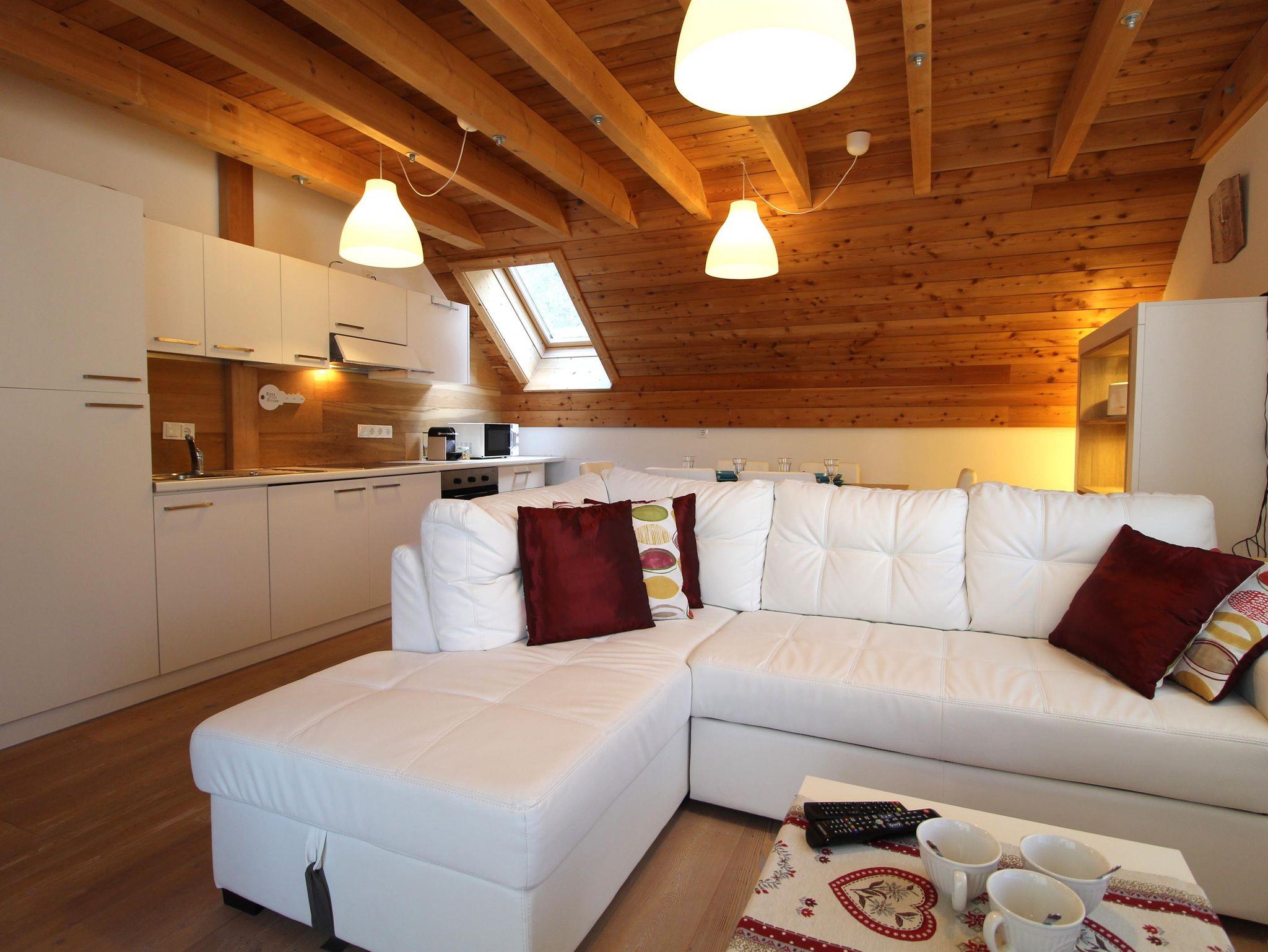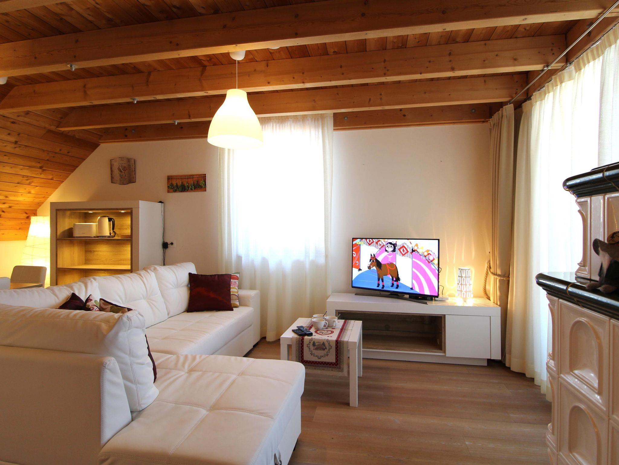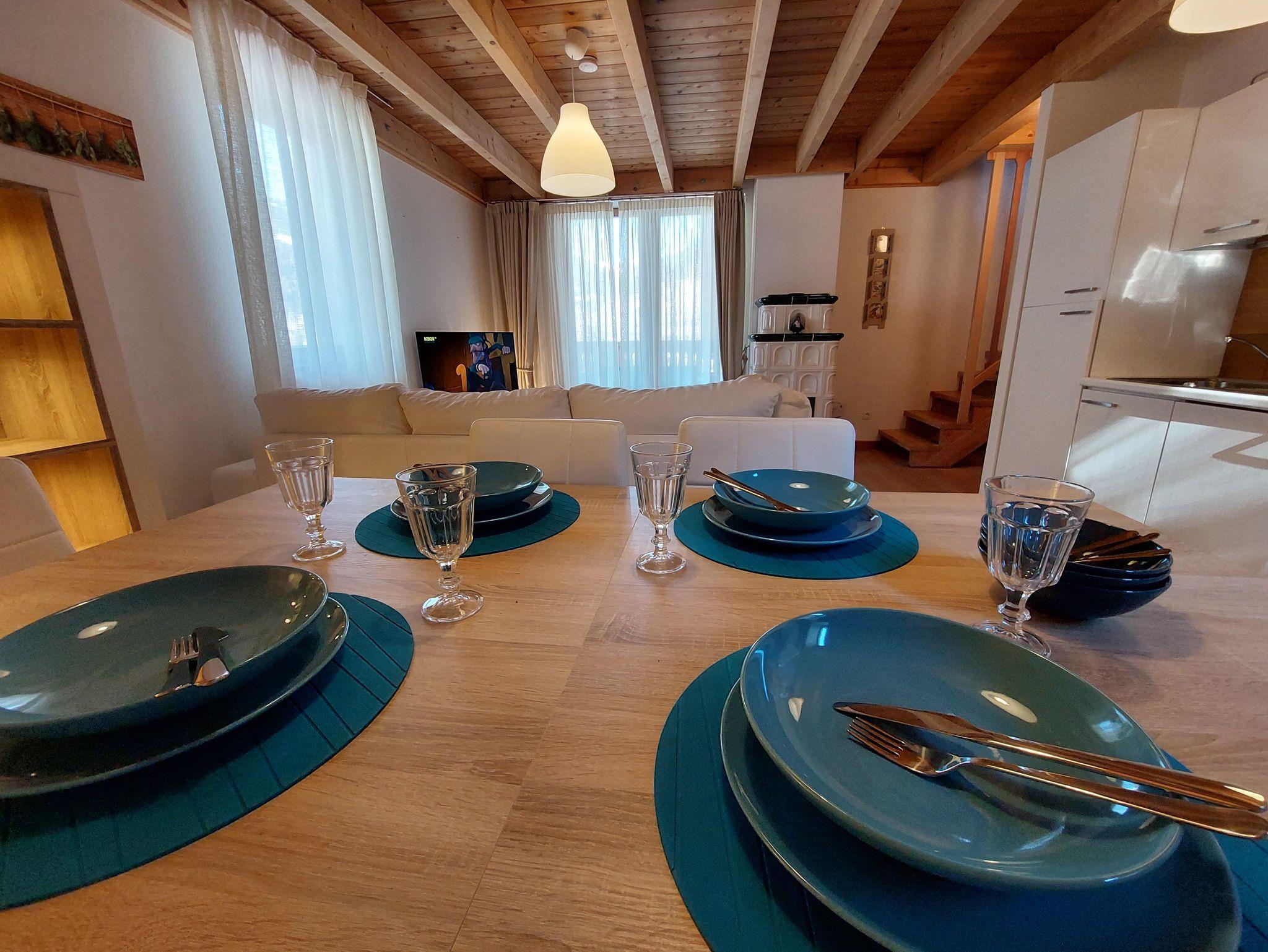 Wunderschöne neue Ski-to-door Wohnung auf zwei Ebenen in panoramischer Lage. Drei Schlafzimmer mit Doppelbett, zwei komplette Bäder mit WC, Waschbecken, Dusche und Bidet, bequemes Wohnzimmer mit Küche, Esstisch für 6 Gäste, Couch und Holzofen und Zugang zu einem tollen Balkon mit Blick auf Tal, Dorf und Skipiste. Eine Waschmaschine steht zur Verfügung, wie auch zwei bedeckte Parkplätze und ein Abstellraum für sportliche Ausrüstung (Ski, Skischuhe und Fahrräder). Im Winter kann man mit den Skischuhen an einfach die Strasse überqueren und man kommt zur Skipiste der Skischule für Kinder, die auch als Verbindungspiste zum Maibrunn Sessellift dient.