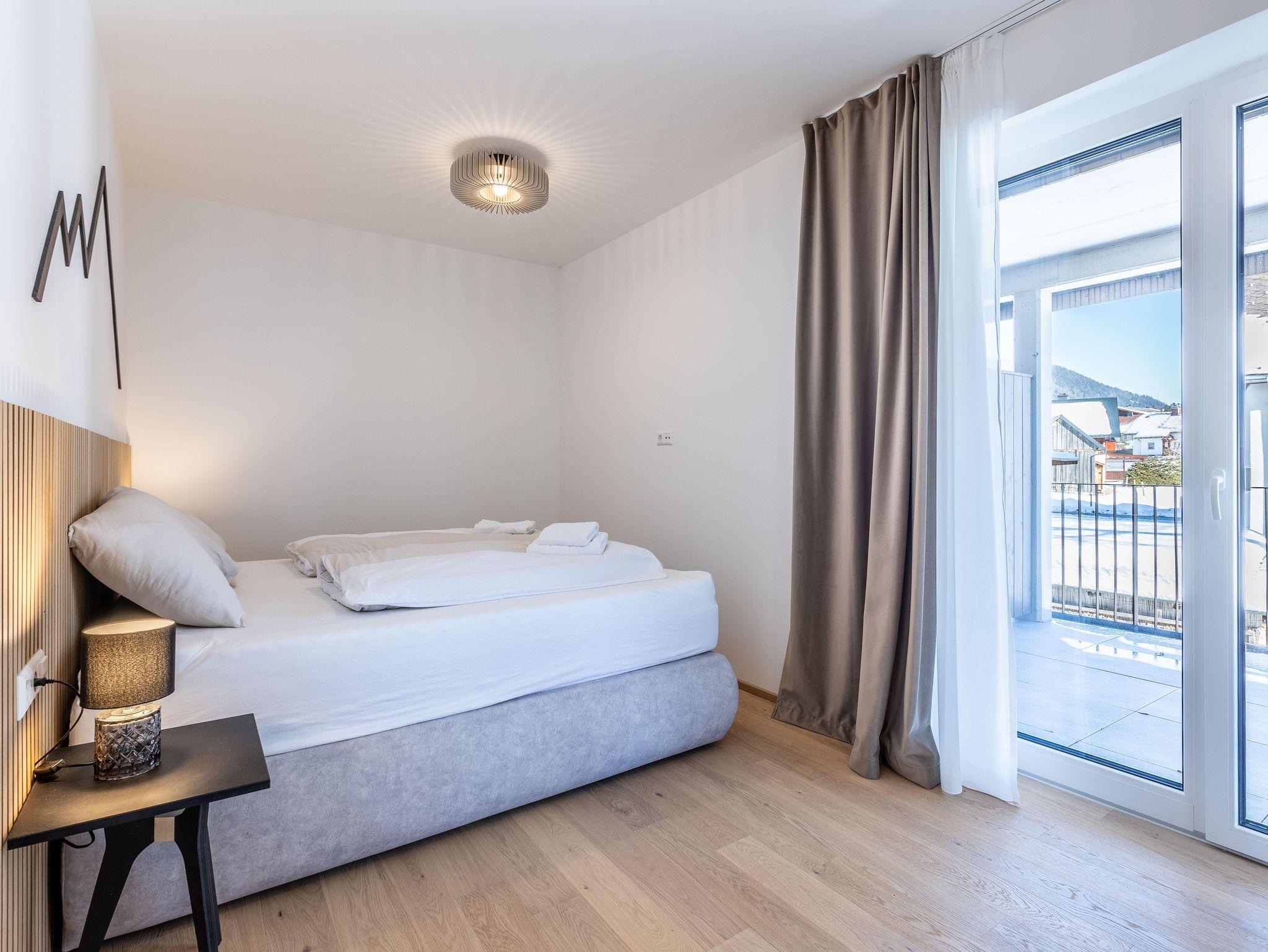 Suite Romance befindet sich im ersten Stock, inklusive eigener Terrasse mit Bergblick. Es gibt ein Schlafzimmer mit Doppelbett, sowie eine Schlafcouch im Wohnzimmer. Die Küche ist vollausgestattet.