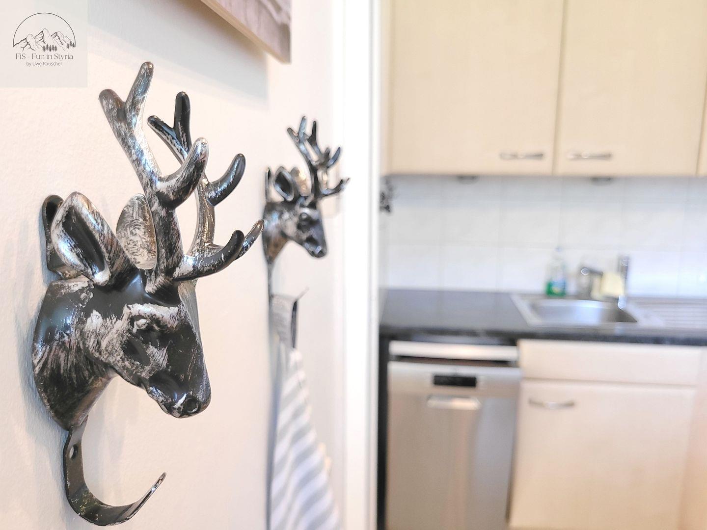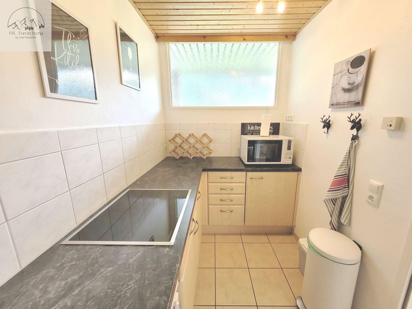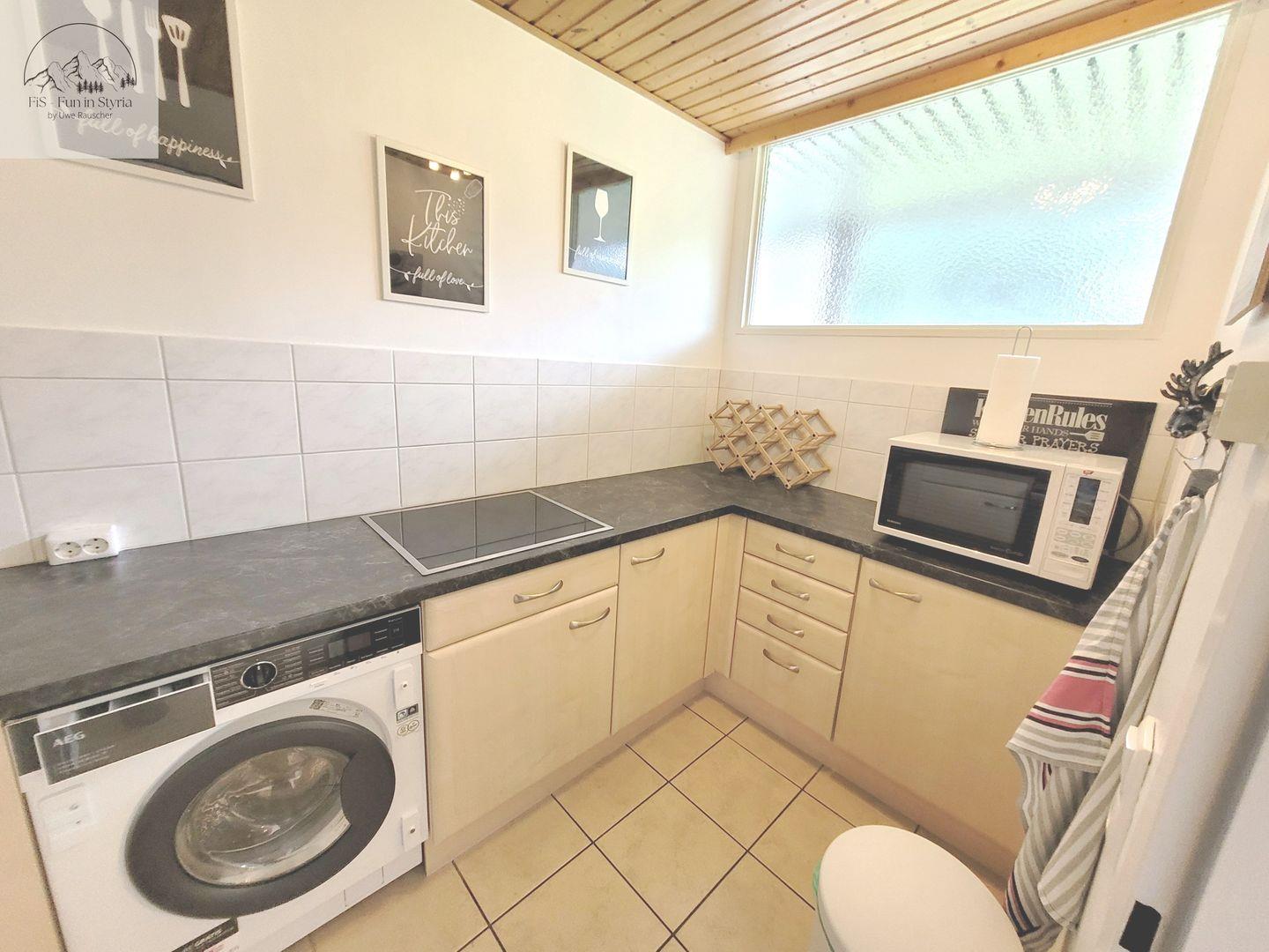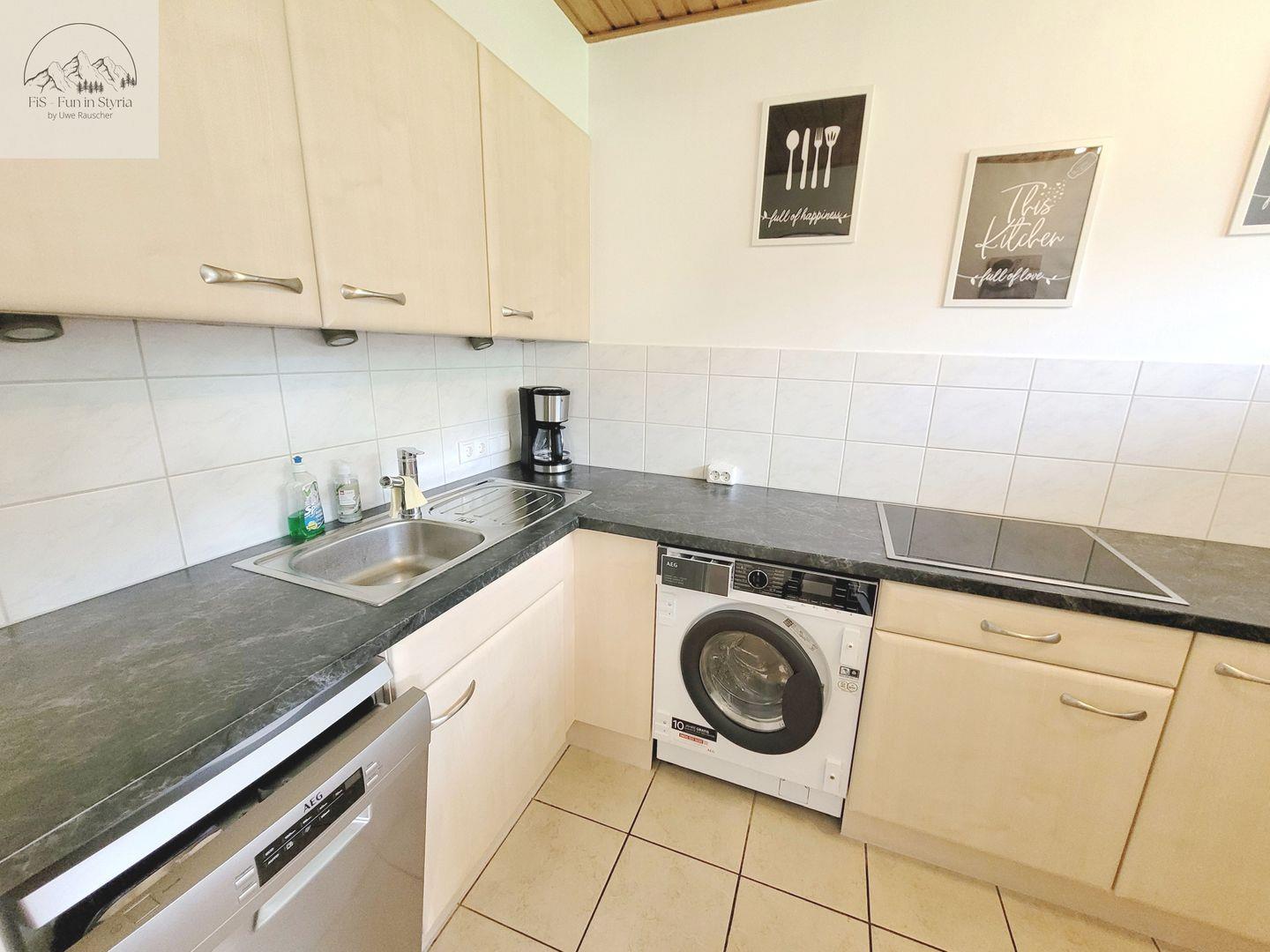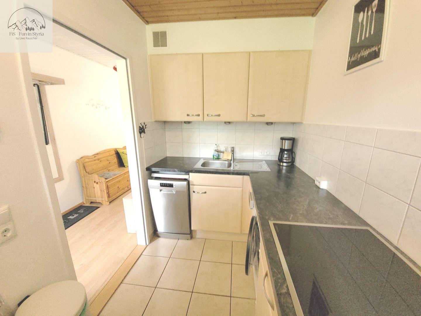 Die geschlossene Küche ist ausgestattet mit Herd (4-Platten, Elektro), Backofen, Mikrowelle, Kühlschrank mit Gefrierfach, Kaffeemaschine, Senseo-Espressomaschine, Toaster, Wasserkocher, Spülmaschine sowie umfassendem Geschirr und Besteck. Selbstverständlich sind auch Küchenutensilien, Geschirrhandtücher und sonstige Utensilien für die tägliche Selbstversorgung Teil der Ausstattung.