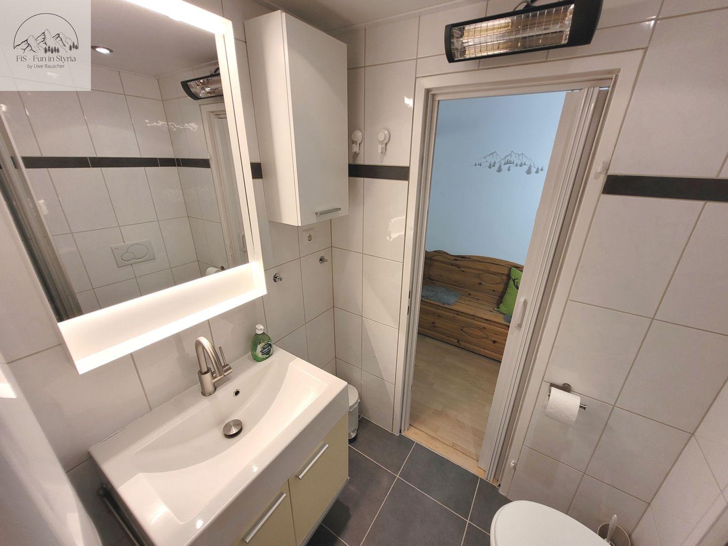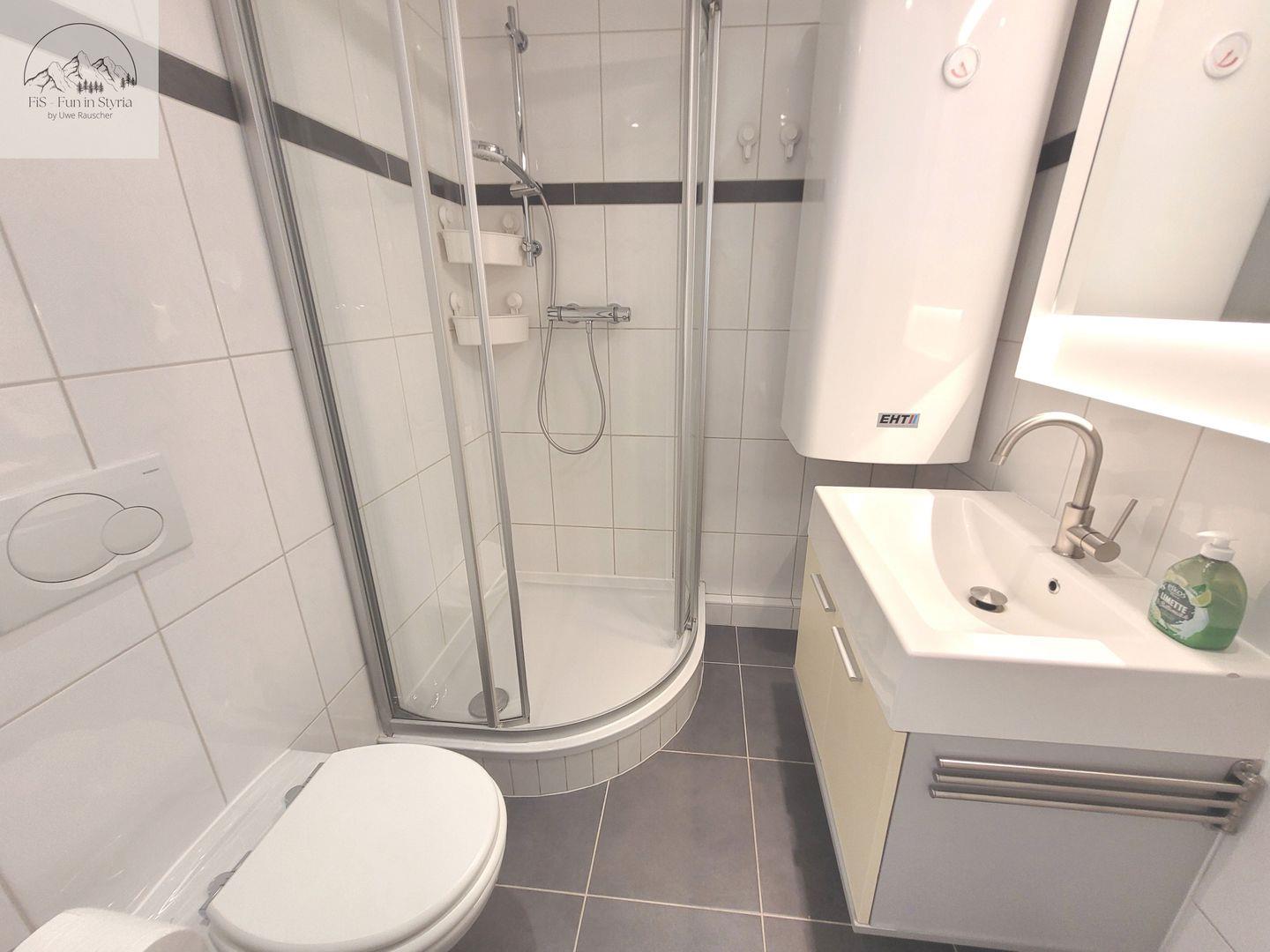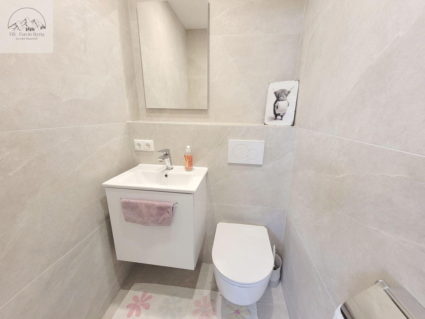 Im Badezimmer mit moderner Dusche (mit Wanne) liegen Handtücher, Seife, Shampoo und ein Haartrockner für Sie bereit. Zusätzlich verfügt das Apartment über zwei separate Gäste-WCs, einen praktischen Waschtisch mit Spiegel sowie eine Waschmaschine zur Eigennutzung. Staubsauger und weitere Pflegeutensilien ergänzen die Ausstattung.