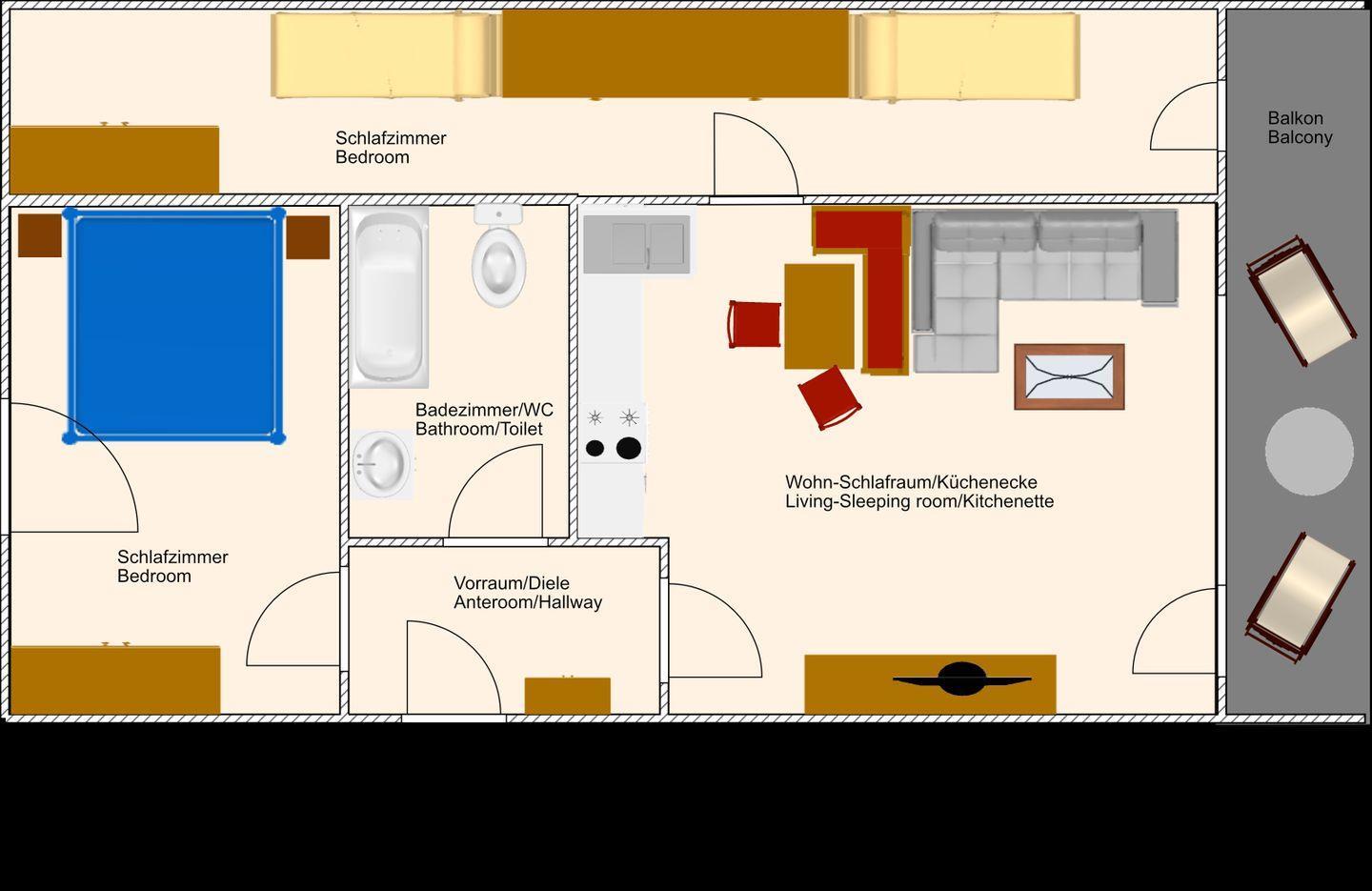 Das Apartment erstreckt sich über drei Zimmer, darunter ein Wohnzimmer mit Teppichboden, gemütlicher Sofaecke und digitalem TV mit internationalem Kanalangebot (44–55 Zoll, terrestrischer Anschluss). Die offene Küche ist dem Wohnzimmer zugeordnet und bietet eine umfangreiche Ausstattung: 4-Platten-Herd (Elektro), Backofen, Kühlschrank mit Gefrierfach, Spülmaschine, Kaffeemaschine, Wasserkocher, Toaster sowie sämtliche nötigen Küchenutensilien, Geschirr und Besteck. Der Esstisch eignet sich ideal für gemeinsame Mahlzeiten in geselliger Runde. Die Versorgung mit Bettwäsche, Handtüchern und Geschirrhandtüchern ist selbstverständlich, ein Wäscheservice sowie Wäscheständer und Staubsauger stehen zusätzlich zur Verfügung.