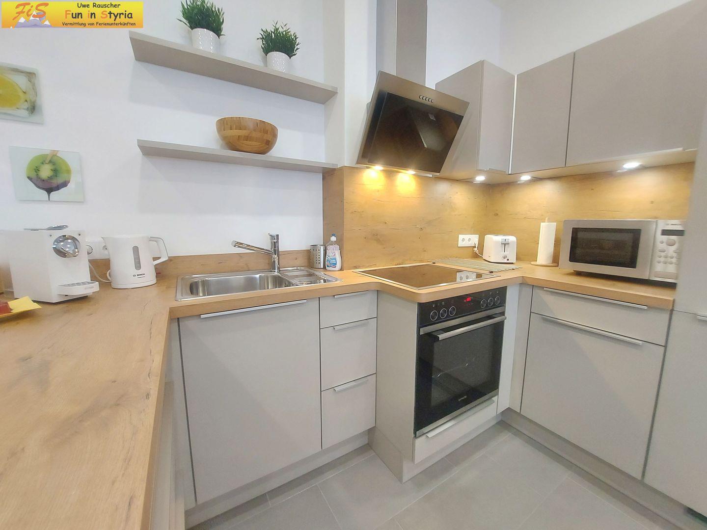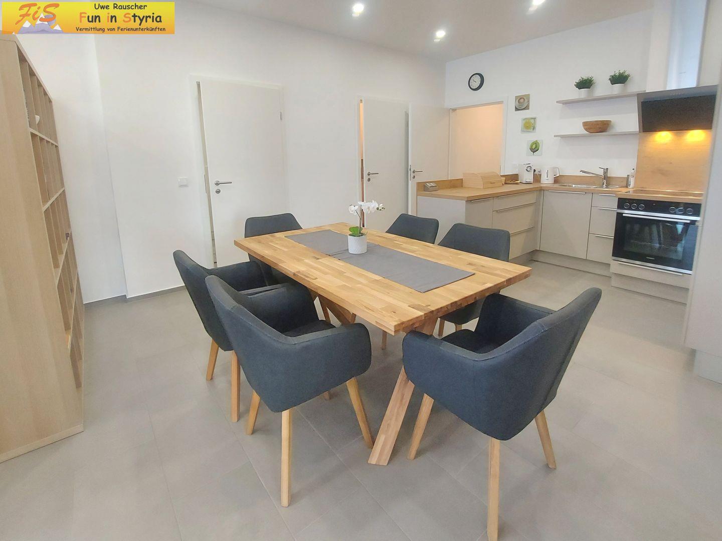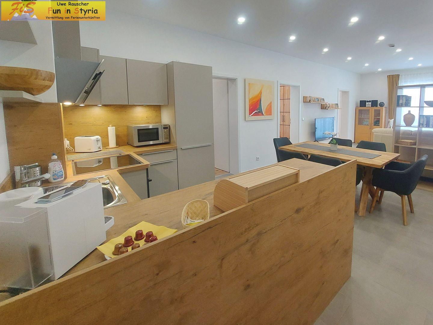 Die hochwertige Küche ist mit Backofen, 4-Plattenherd, Mikrowelle, Kühlschrank, separatem Gefrierschrank, Spülmaschine, Kaffeemaschine, Espressomaschine, Wasserkocher, Toaster und umfangreichem Koch- und Essgeschirr voll ausgestattet. Ein gemütliches Esszimmer, ein Esstisch sowie eine Sofaecke laden zu geselligen Momenten ein.