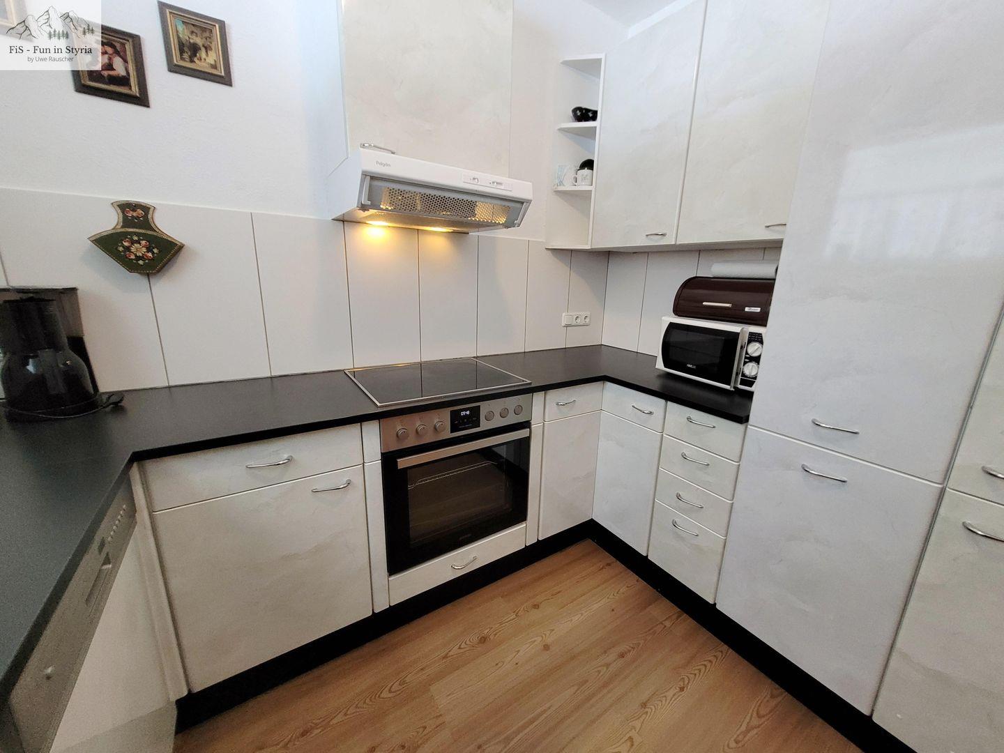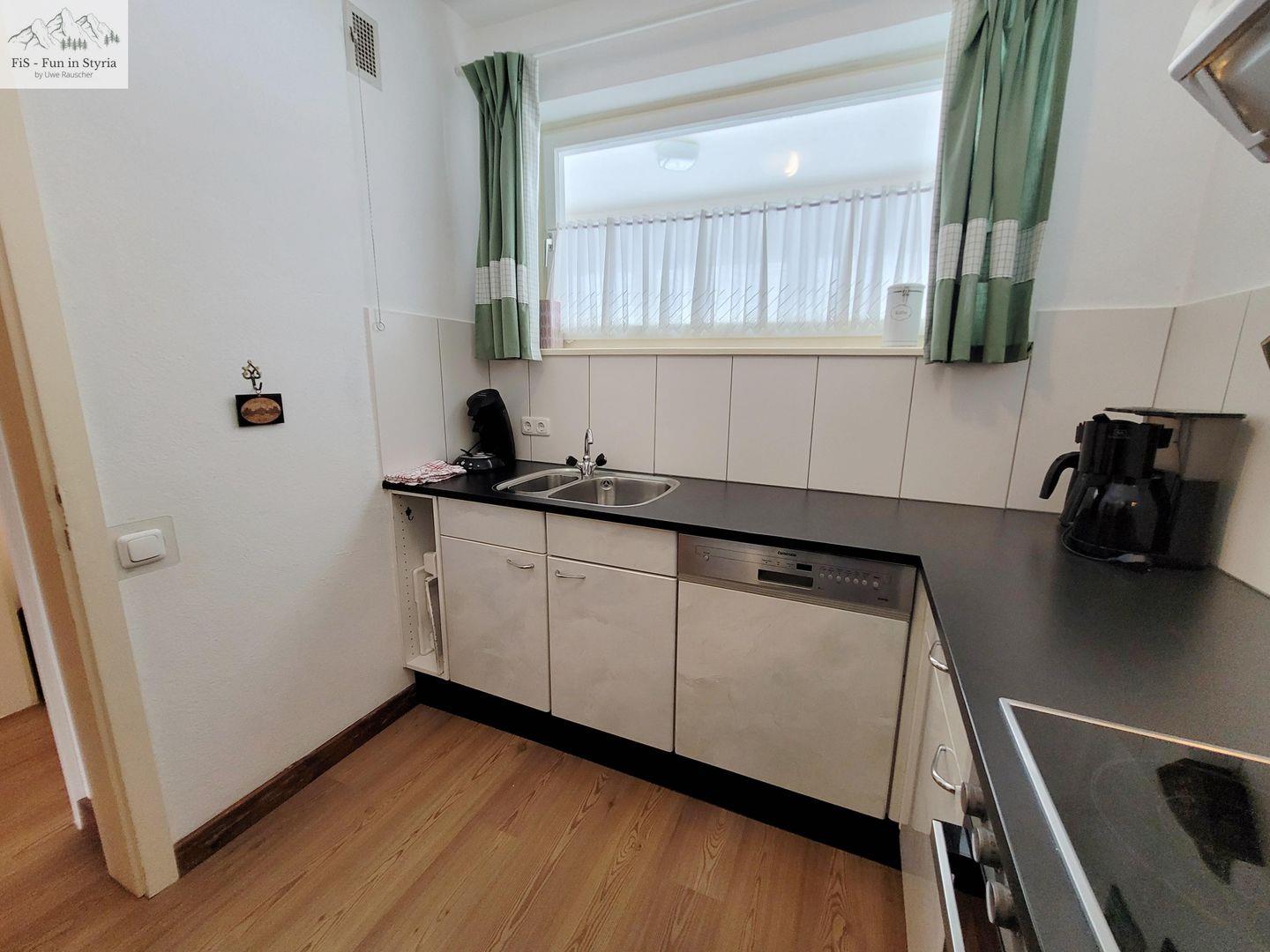Die abgeschlossene Küche ist voll ausgestattet und lässt keine Wünsche offen: Sie finden hier einen 4-Platten-Elektroherd, Backofen, Mikrowelle, Kühlschrank mit extra Gefrierschrank, Geschirrspülmaschine, Toaster, Kaffeemaschine, Wasserkocher, Küchenutensilien, Geschirrhandtücher sowie Geschirr und Besteck vor. Auch ein Abfalleimer und ein Wäscheständer sind vorhanden. Die Erstausstattung an Bettwäsche und Handtüchern ist inklusive.