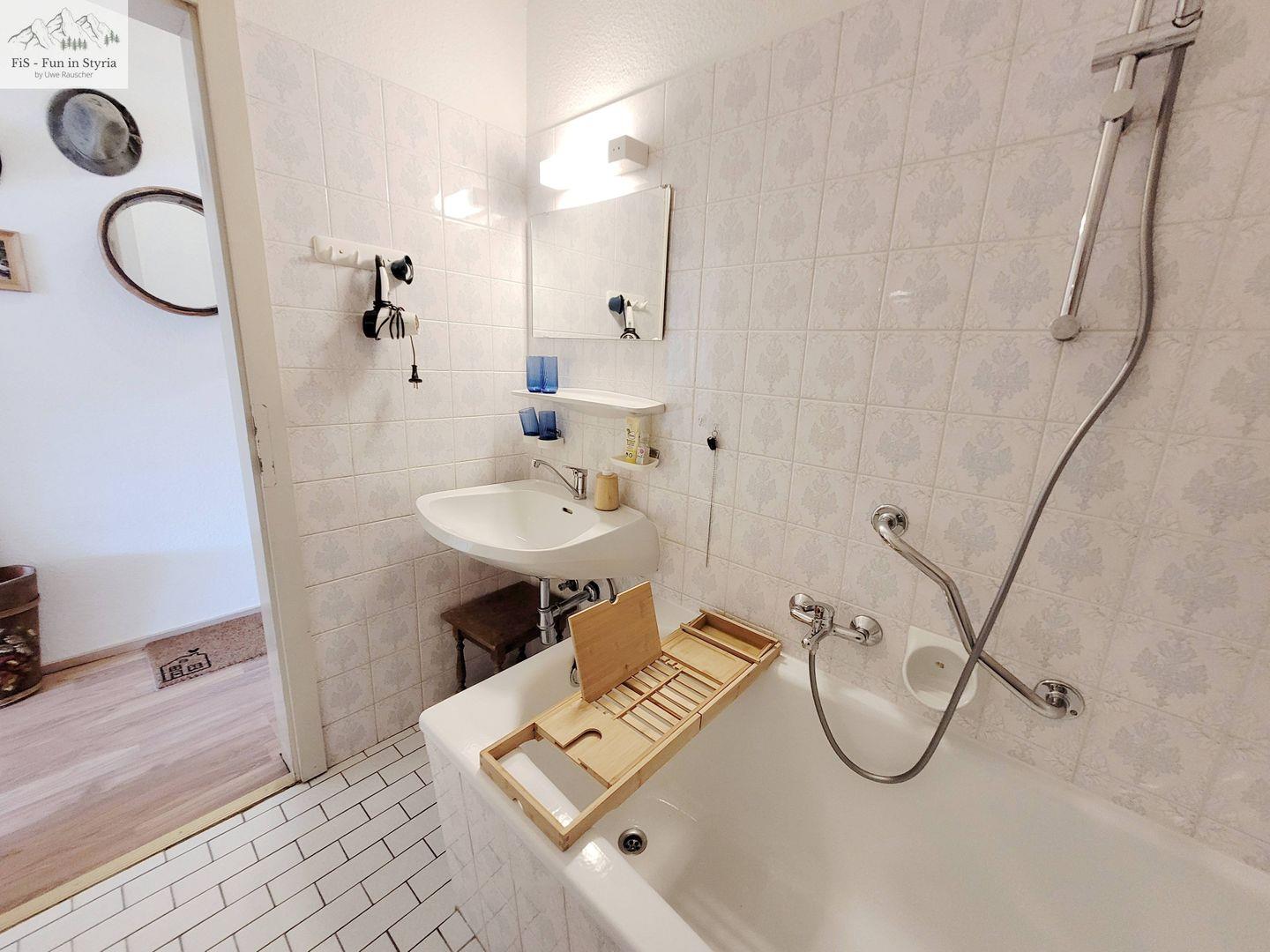Die Badezimmerausstattung umfasst eine Dusche mit Badewanne, ein WC, ein Waschbecken sowie Handtücher und einen Haartrockner, um Ihren Aufenthalt so angenehm wie möglich zu gestalten. Darüber hinaus sorgt ein Rauchmelder für zusätzliche Sicherheit.