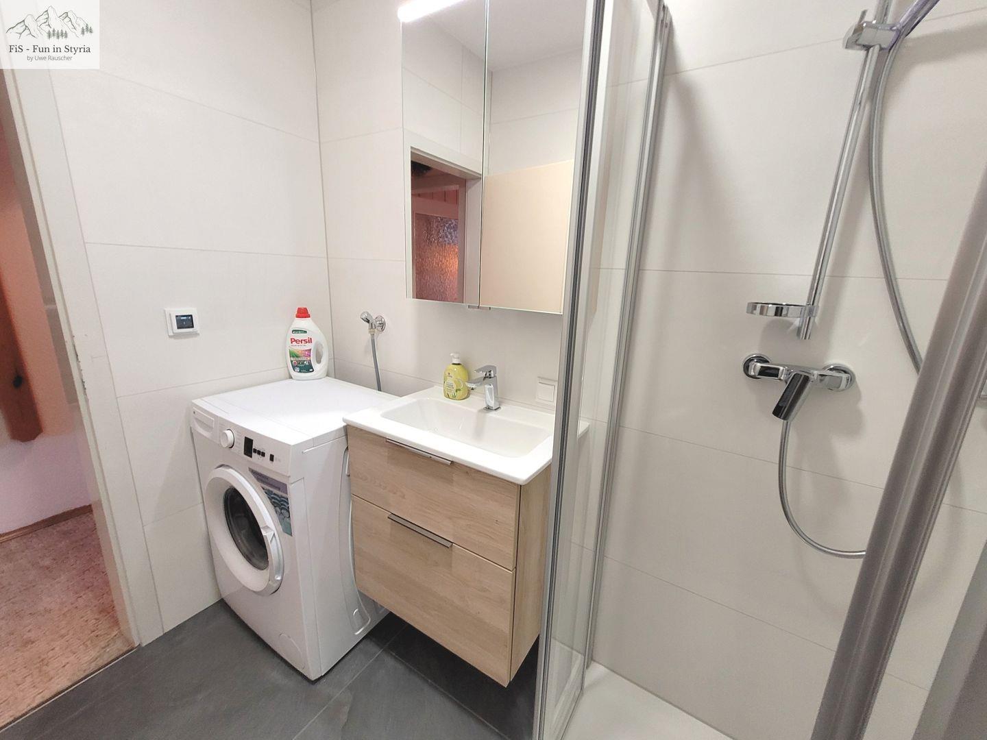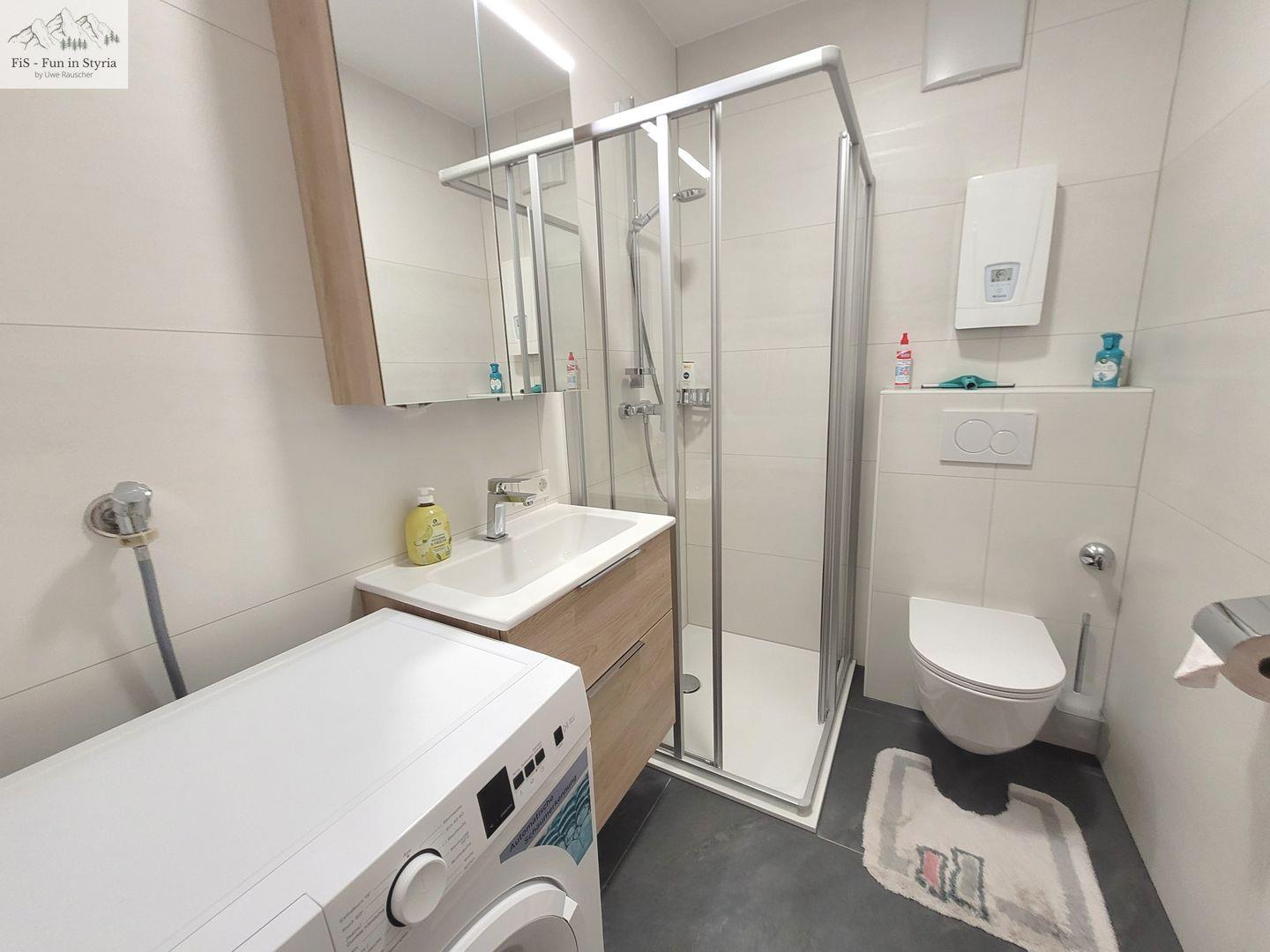 Das Badezimmer ist modern gestaltet und bietet eine bodengleiche Dusche, Waschbecken mit Spiegel, WC, Haartrockner, Badetücher und Handtücher. Ergänzend steht Ihnen eine Waschmaschine zur Eigennutzung bereit.