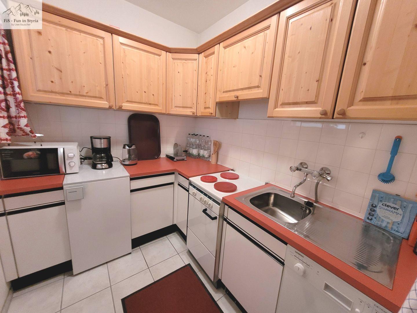 Die geschlossene Küche ist umfassend ausgestattet und lässt kaum Wünsche offen: 3-Platten-Herd, Backofen (elektrisch), Mikrowelle, Kühlschrank mit kleinem Gefrierfach, Geschirrspülmaschine, Kaffeemaschine, Wasserkocher, Küchenutensilien, Geschirr und Besteck sowie Geschirrhandtücher stehen Ihnen zur Verfügung.