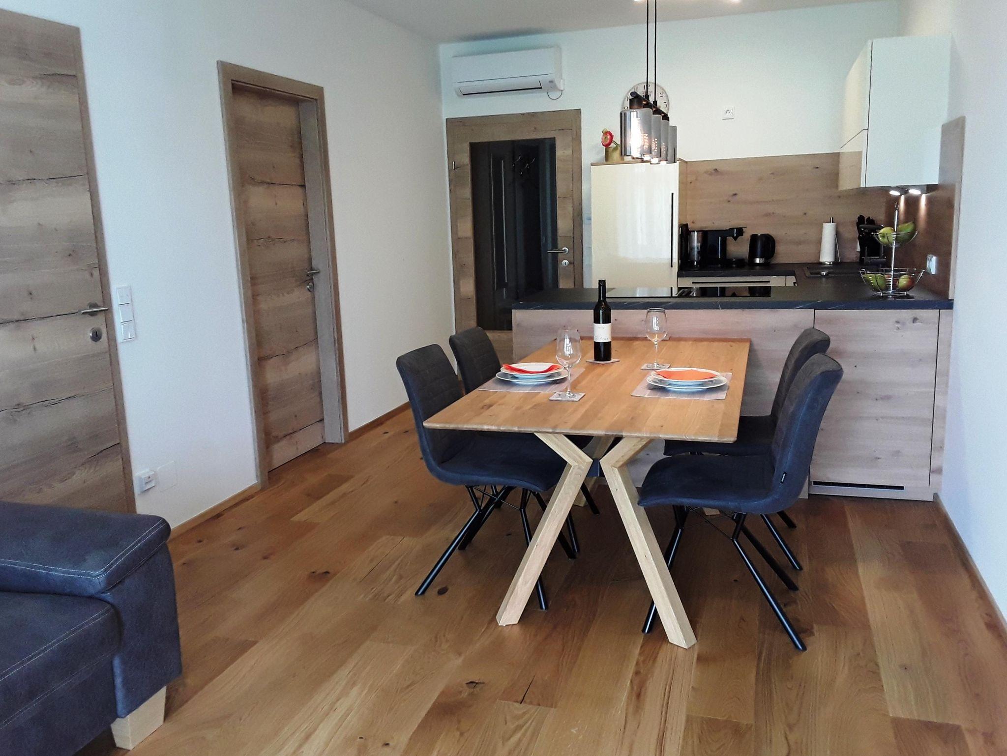 Als nächstes gelangt man in die Wohnküche welche mit allen nötigen Geräten und Zubehör ausgestattet ist, um den Urlaub zu genießen. Im Anschlußan die Küche befindet sich der Esstisch mit und im Anschluß der gemütliche Wohnteil mit großem 55 Fernseher. Von hier gelangt man über eine Schiebtüre auf die großzügige Terrasse.