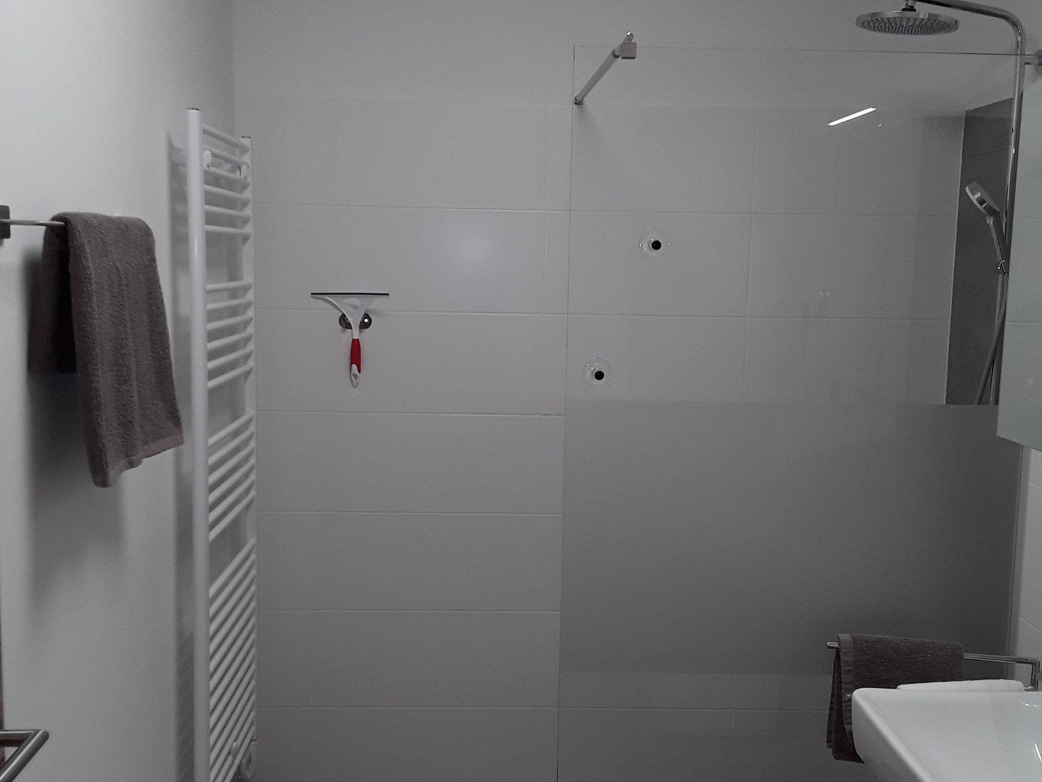 Vom Wohnraum aus gelangt man in das sehr geräumige Badezimmer, welches mit einer Dusche, Waschtisch, Handtuchtrockner ausgestattet ist. Man gelangt über eine Verbindungstüre in das Schlafzimmer.
