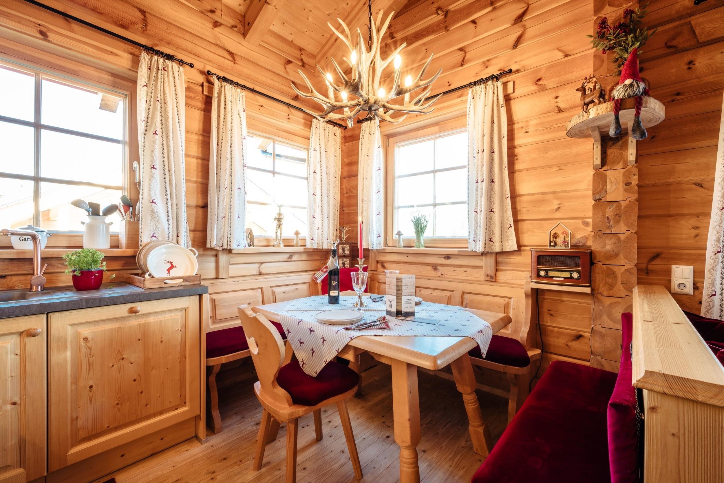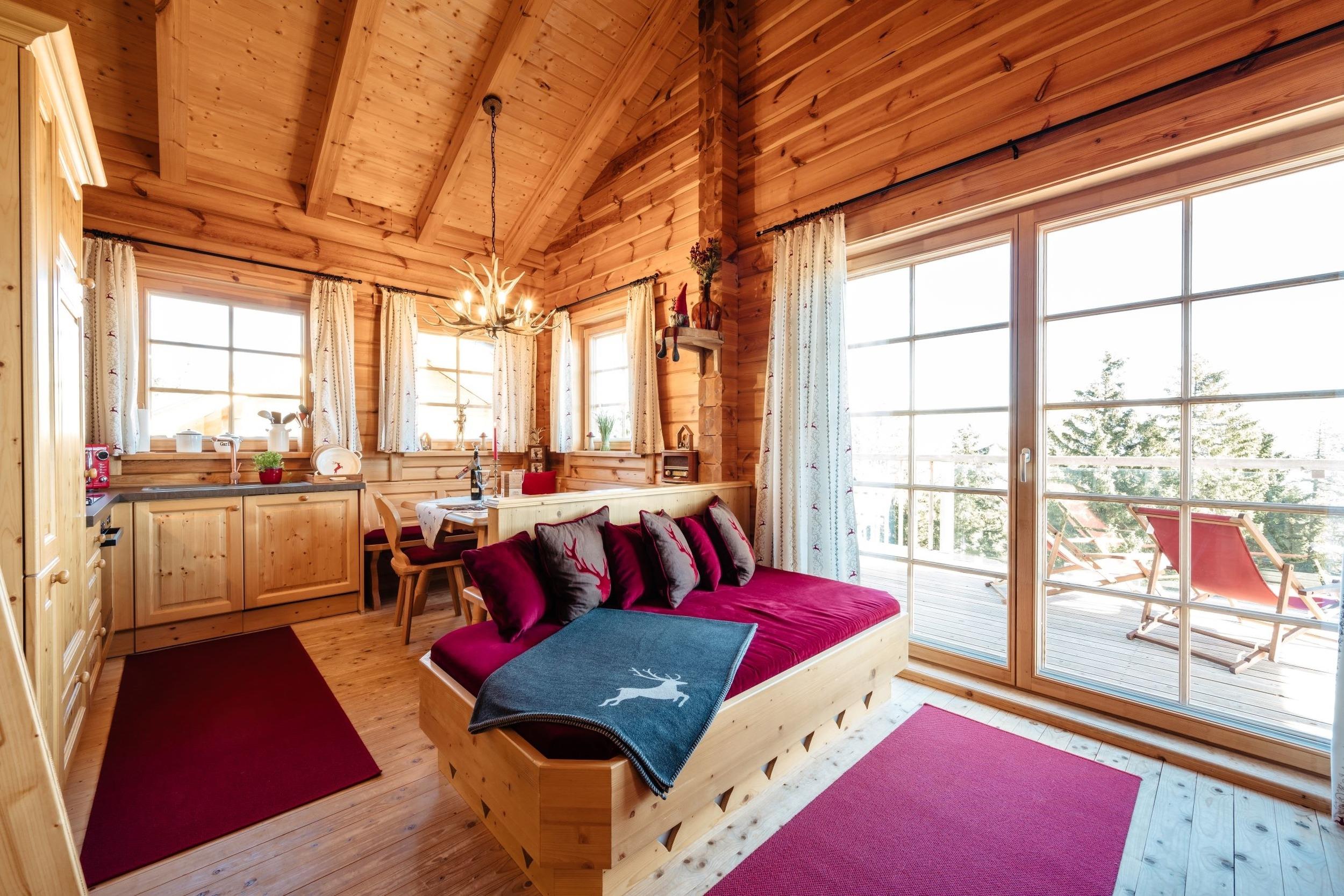 Die Wohnküche ist gemütlich und sehr komfortabel eingerichtet. Nach einem tollen Tag die eigene Panorama-Sauna genießen und zum Abschalten noch ein Glas Wein im Whirlpool! Weiters bietet die Feuerstelle eine Möglichkeit zum Gemeinsamen Zusammensitzen. Bei uns steht dem perfekten und erholsamen Urlaub auf der Alm Nichts im Weg. Tiere sind leider nicht erlaubt!