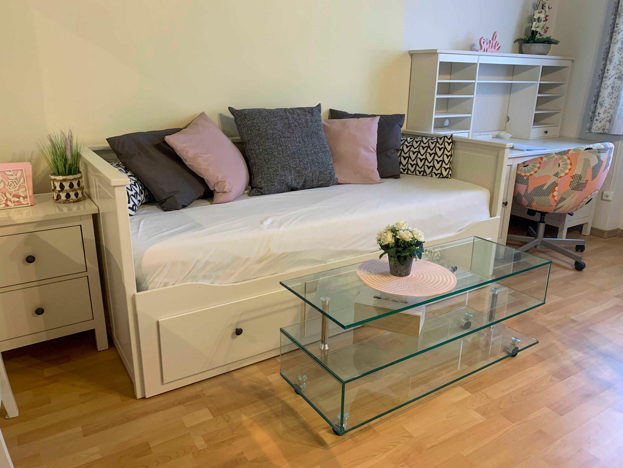 Der Wohnbereich ist mit einem gemütlichen, ausziehbaren Tagesbett ausgestattet. Dieses kann entweder als Einzelbett (80x200) genutzt werden oder als Doppelbett (160x200), wenn es ausgezogen ist.
