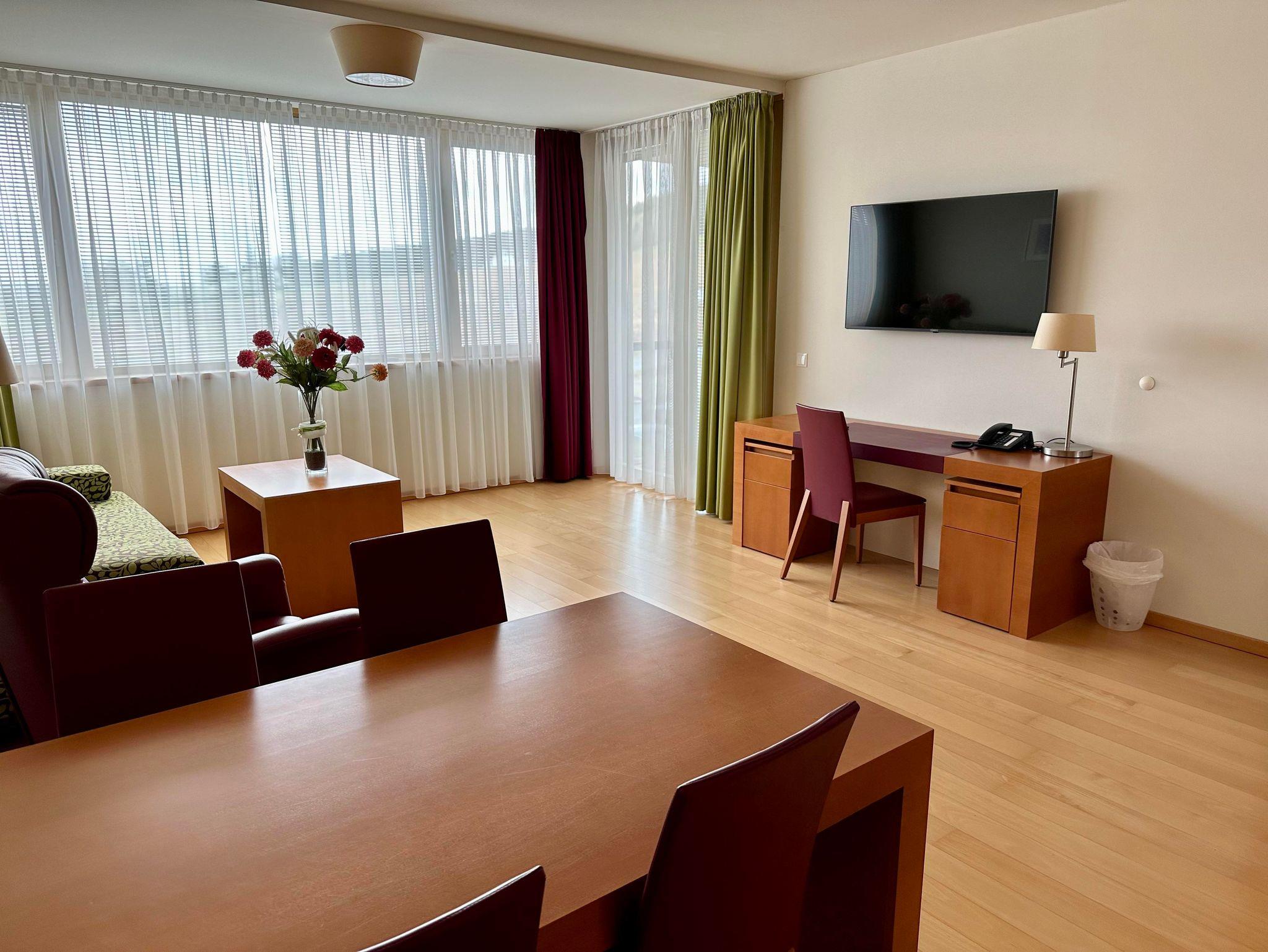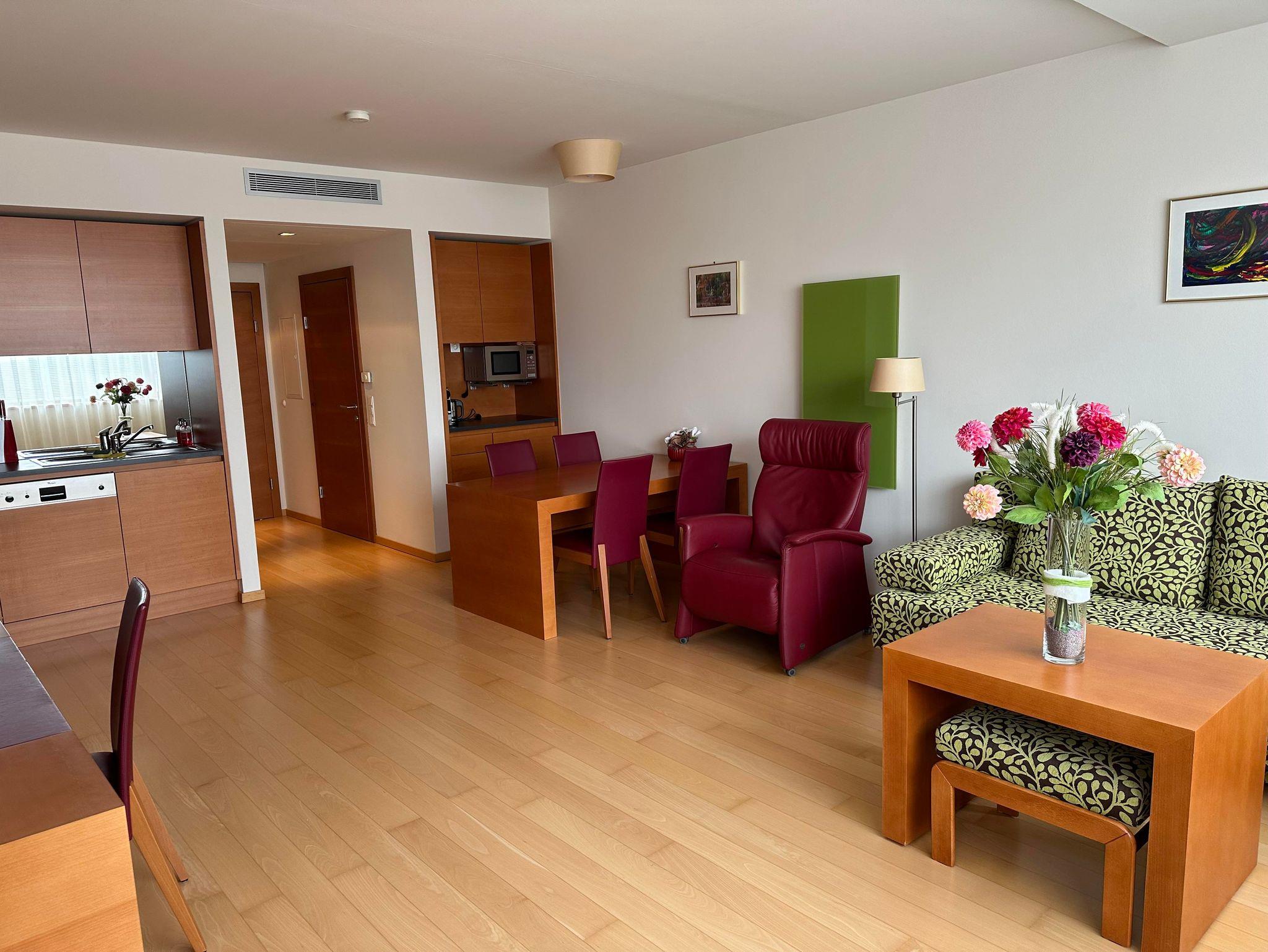 Das 60 qm große Apartment befindet sich mitten im grünen Herzen Österreichs, Bad Waltersdorf in der Süd-Ost-Steiermark. Es verfügt über einen direkten Zugang (beheizter Bademantelgang) zum ****S Spa Resort Styria. Der Eintritt in den Spa-Bereich im Wert von 59€ p.P. und Tag ist im Preis inkludiert!