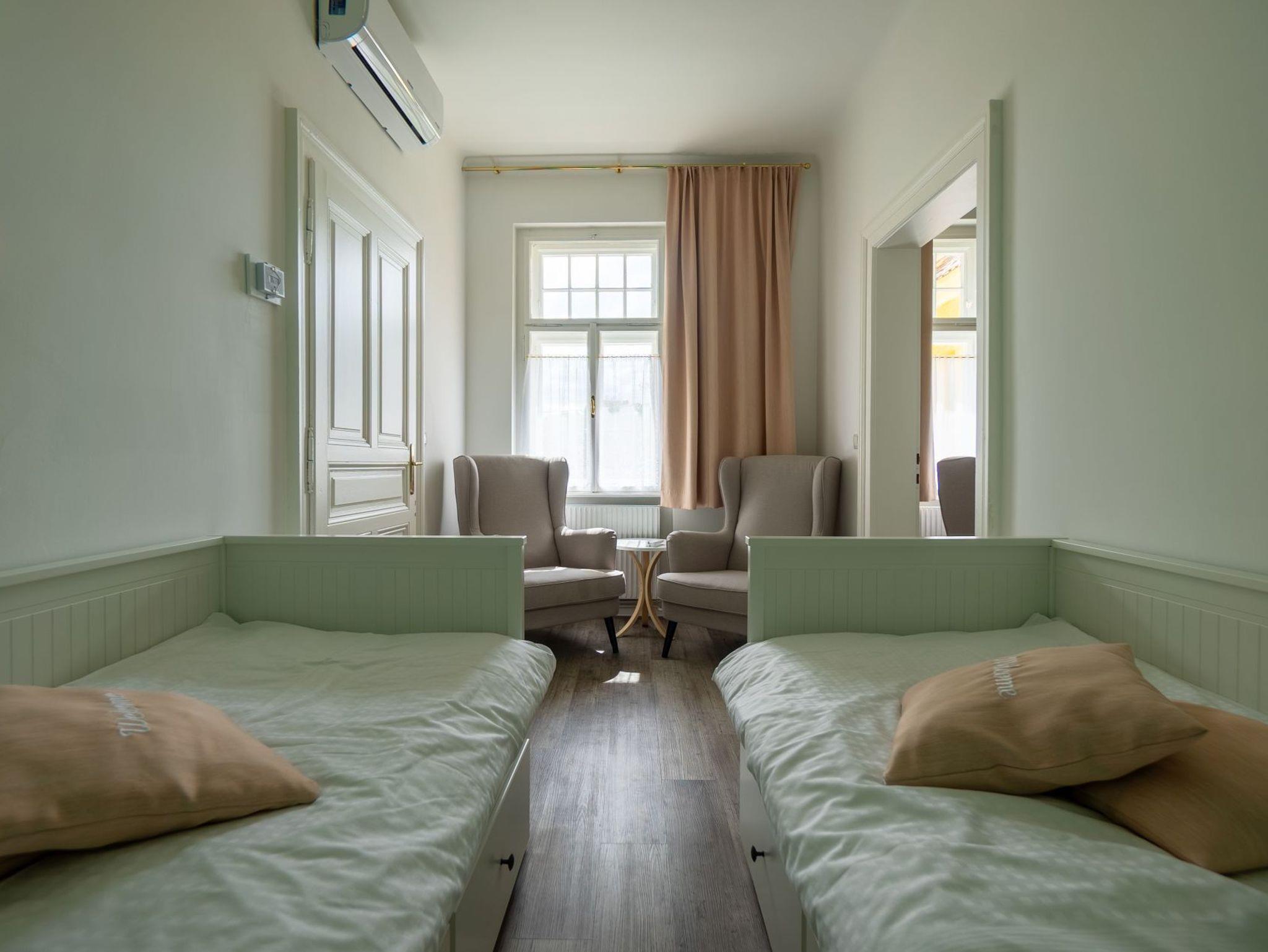 Das charmante Apartment Elsa im ersten Obergeschoss des Albizia Apartmenthauses verbindet gemütlichen Wohnkomfort mit dem besonderen Flair einer klassischen Pawlatsche (Außengang) und bietet auf ca. 49?m² ausreichend Platz für Familien, die separate Schlafbereiche schätzen. Eine großzügige Küche lädt zum gemeinsamen Kochen ein, während das Schlafzimmer mit zwei Einzelbetten und das direkt angeschlossene Elternschlafzimmer mit Doppelbett für erholsame Nächte sorgen – ideal für alle, die Funktionalität und familiäre Gemütlichkeit in stilvollem Ambiente genießen möchten.
