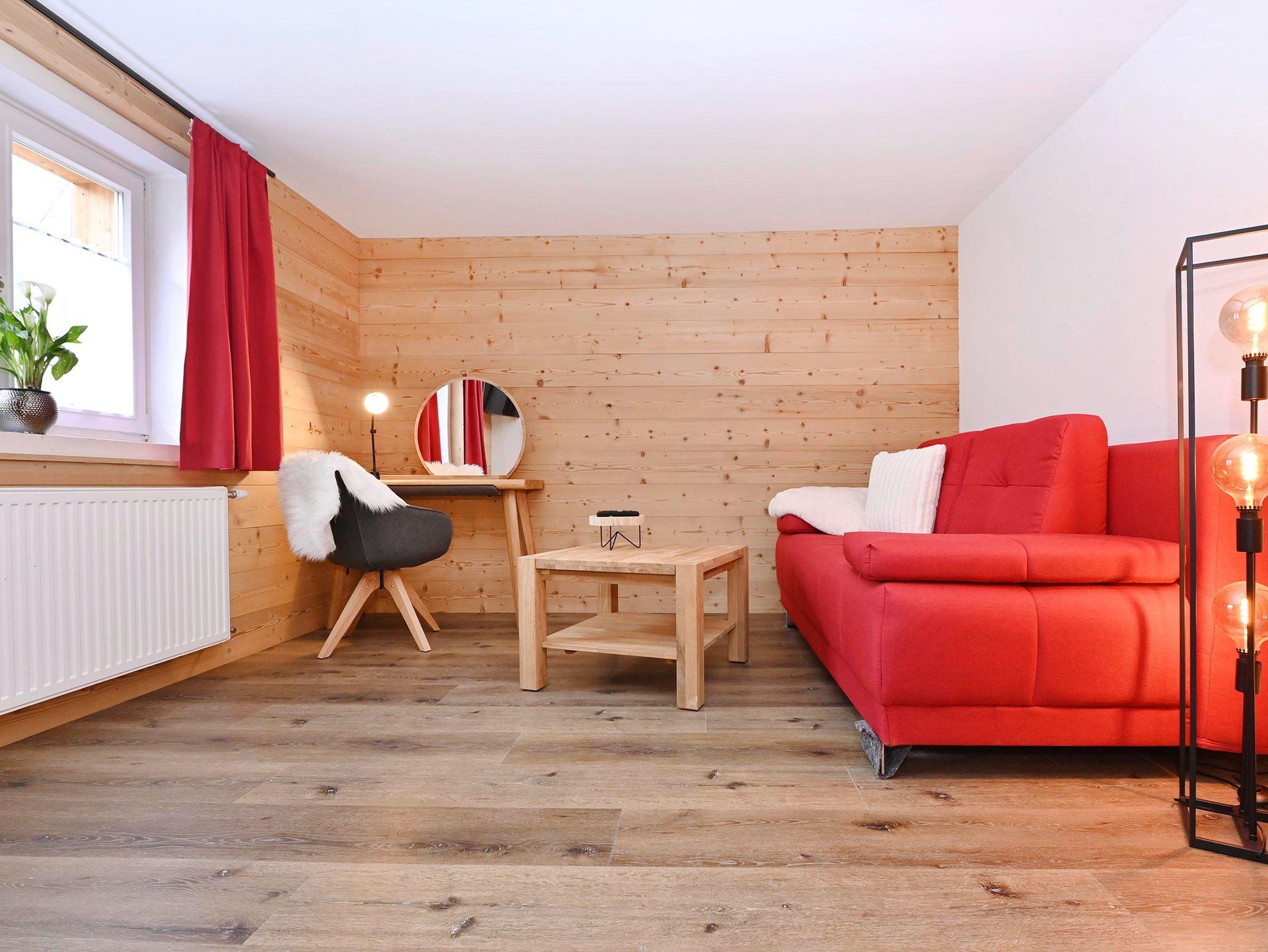 Wohnbereich: ausziehbares Sofa (Boxsprinbett), Schminkbereich, Sat TV