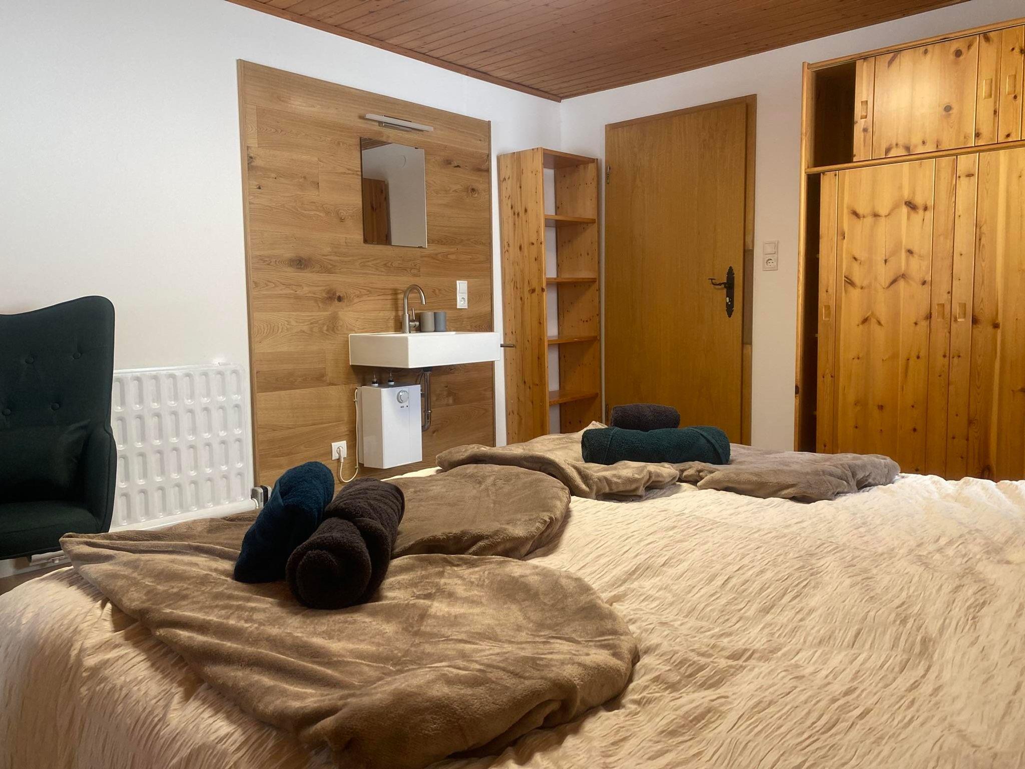 Auf 200 m² Wohnfläche verteilen sich 5 Doppelzimmer, Duschen und separate WC's, Wohn/Essbereich, Fernsehzimmer, Seminarraum, und eine vollausgestattete Küche mit Essplatz. Als kleines Plus, gemütliche Lesestühle mit kleiner Bibliothek und einer Terrasse mit Grill. Bettwäsche sowie Handtücher stehen unseren Gästen zur Verfügung. Im Keller können Fahrräder oder Skier untergebracht werden.