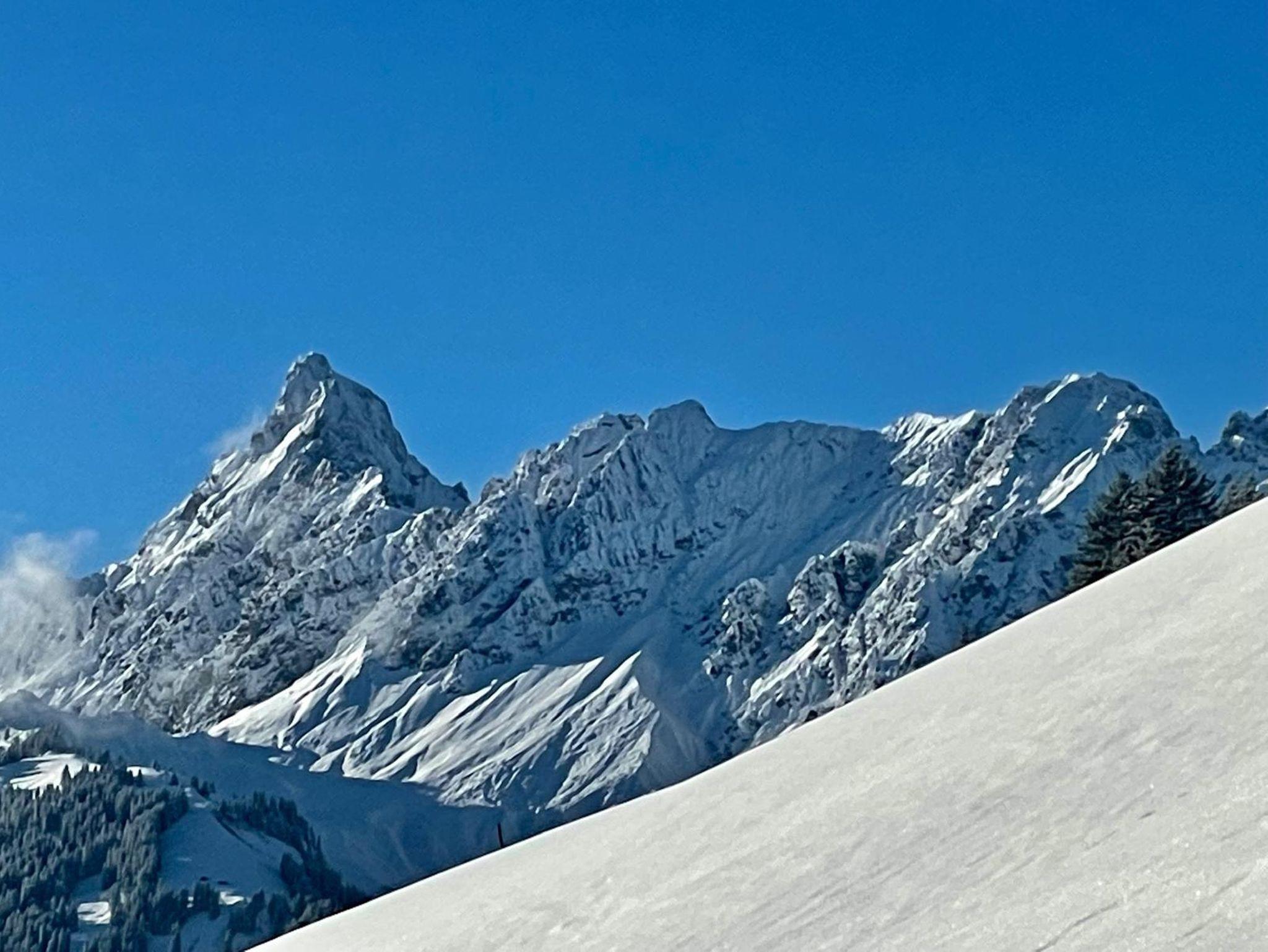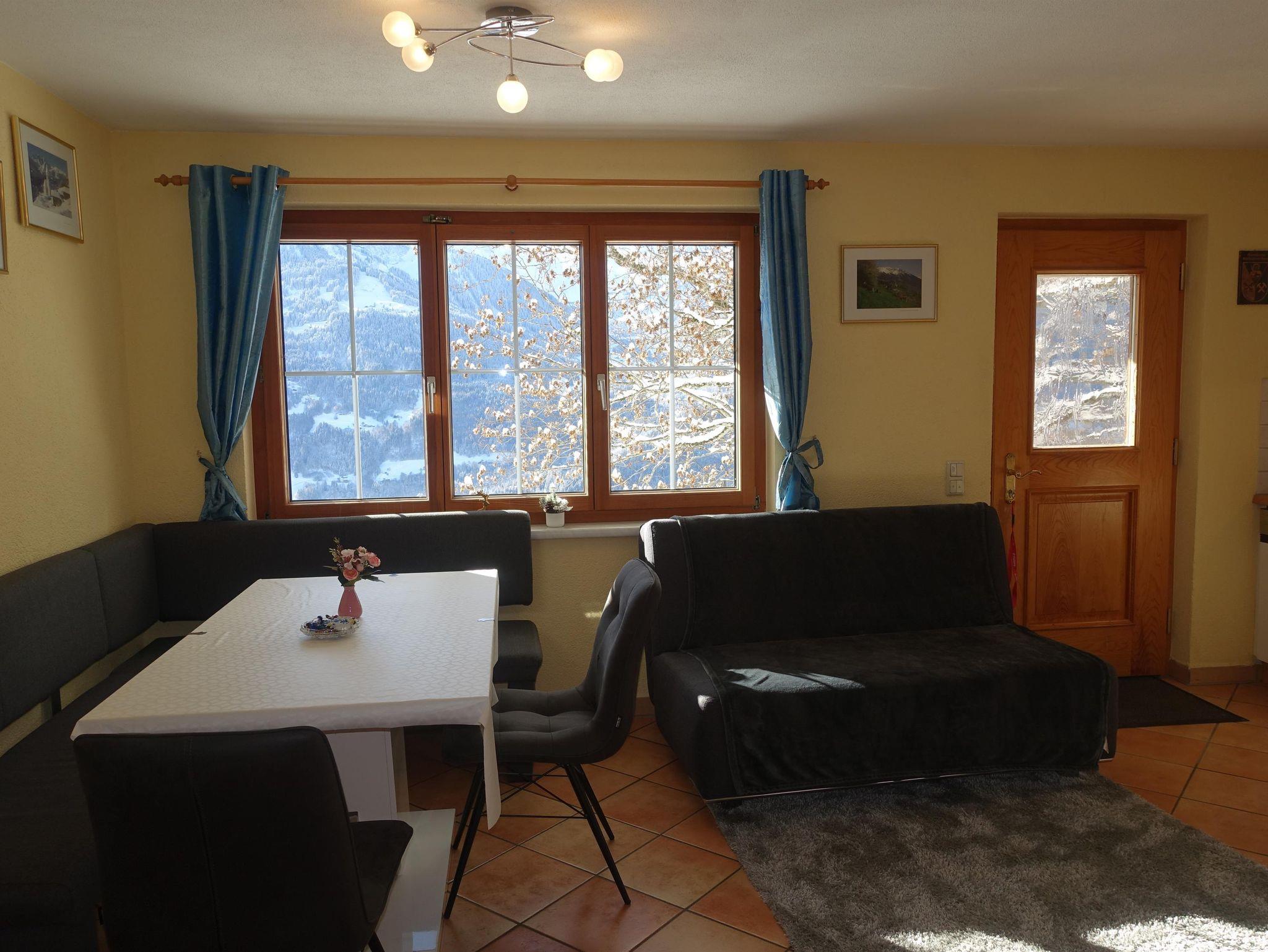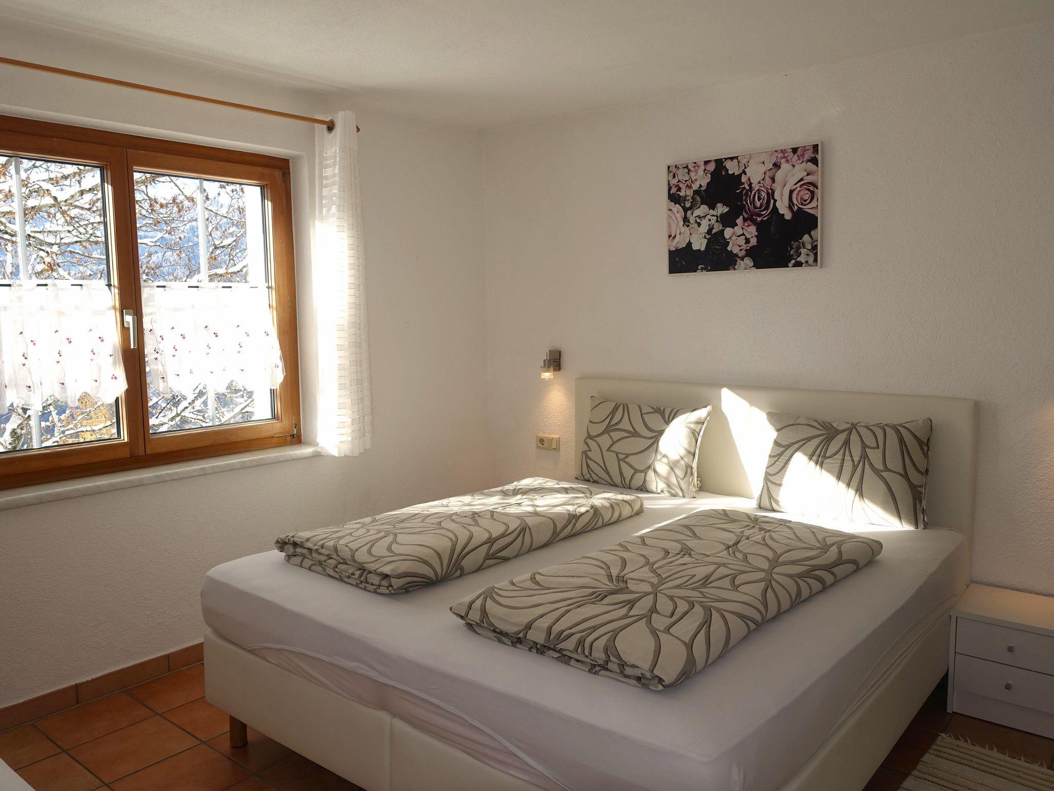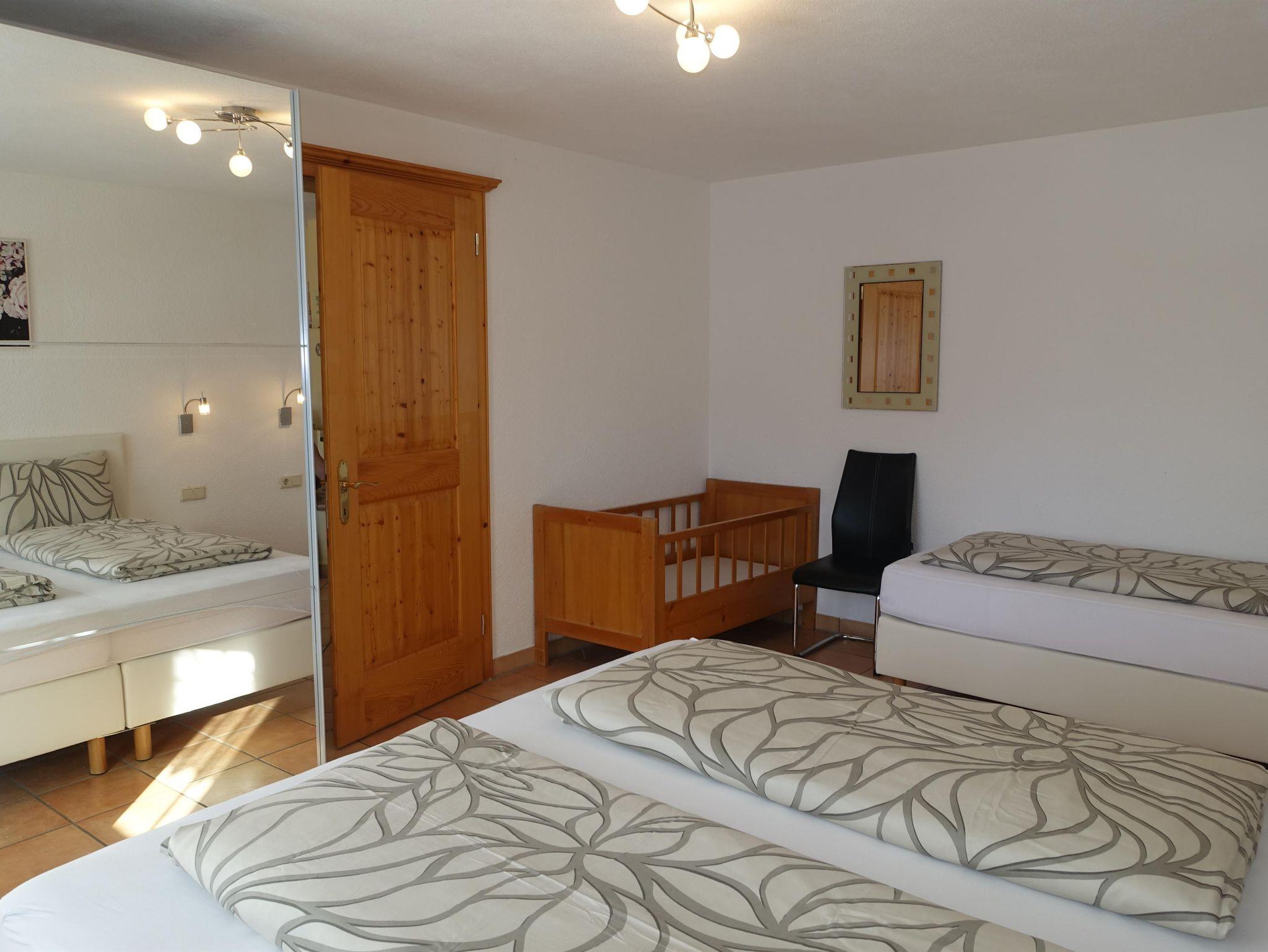 Wohnzimmer (TV (Satellit), offener Kamin), offene Küche (Backofen, Mikrowelle), 2 Schlafzimmer (Einzelbett, Doppelbett), Badezimmer (Dusche), Abstellraum. Fussbodenheizung, Terrasse, Kinderbett, Hochstuhl, Ski-Raum.