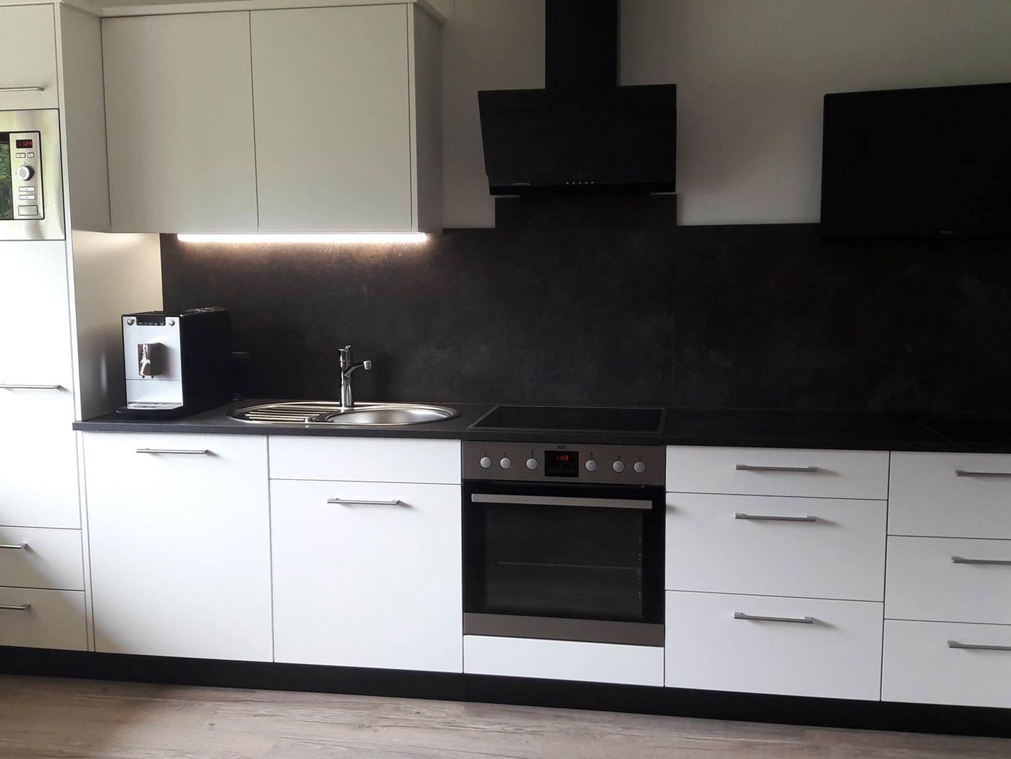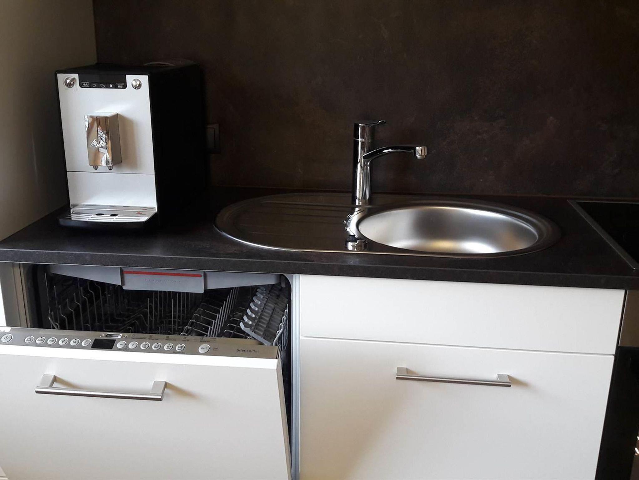 - 1 komplett ausgestattete Wohnküche u.a. mit Sofa, Geschirrspüler, E-Herd, Kühlschrank mit TK-Fach, Mikrowelle, Kaffeevollautomat, Toaster, Wasserkocher usw.